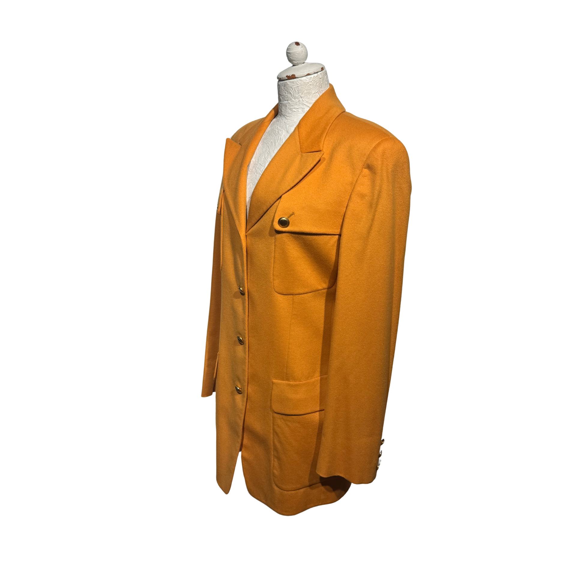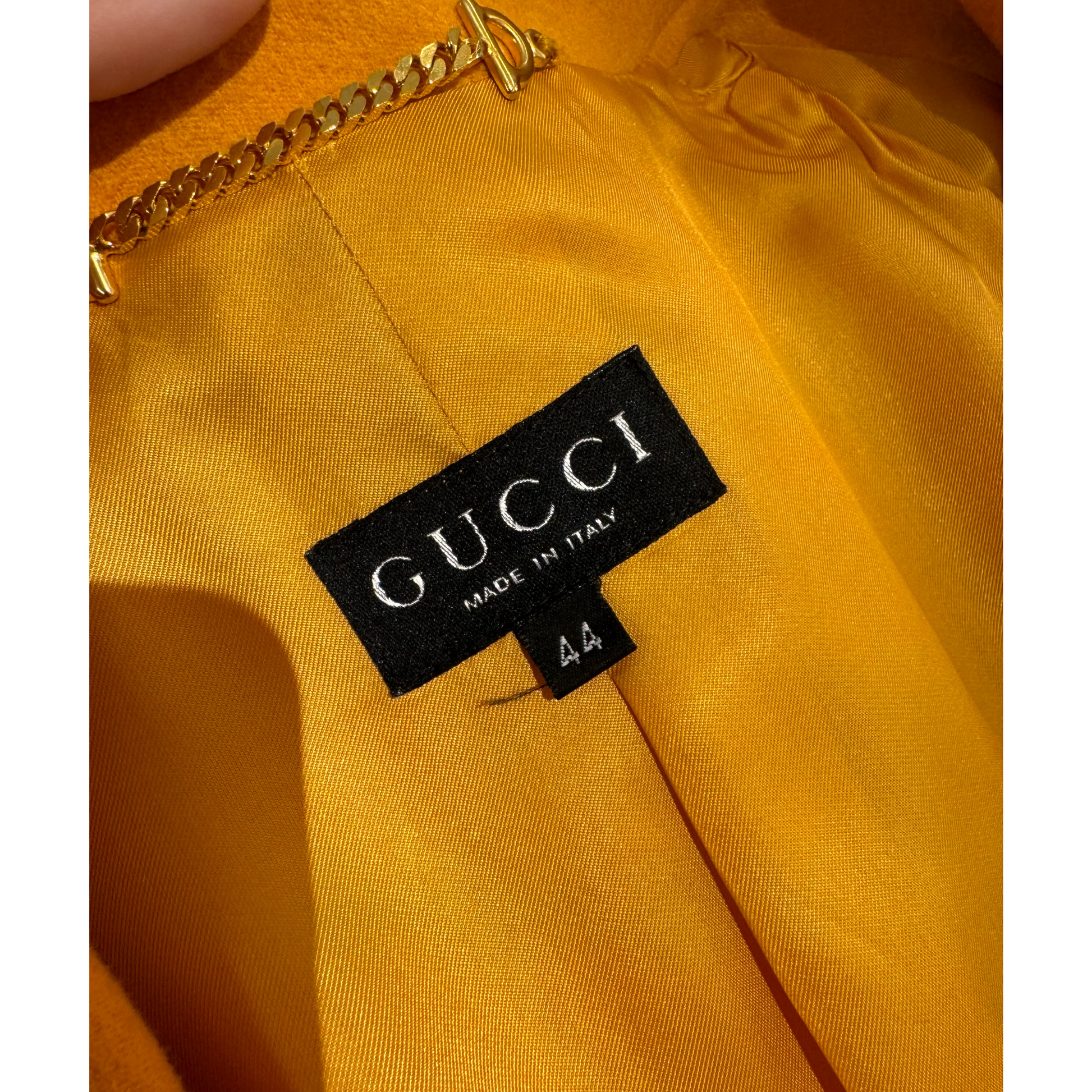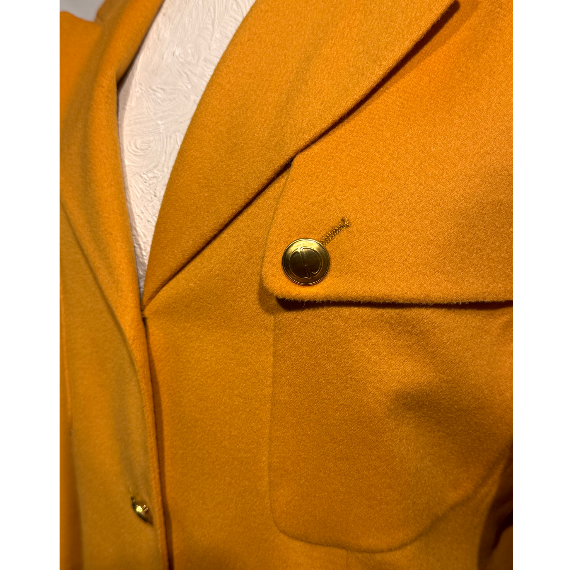 Giacca vintage di Gucci , 70%lana e 30% cashmere, color ocra. Impreziosita da bottoni gioiello dorati con logo. Tasche laterali e taschine sul petto. Spalle rinforzate.