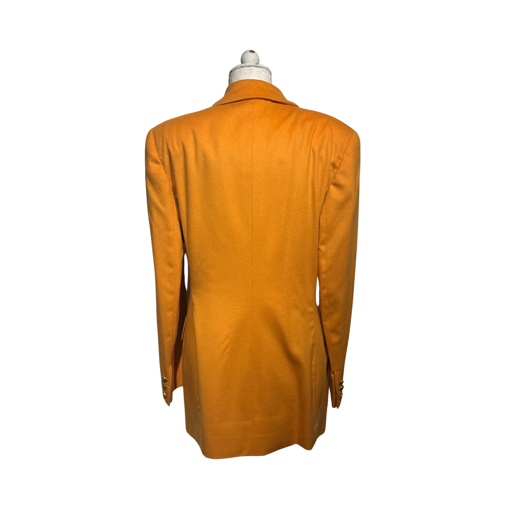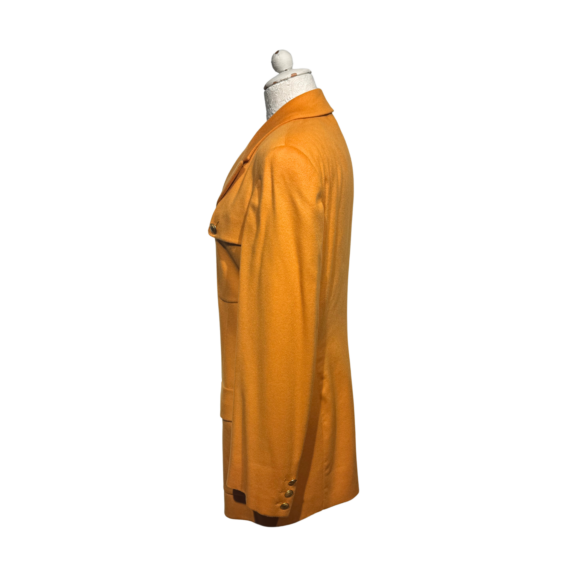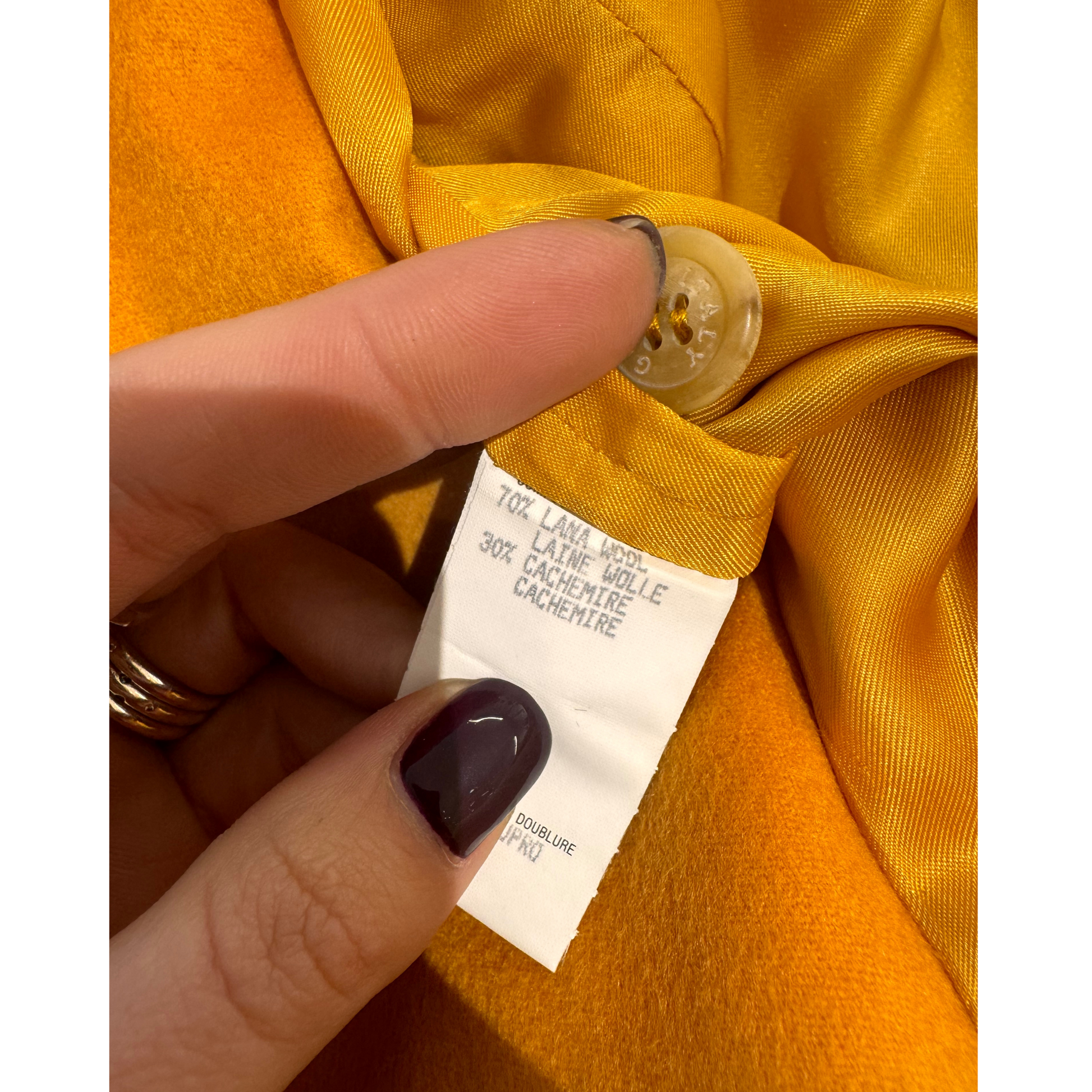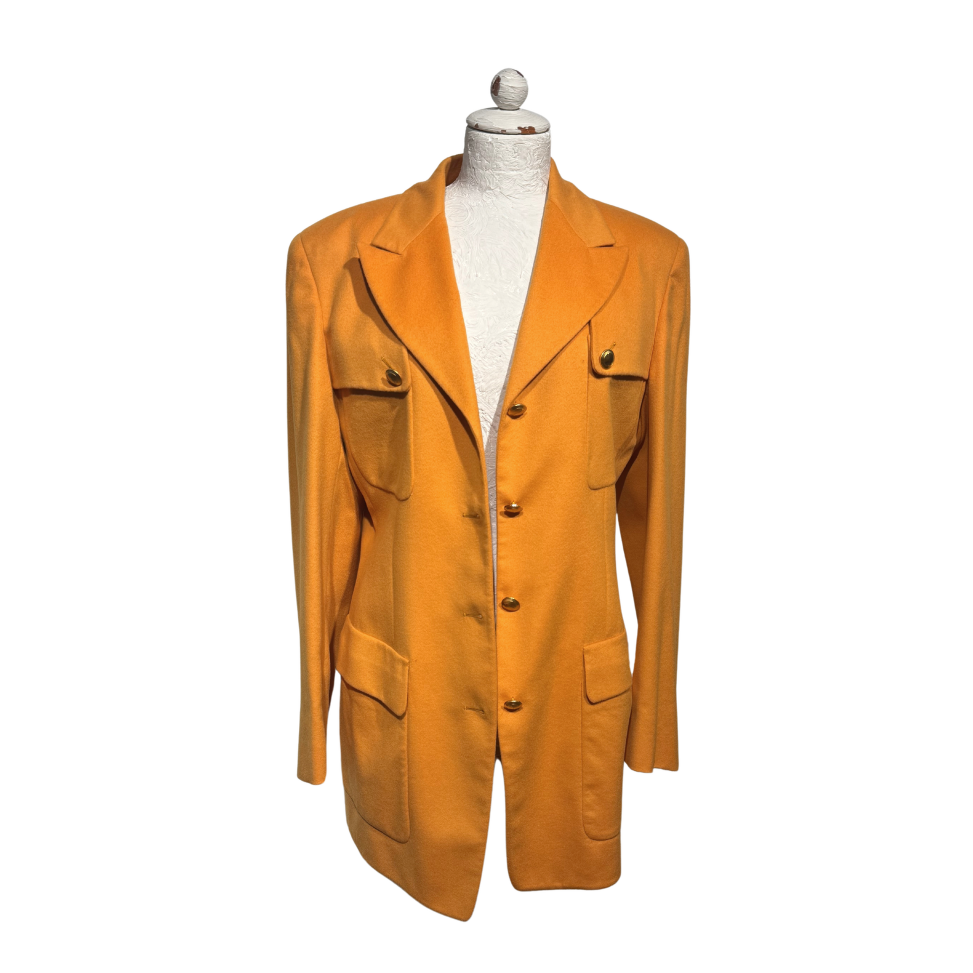 Giacca vintage di Gucci , 70%lana e 30% cashmere, color ocra. Impreziosita da bottoni gioiello dorati con logo. Tasche laterali e taschine sul petto. Spalle rinforzate.
