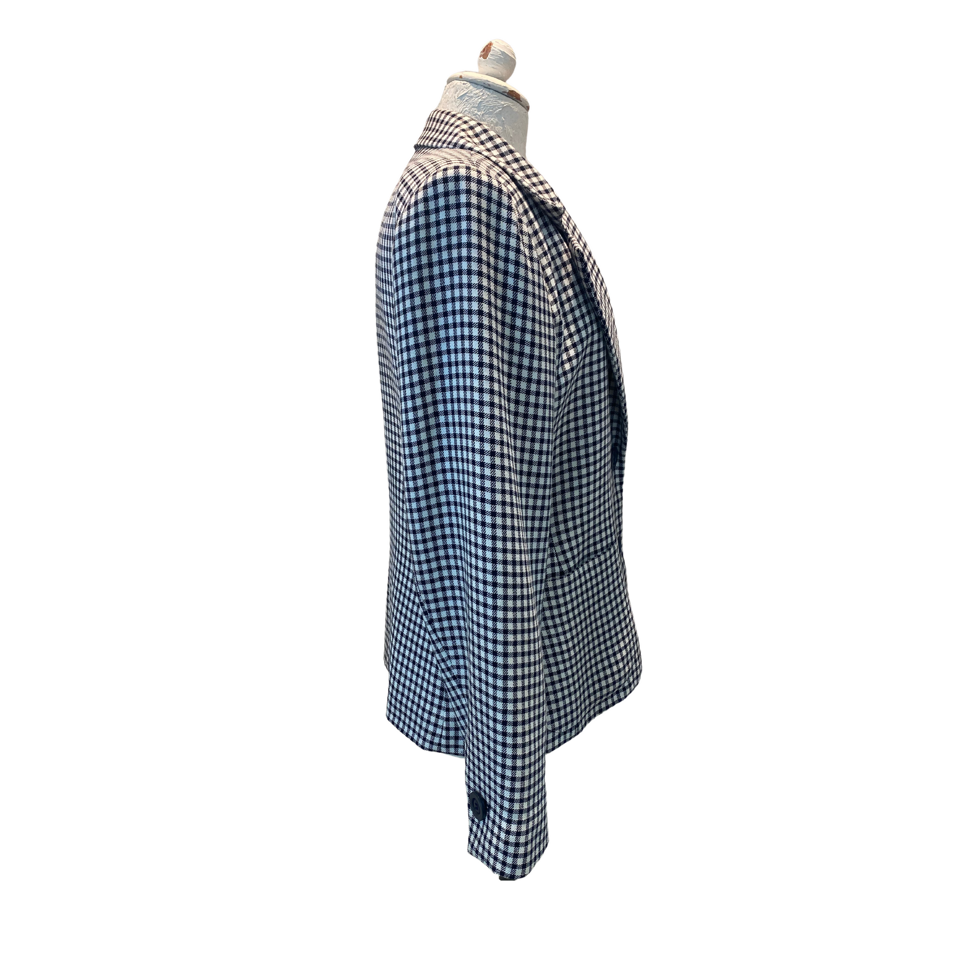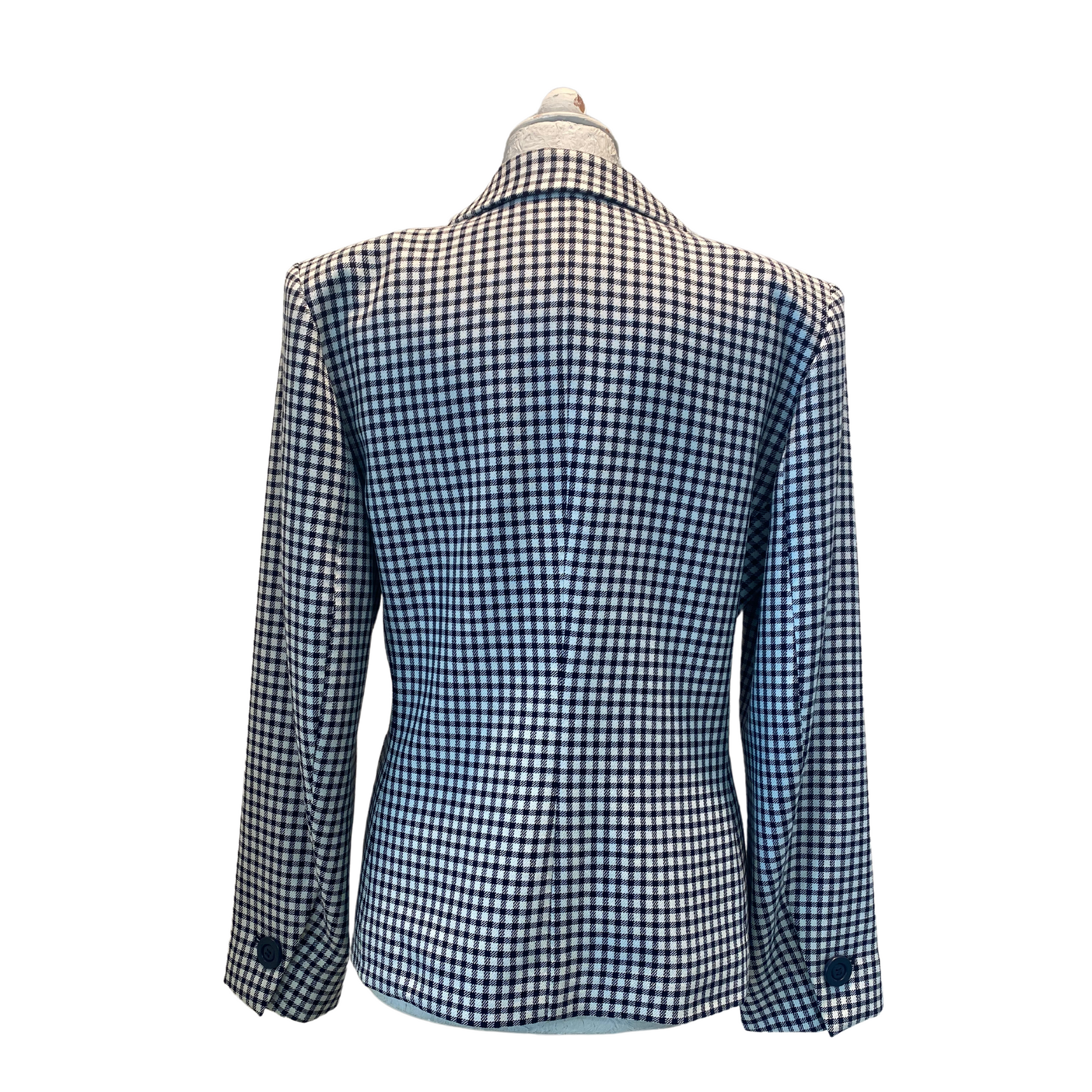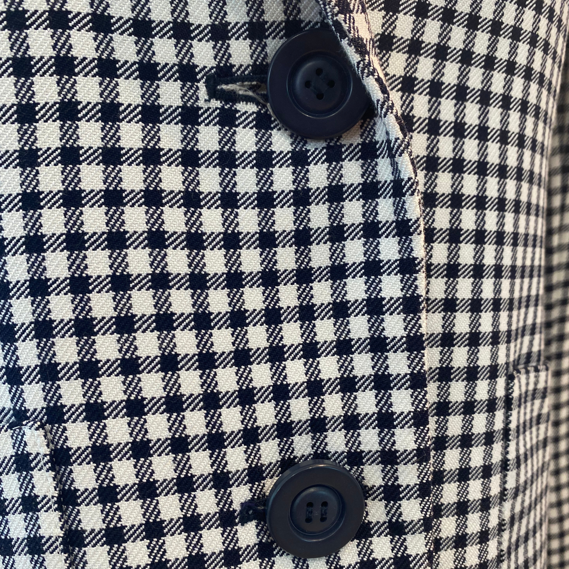Giacca vintage a quadretti bianca e blu in viscosa e lana. Interno blu in acetato e rayon. Apertura con due bottoni blu . Sulla parte frontale sono presenti due tasche e un taschino. Spalle con imbottitura.