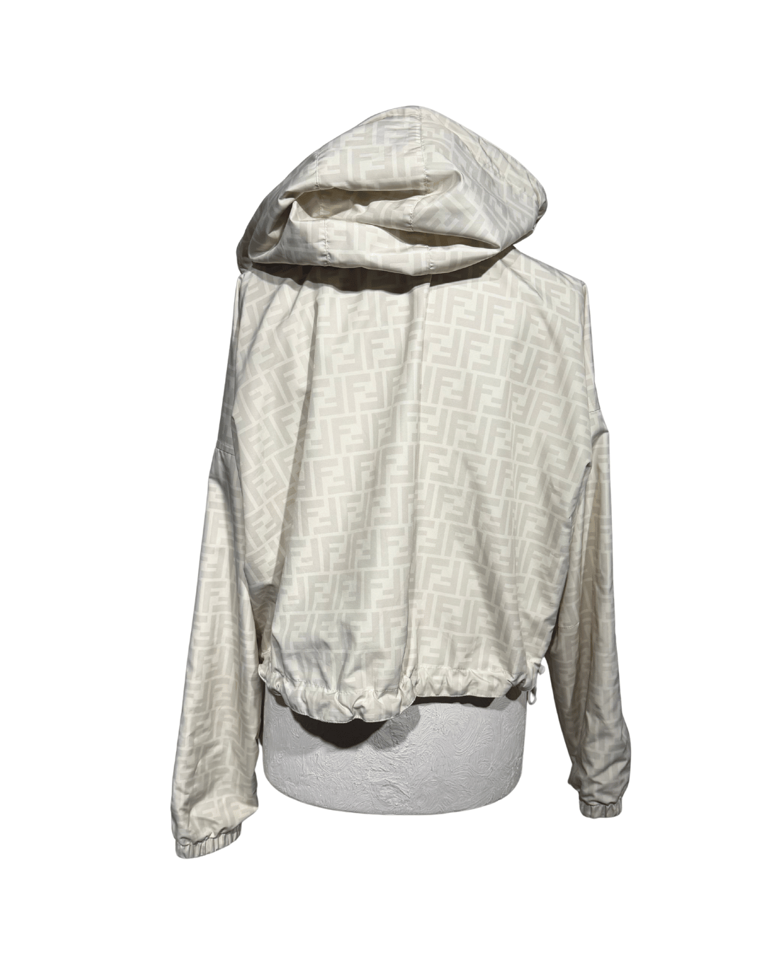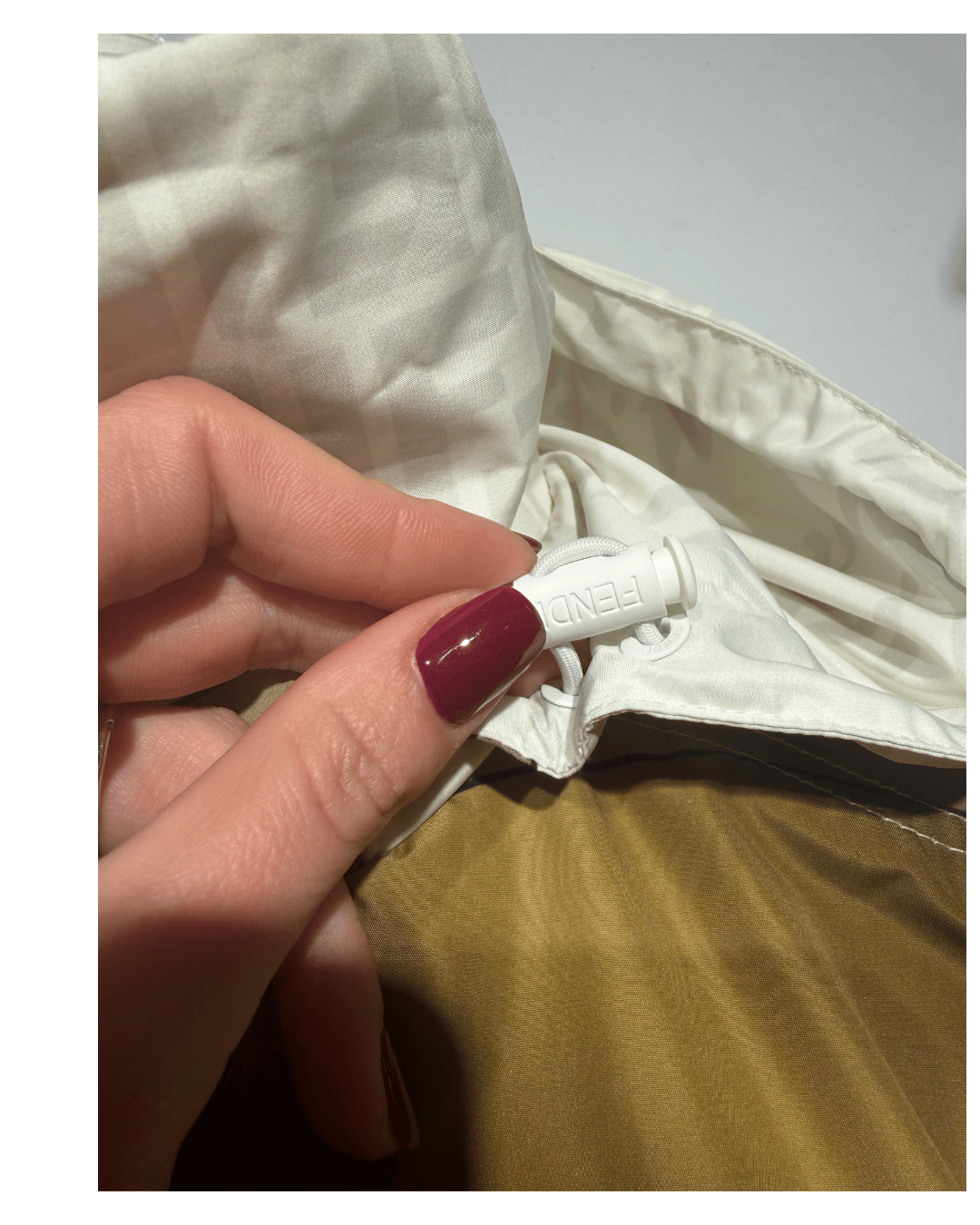 Un modello leggero, perfetto per le mezze stagioni, che unisce funzionalità e stile. Un lato presenta una raffinata stampa grafica nei toni del beige, caramello, panna e nero, con zip centrale impreziosita dal tirazip logato. L’altro lato è caratterizzato dalle scritte fendi. Entrambi i lati sono completamente indossabili e curati nei minimi dettagli. Dotato di cappuccio, chiusura frontale con zip, fondo elasticizzato e polsini morbidi, questo giacchino garantisce comfort e vestibilità impeccabile. I dettagli logati su zip e cordini confermano l’attenzione sartoriale tipica della maison.