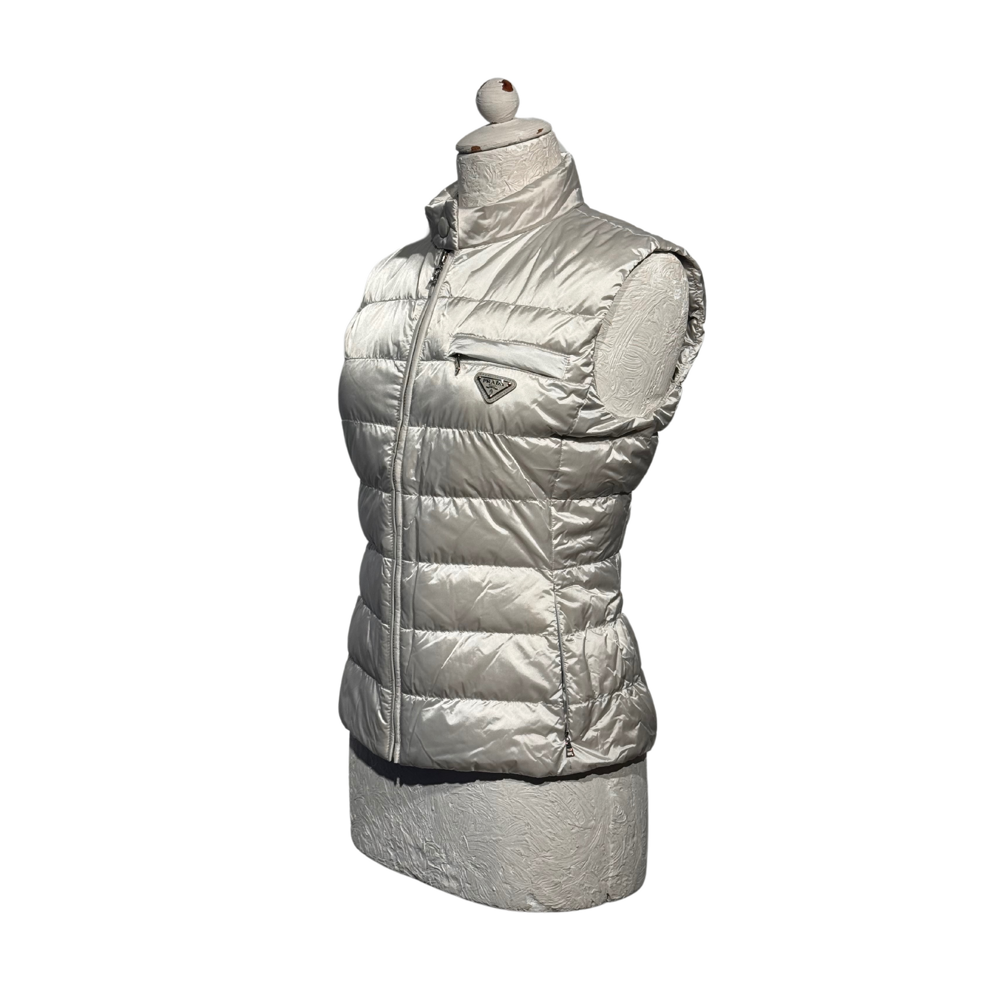 Gilet di Prada mezza stagione color grigio perla , molto luminoso. Logo lettering in corrispondenza della taschina. Apertura con cerniera e bottone sul collo.