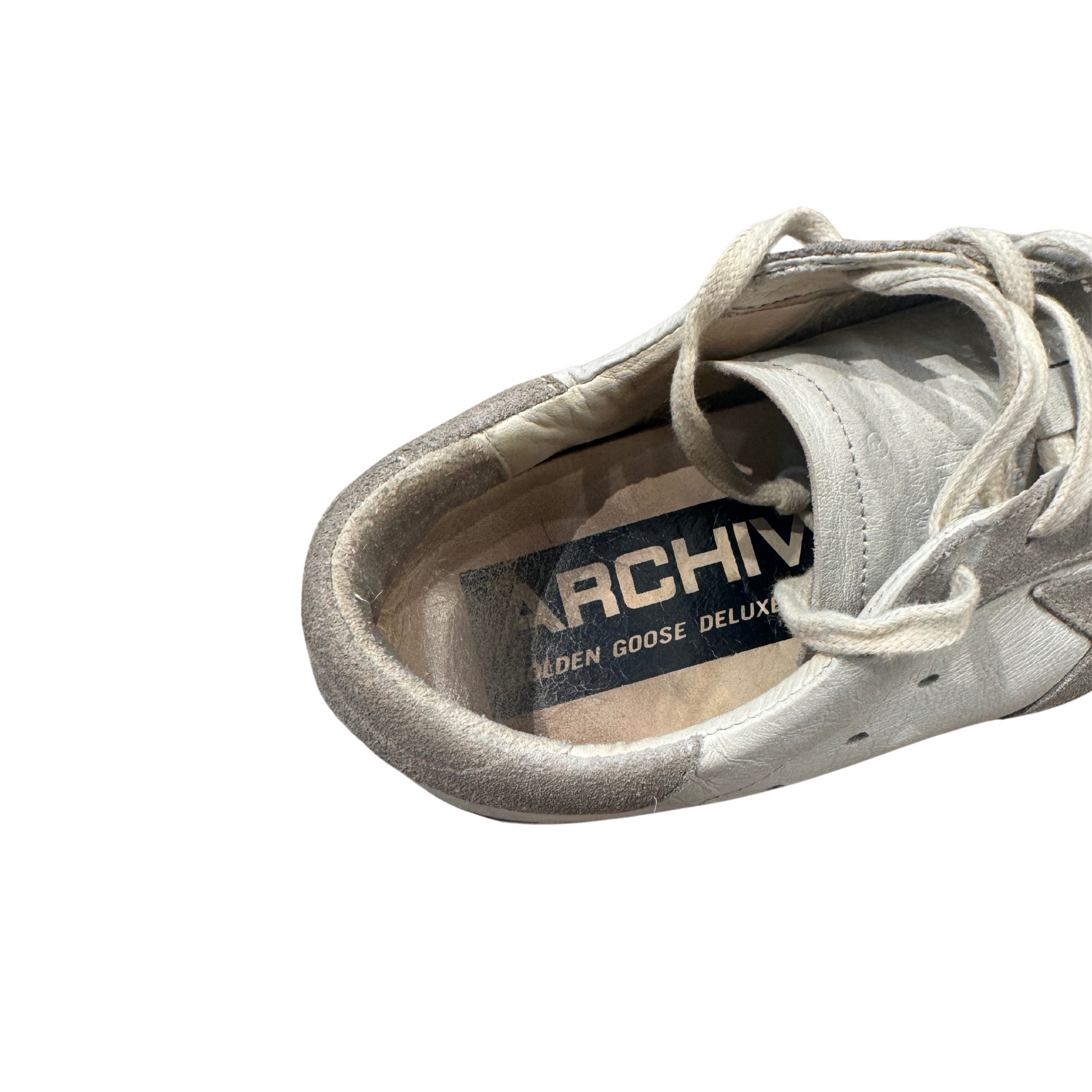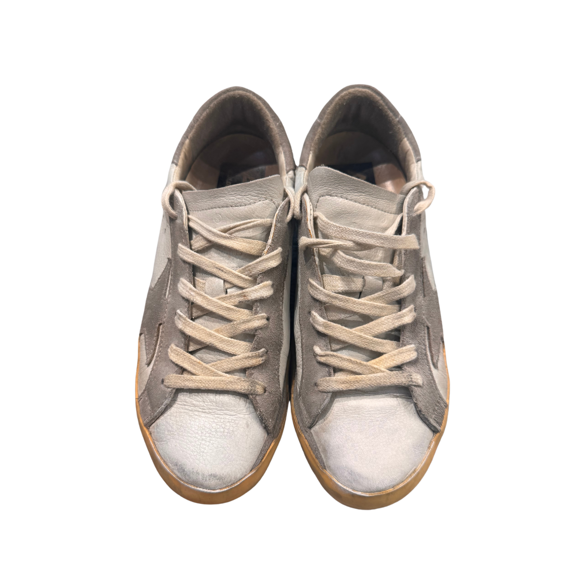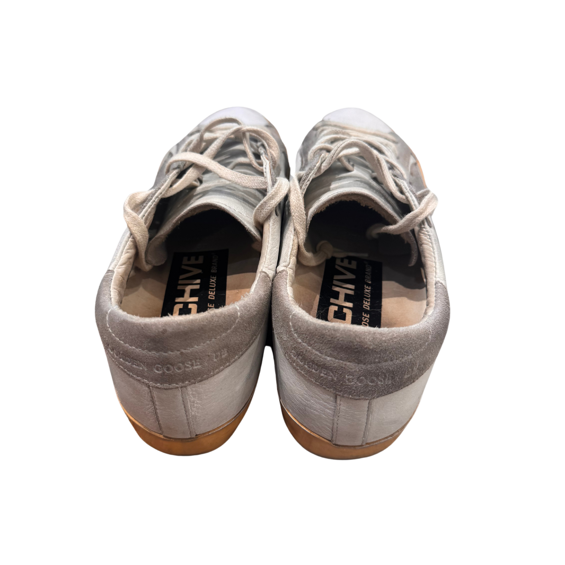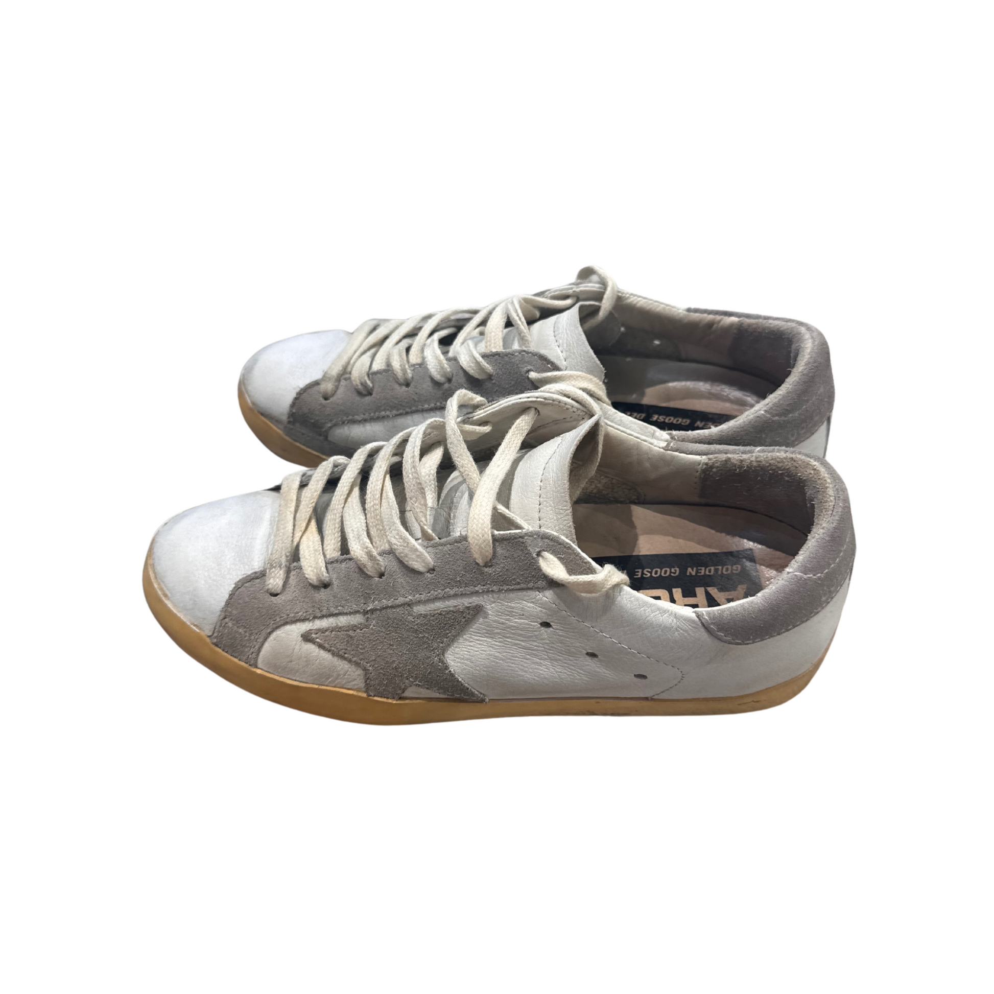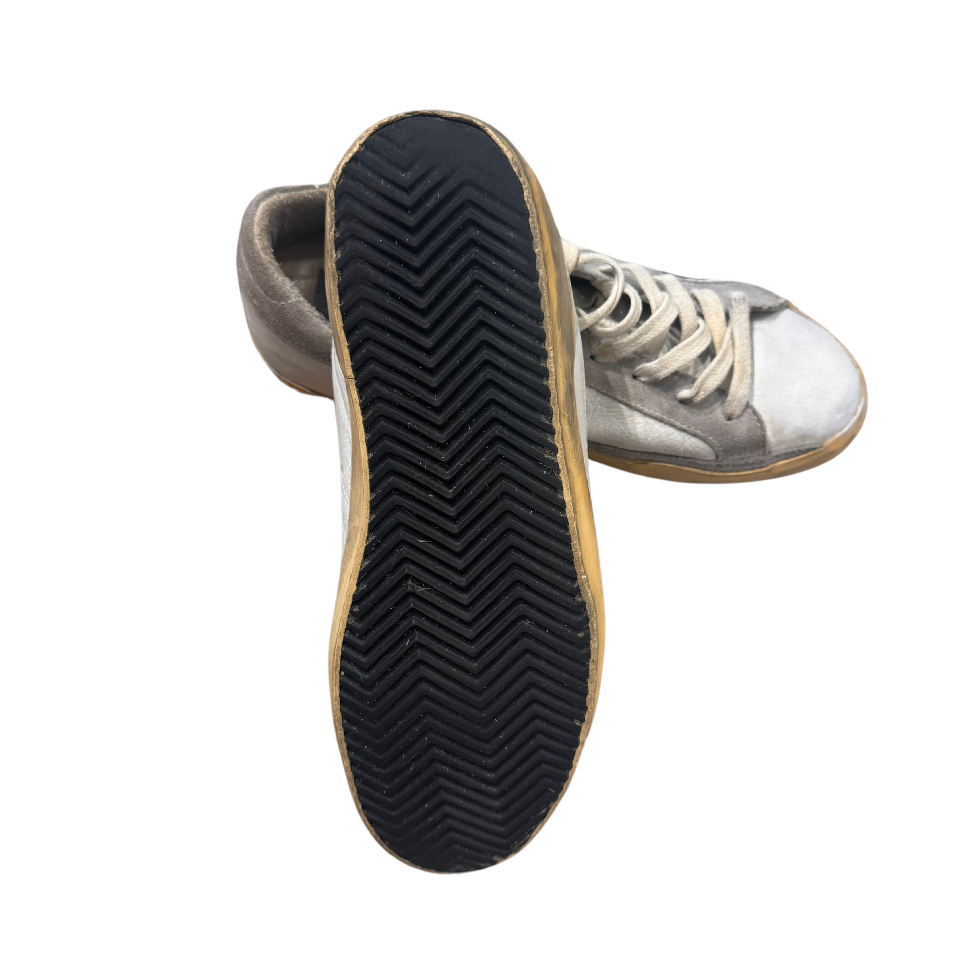 Sneakers Golde Goose da donna in pelle banca con rifiniture e stellina grigia. Lacci bianchi. Interno in pelle e suola in gomma antiscivolo.