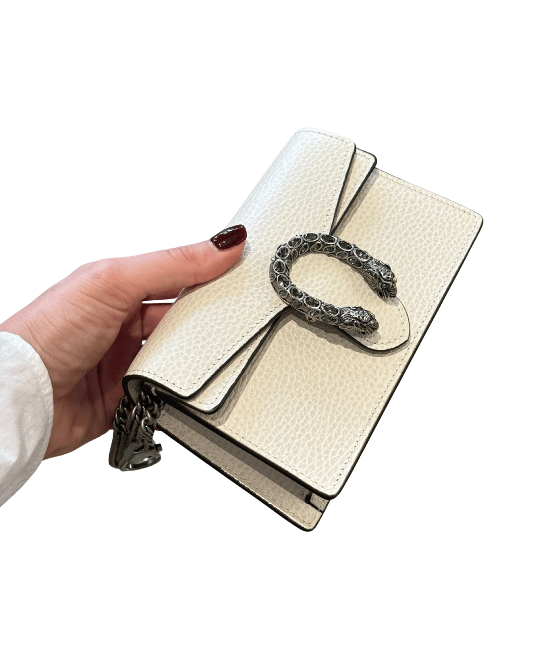Raffinata e senza tempo, questa mini borsa Gucci Dionysus è realizzata in pregiata pelle martellata color avorio, con bordi a contrasto e iconica chiusura a ferro di cavallo decorata da cristalli grigio fumo.