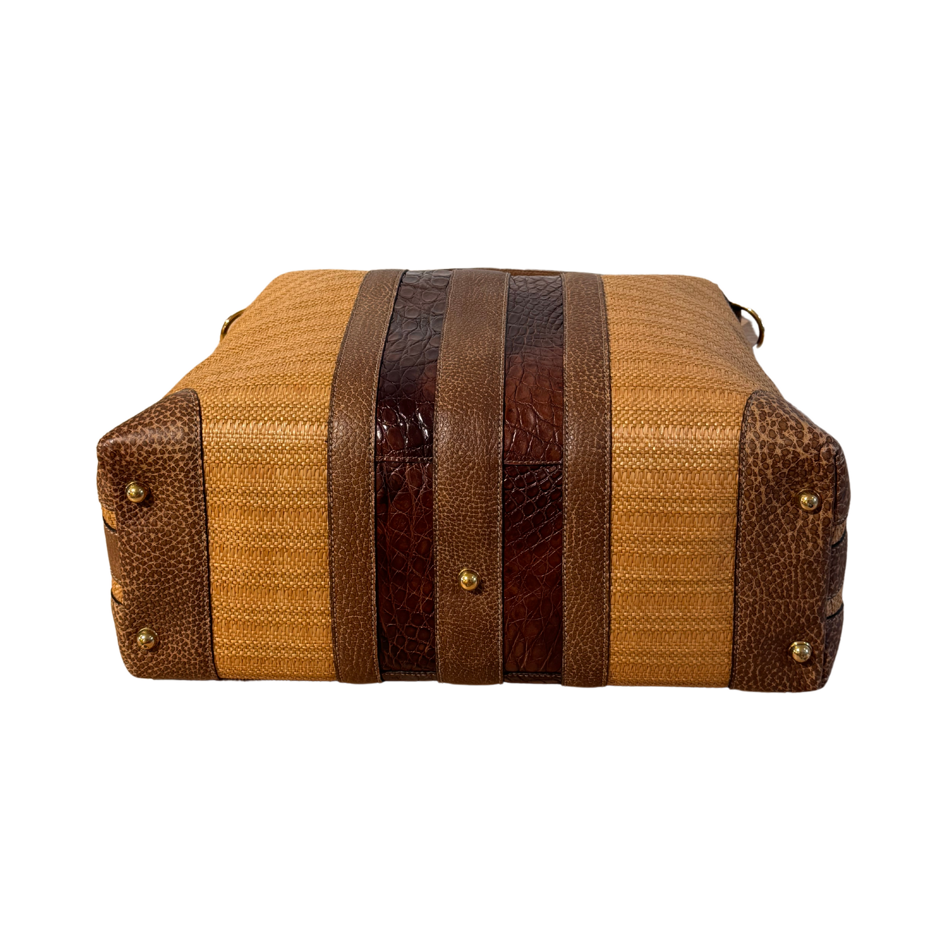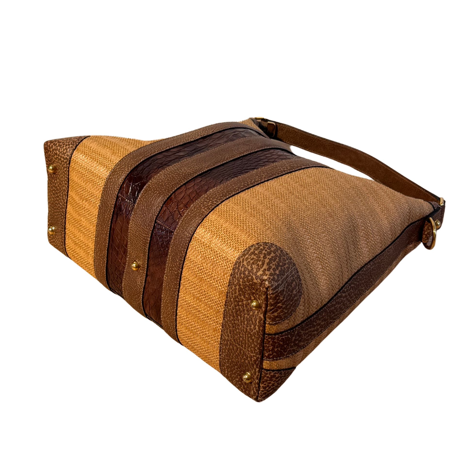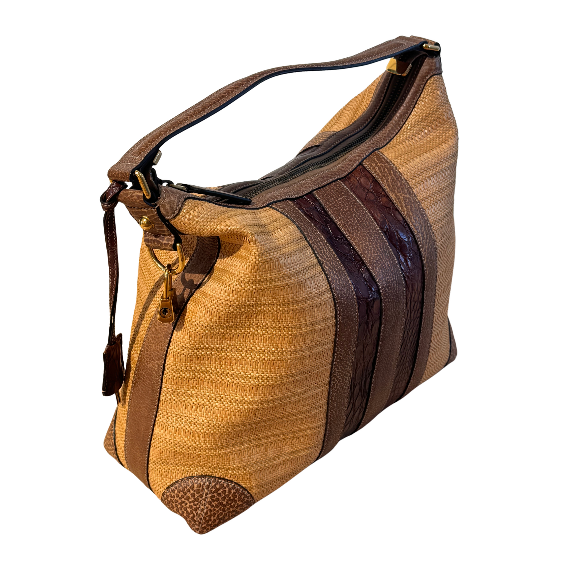 Borsa di Gucci modello Secret Hobo , edizione del 2010. Realizzata in rafia, pelle marrone e pelle di coccodrillo. Manico superiore e tracolla amovibile. Metalleria dorata. Cinque piedini d'appoggio. Apertura superiore con cerniera, interno in tessuto beige, tasca con cerniera.