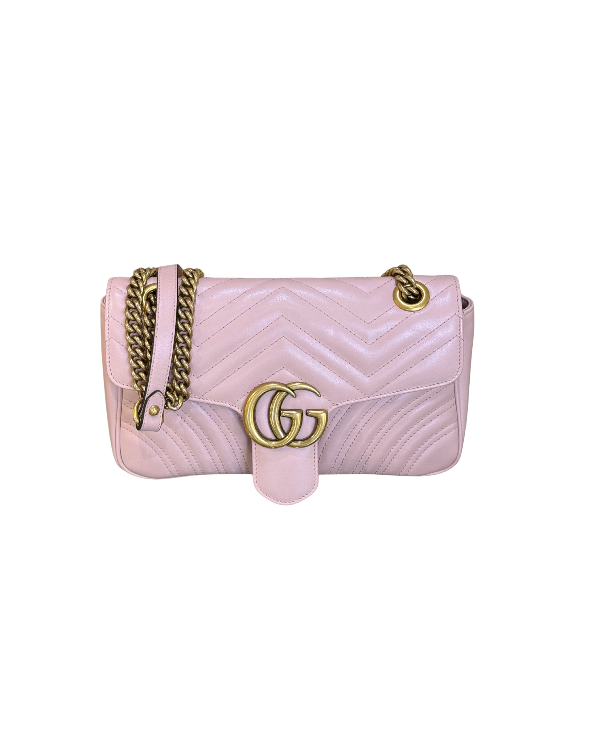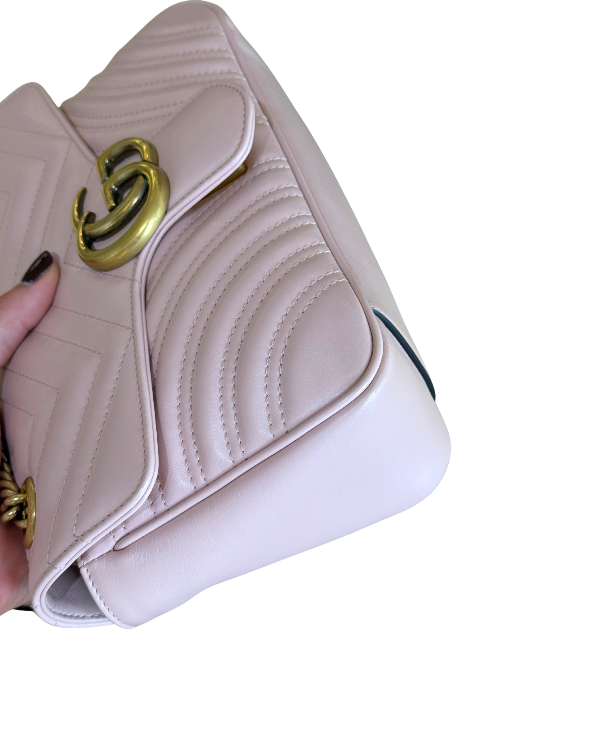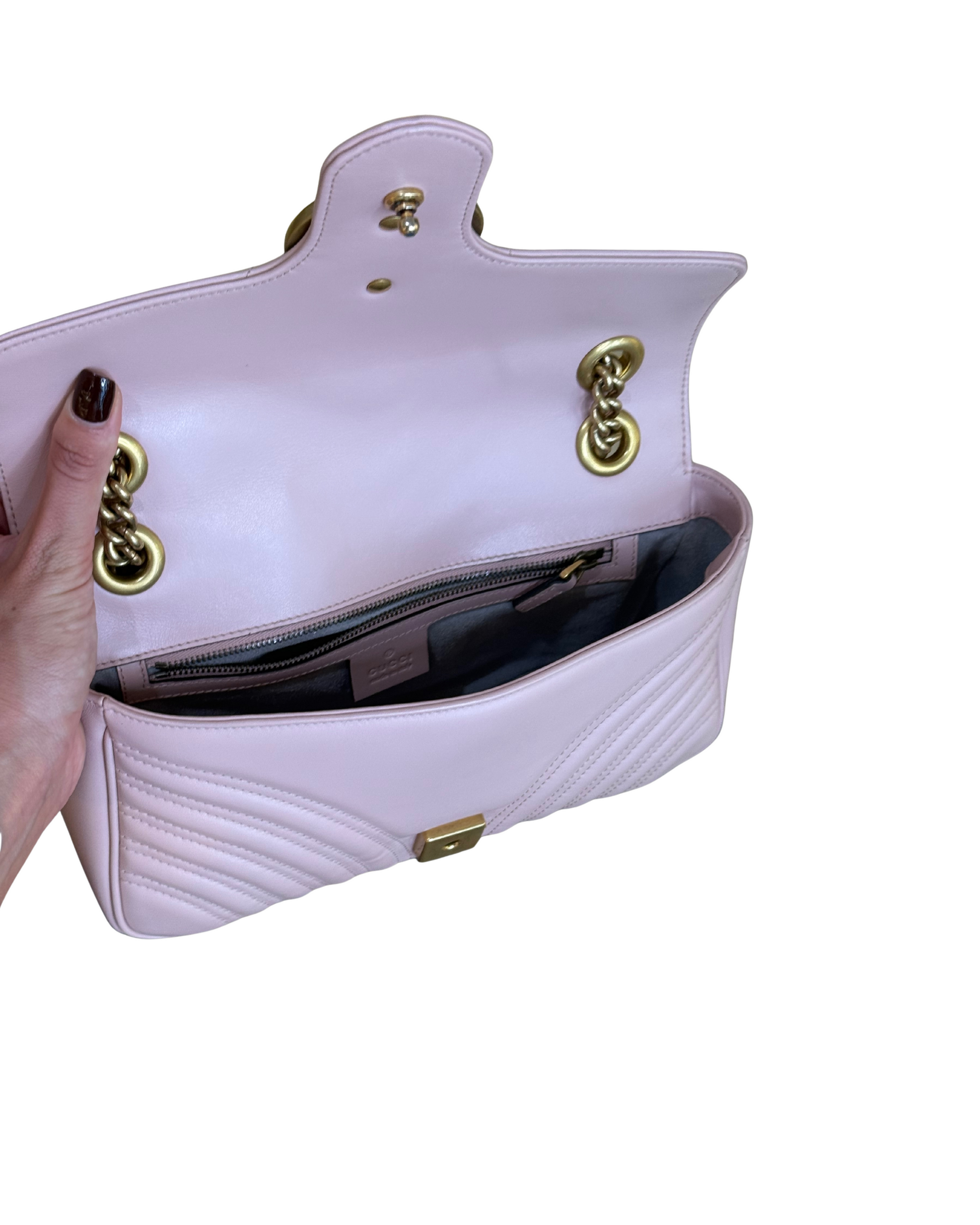 Gucci marmont 26 realizzata in pelle matelassé rosa con finiture in metallo dorato anticato che esalta il doppio logo GG frontale. Tracolla a catena scorrevole con poggiaspalla in pelle. Apertura frontale con patta. interno in microfibra, tasca con cerniera. (codice: 443497 591693)