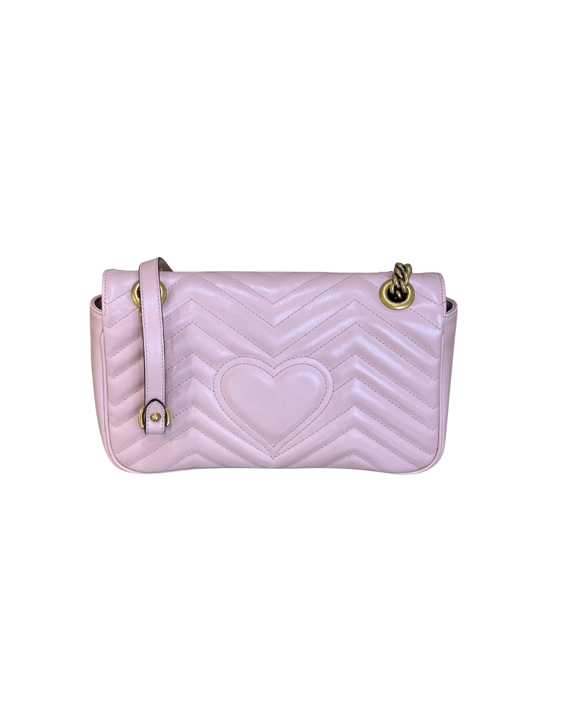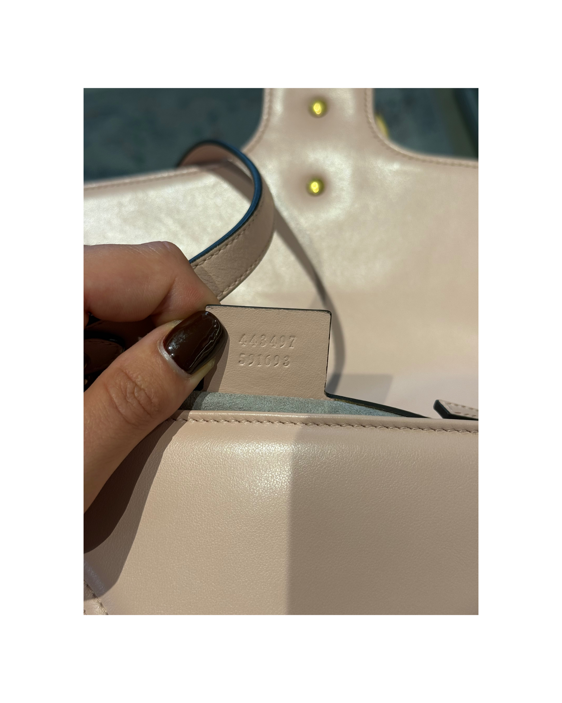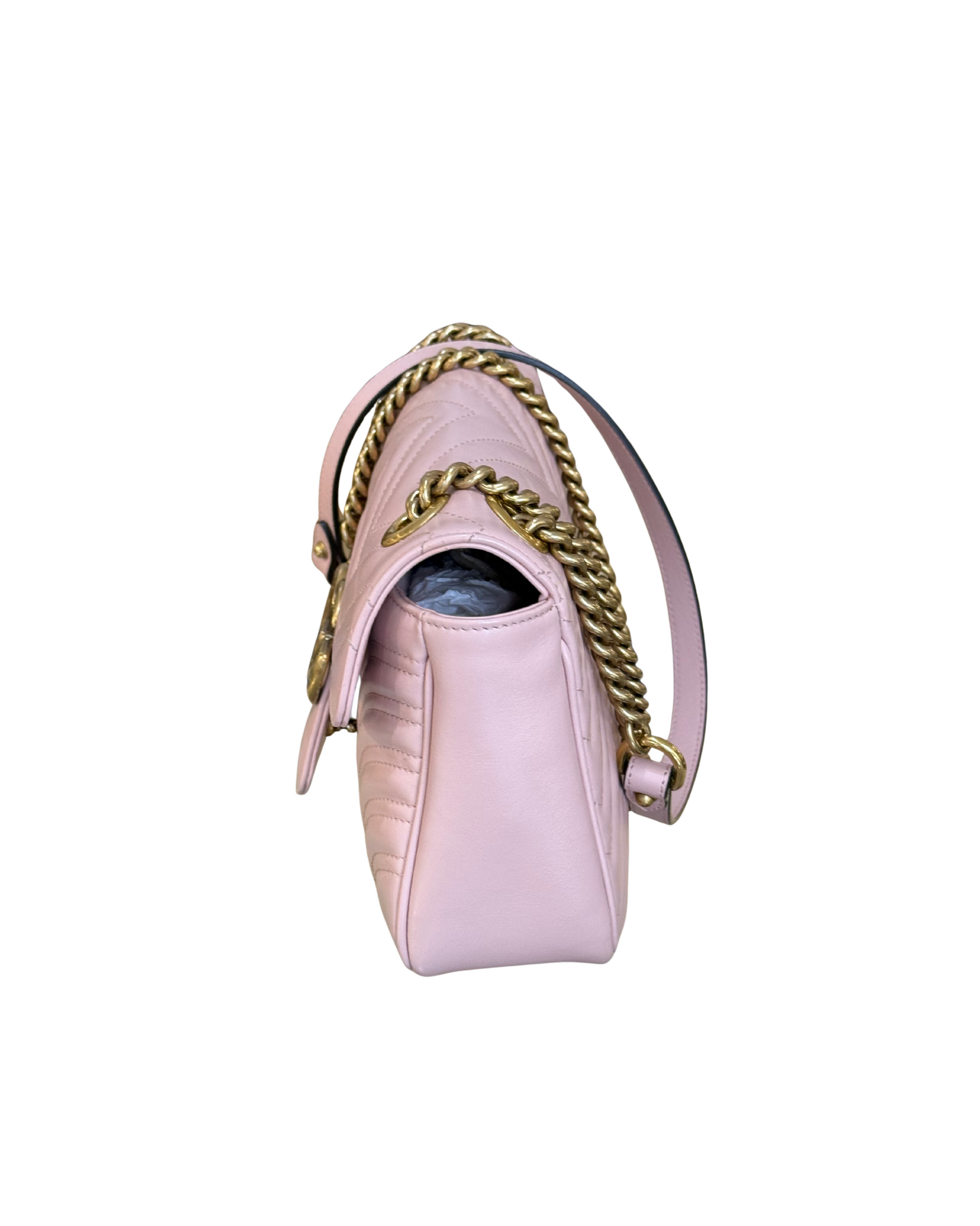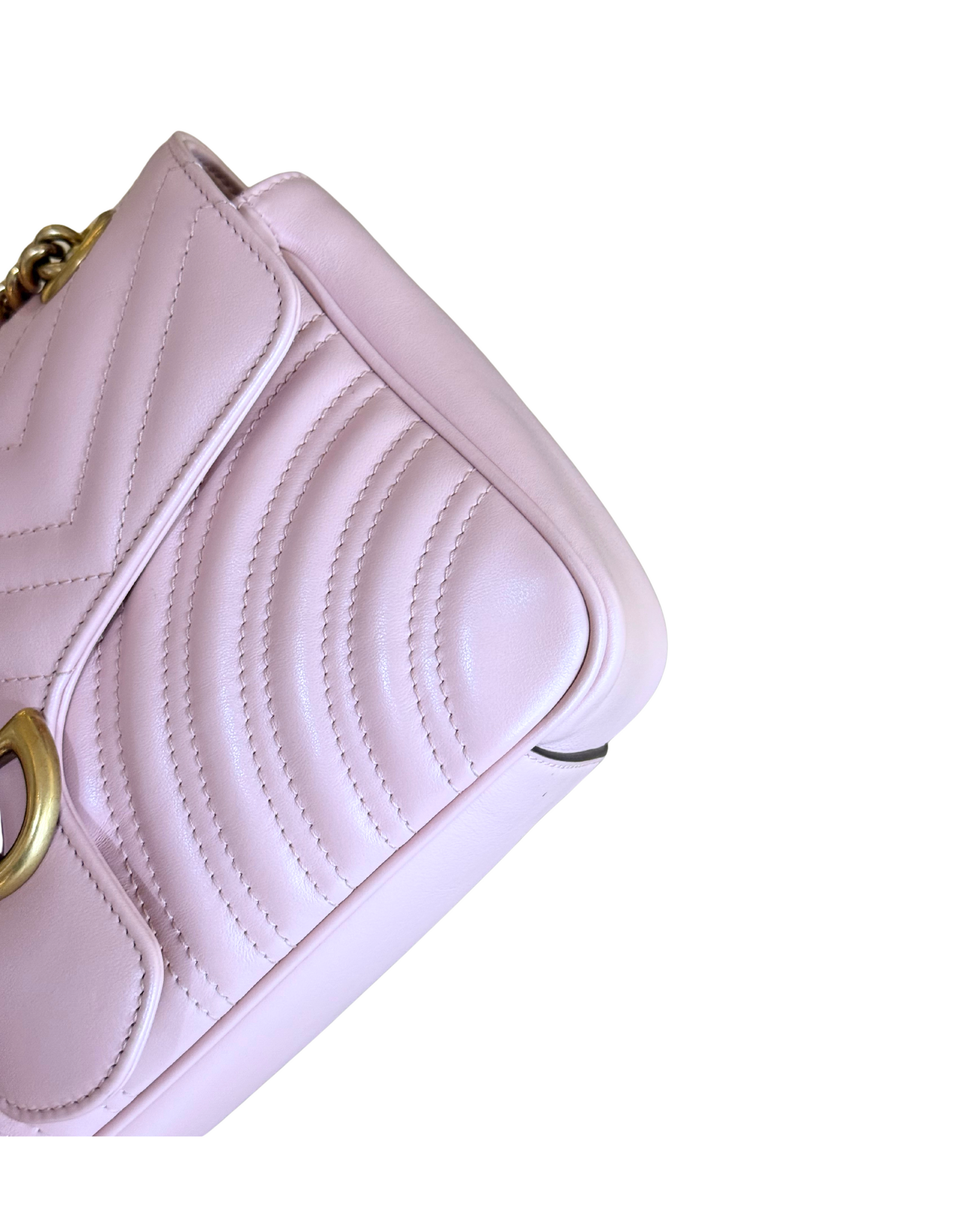 Gucci marmont 26 realizzata in pelle matelassé rosa con finiture in metallo dorato anticato che esalta il doppio logo GG frontale. Tracolla a catena scorrevole con poggiaspalla in pelle. Apertura frontale con patta. interno in microfibra, tasca con cerniera. (codice: 443497 591693)