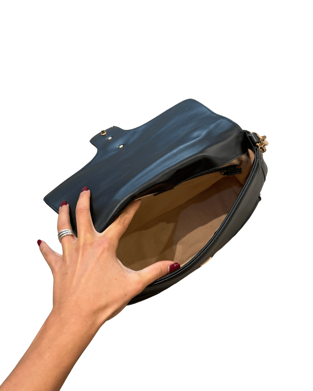 Iconica e senza tempo, la Gucci Marmont Top Handle è una borsa che unisce eleganza e praticità. Realizzata in morbida pelle matelassé nera con motivo chevron e cuore sul retro, si distingue per l’inconfondibile doppia G dorata sulla patta frontale. Il modello è dotato di manico rigido per portarla a mano e di tracolla a catena con inserto in pelle per una comoda portabilità anche a spalla o crossbody. L’interno è foderato in microfibra effetto suede e presenta uno scomparto spazioso con tasca chiusa da zip, perfetto per organizzare gli oggetti essenziali. La chiusura con bottone a pressione assicura praticità e sicurezza.( codice: 498109 001998)
