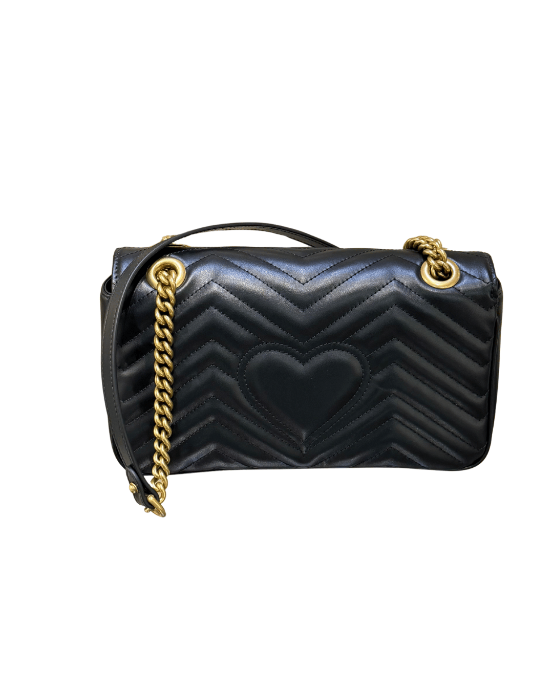 Gucci marmont 26 realizzata in pelle matelassé nera con finiture in metallo dorato che esalta il doppio logo GG frontale. Tracolla a catena scorrevole con poggiaspalla in pelle. Apertura frontale con patta. interno in microfibra, tasca con cerniera. (codice: 443497 213317)