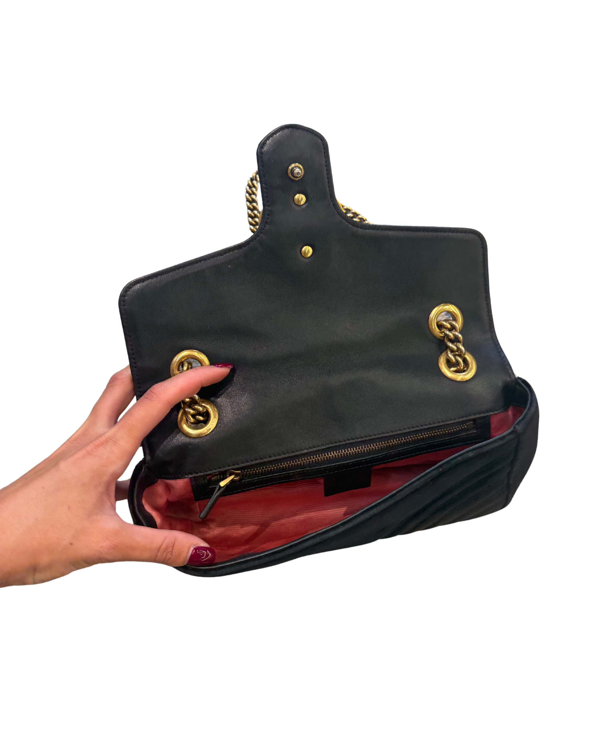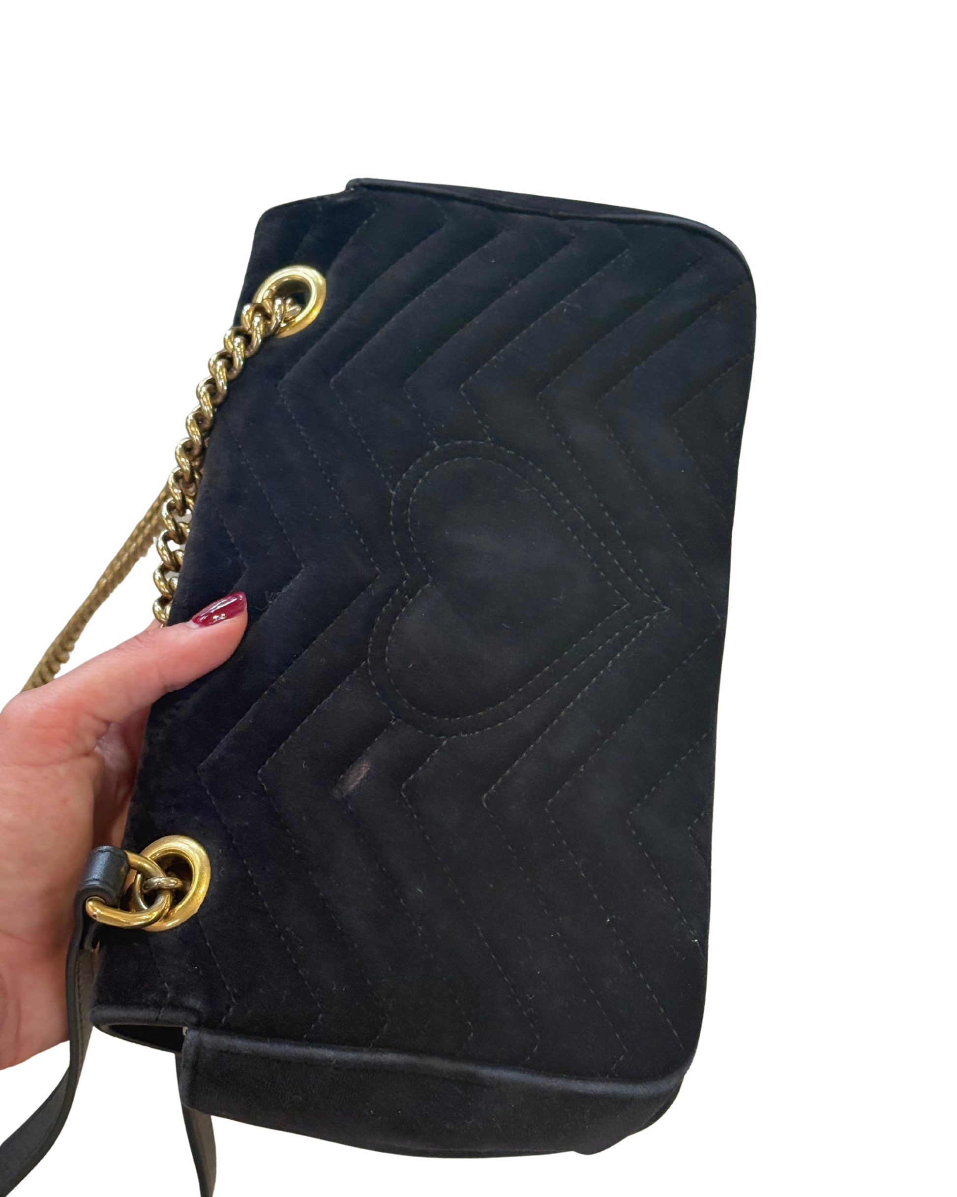 Iconica borsa Gucci Marmont misura 26 realizzata in velluto nero con motivo chevron e cuore ricamato sul retro. Rifinita con catena in metallo dorato anticato e dettagli in pelle nera, presenta la celebre doppia G frontale. Interno in tessuto color rosa con tasca con zip. (codice:443497 - 591693)