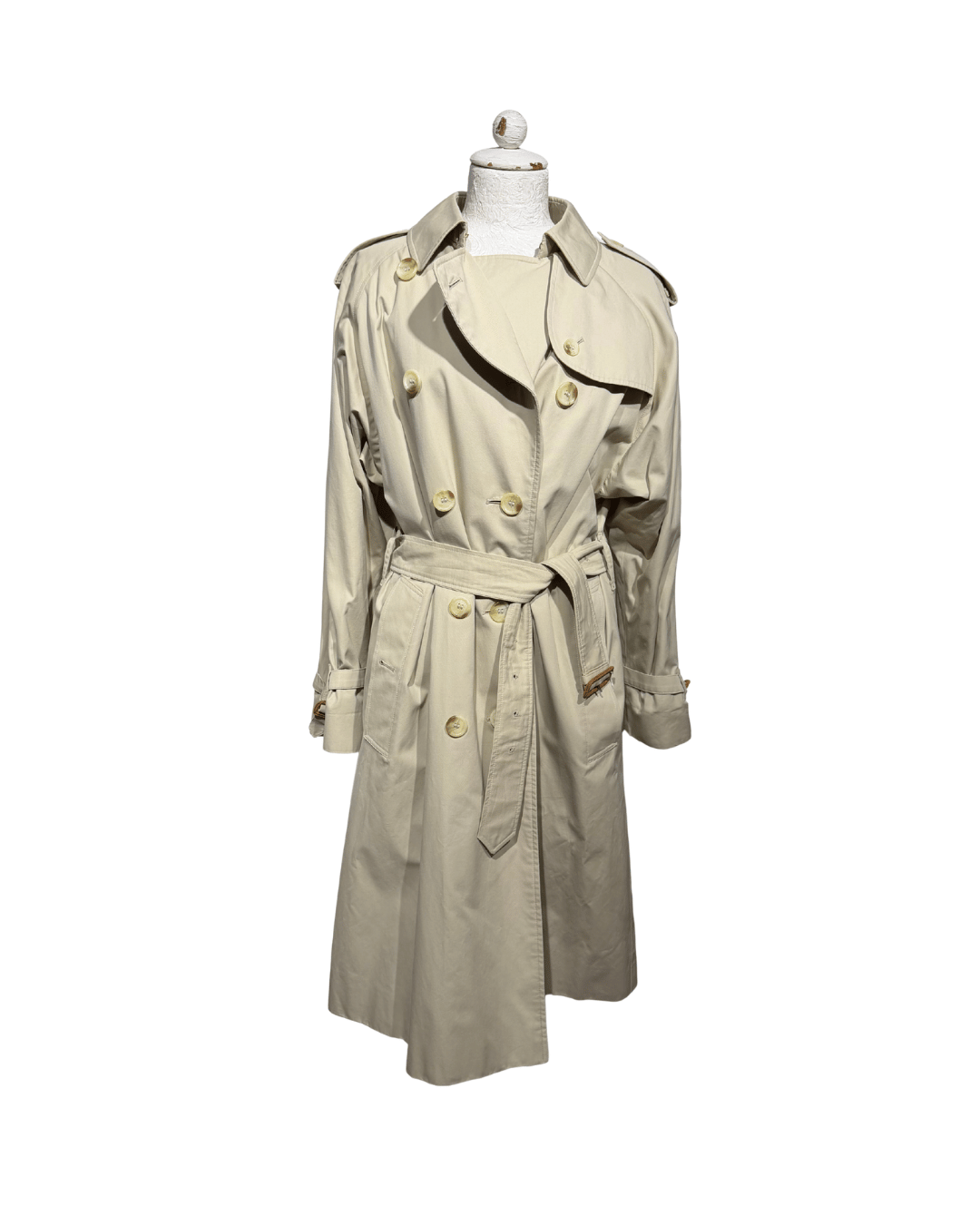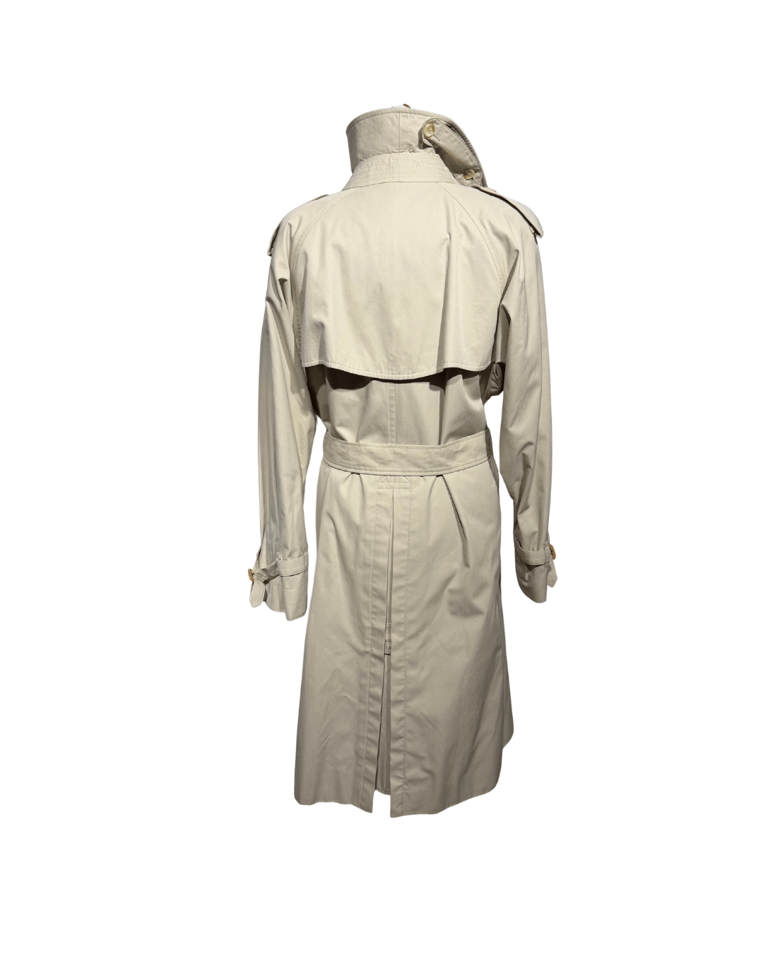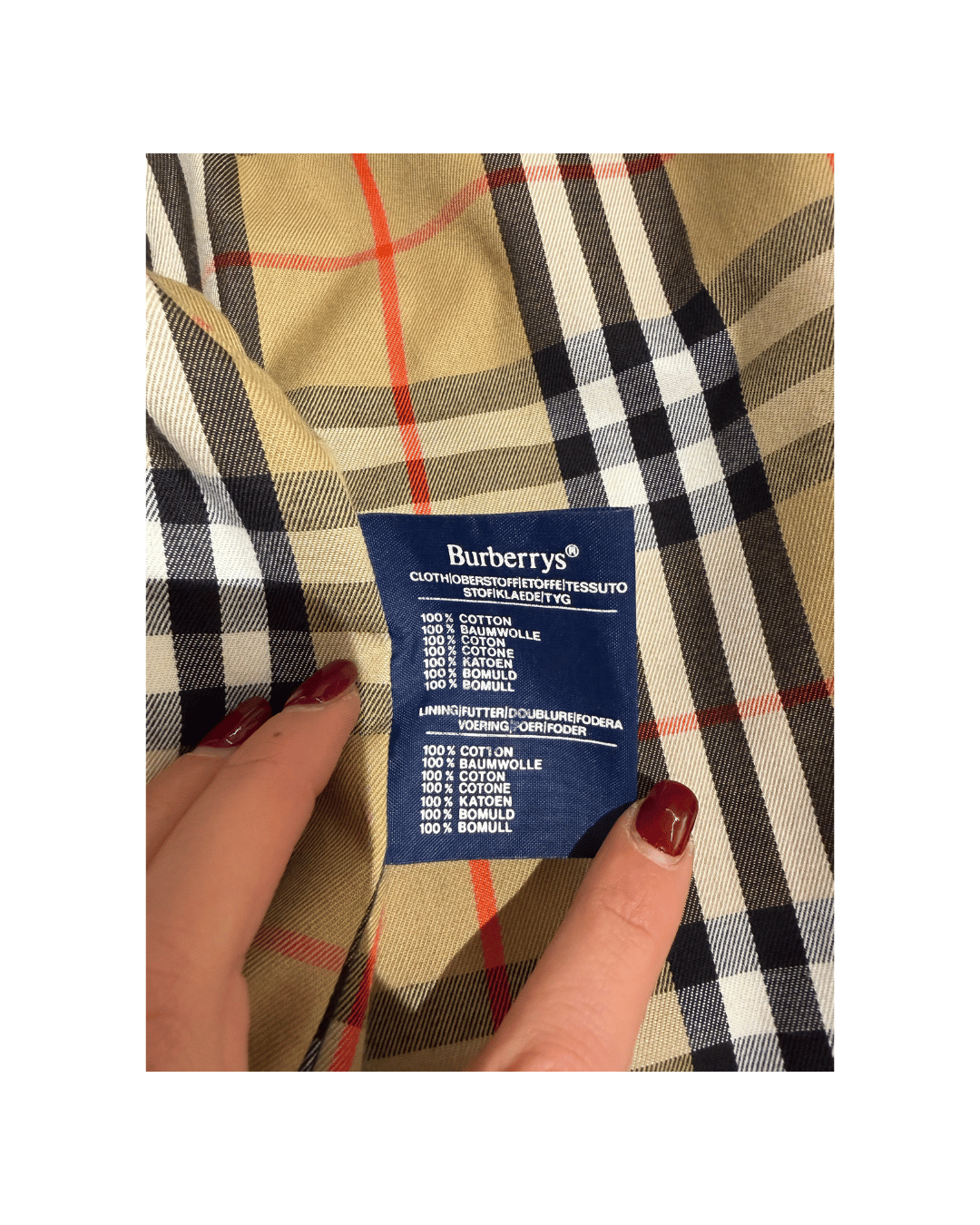 Questo trench vintage di Burberry, realizzato in Inghilterra, è un grande classico intramontabile della maison. In cotone beige con iconica fodera interna check Burberry, presenta tutte le caratteristiche del trench tradizionale: chiusura doppiopetto, cintura originale in vita, spalline e dettagli sartoriali tipici del modello inglese. La linea è elegante ma comoda, leggermente ampia e strutturata, perfetta sia su look casual con jeans e sneakers sia sopra outfit più raffinati. Un capo senza tempo che resta sempre attuale e ricercato.