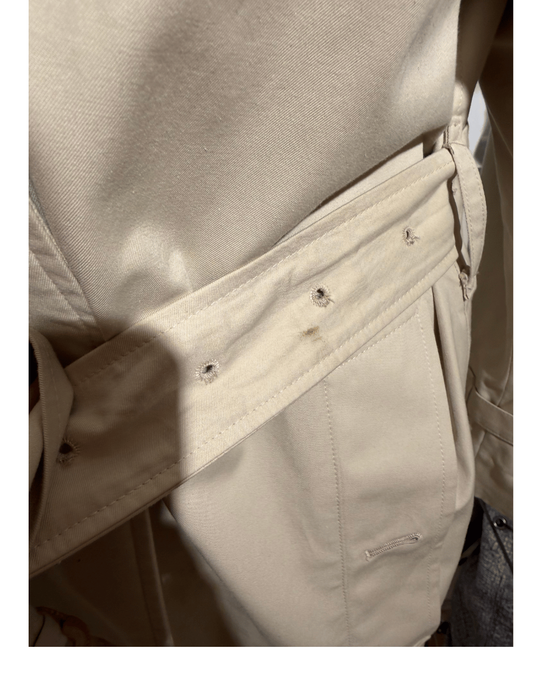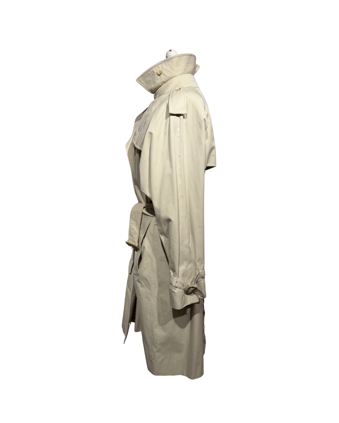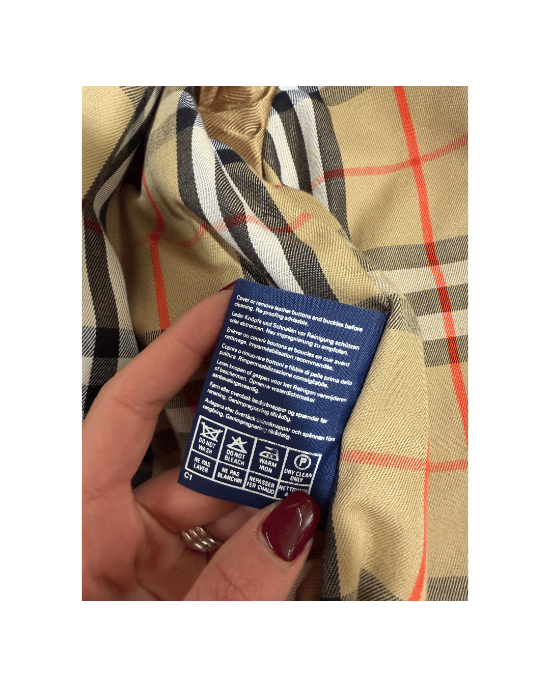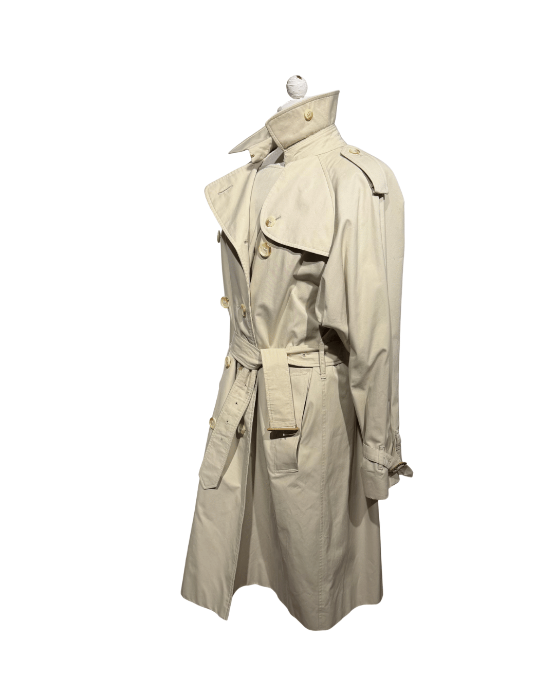 Questo trench vintage di Burberry, realizzato in Inghilterra, è un grande classico intramontabile della maison. In cotone beige con iconica fodera interna check Burberry, presenta tutte le caratteristiche del trench tradizionale: chiusura doppiopetto, cintura originale in vita, spalline e dettagli sartoriali tipici del modello inglese. La linea è elegante ma comoda, leggermente ampia e strutturata, perfetta sia su look casual con jeans e sneakers sia sopra outfit più raffinati. Un capo senza tempo che resta sempre attuale e ricercato.