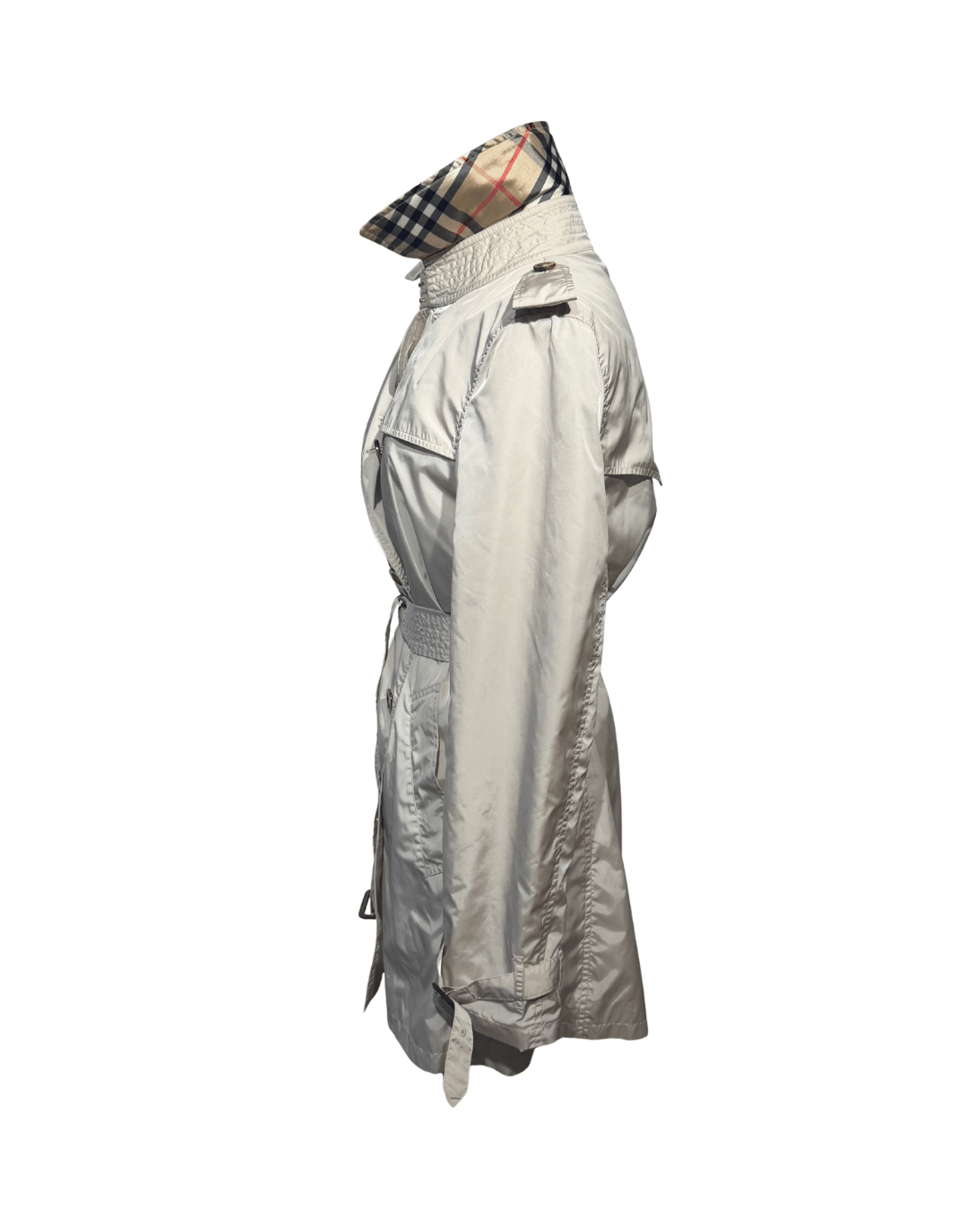 Iconico trench Burberry London realizzato in tessuto tecnico color beige chiaro, un capo intramontabile. La linea è femminile e leggermente sfiancata, con cintura in vita che valorizza la silhouette e permette di regolare la vestibilità. Classica chiusura doppiopetto con bottoni effetto tartarugato, spalline con bottone, cinturini regolabili ai polsi e tasche laterali. Sul retro è presente il tradizionale carré antivento, dettaglio iconico dei trench Burberry. Il colletto può essere indossato aperto oppure rialzato, rivelando l’inconfondibile fodera interna con motivo Burberry Check. Il capo è sfoderato con interno in rete traspirante, caratteristica che lo rende perfetto per la mezza stagione e molto leggero da indossare.