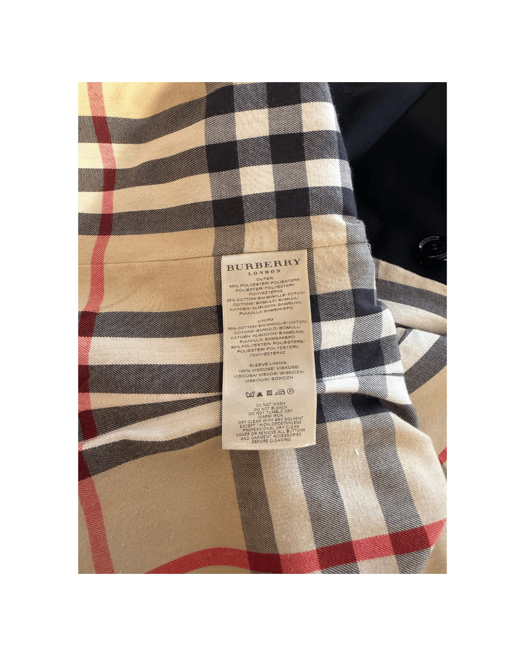 Iconico trench Burberry London realizzato in elegante tessuto nero con interno nel classico motivo Check Burberry. Un capo intramontabile, perfetto per ogni stagione e facilissimo da abbinare. Modello doppiopetto con cintura in vita, spalline sulle spalle, cinturini ai polsi e colletto strutturato che, se alzato, lascia intravedere la fodera check originale Burberry. Interno rifinito con grande etichetta Burberry London Made in England. Un capo raffinato e versatile, perfetto sopra jeans e sneakers ma anche su abiti eleganti o look da ufficio . Composizione: 65% poliestere, 35% cotone – fodera in cotone/poliestere – fodera maniche 100% viscosa