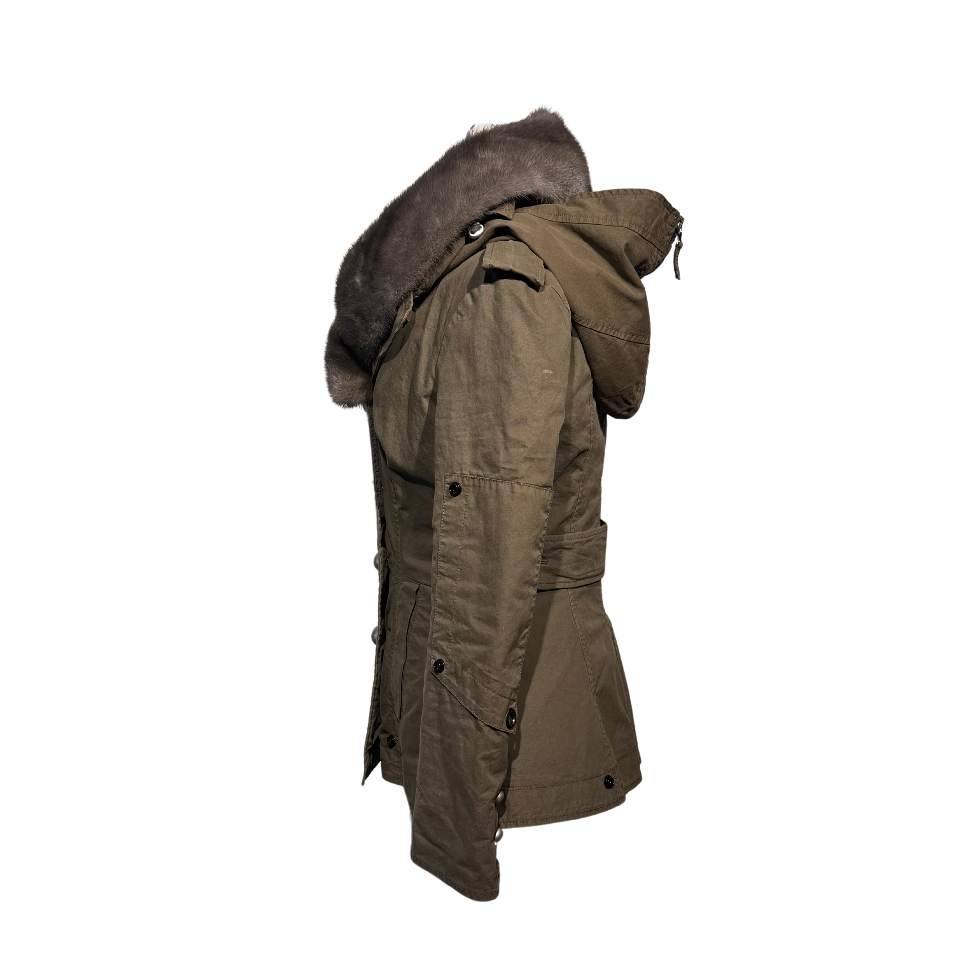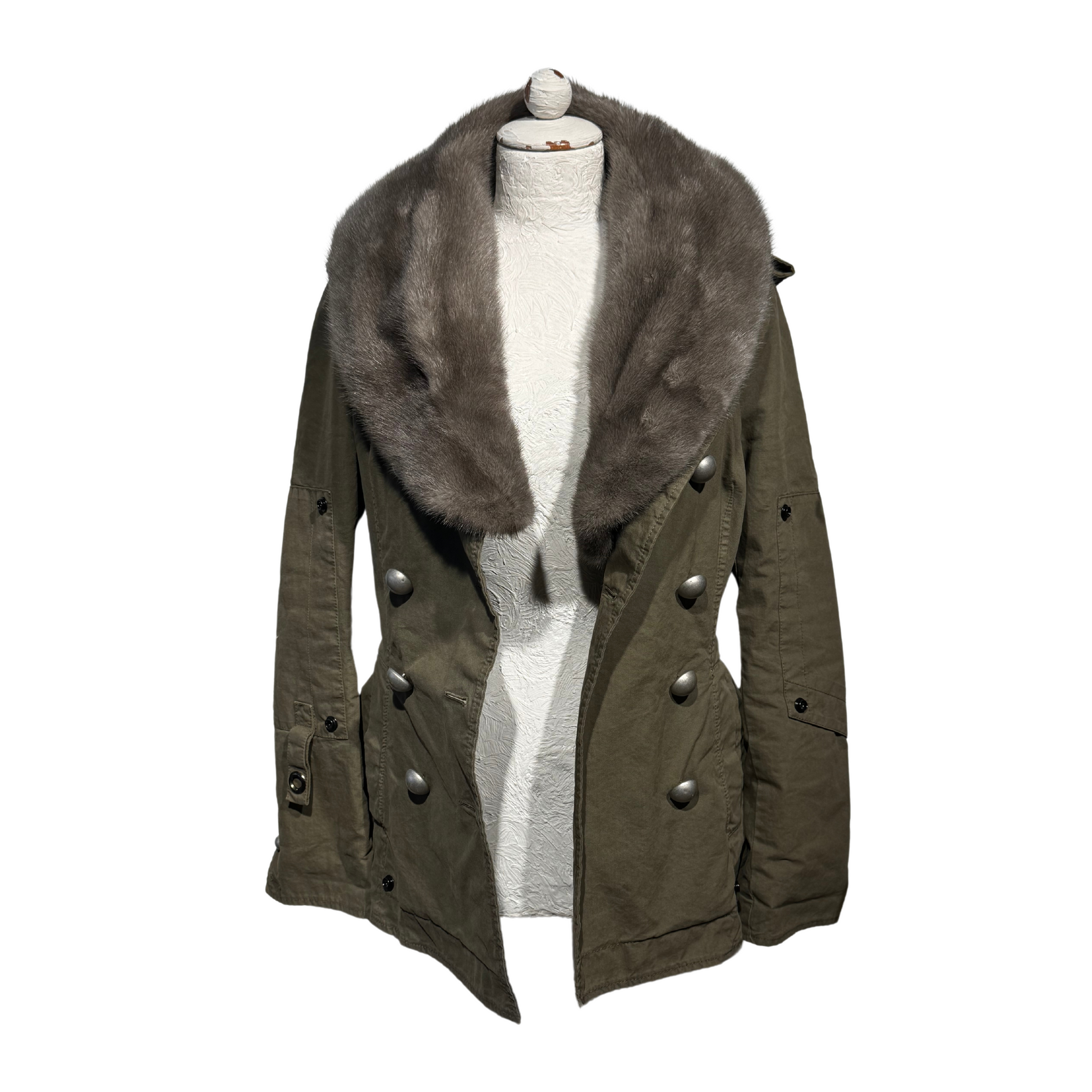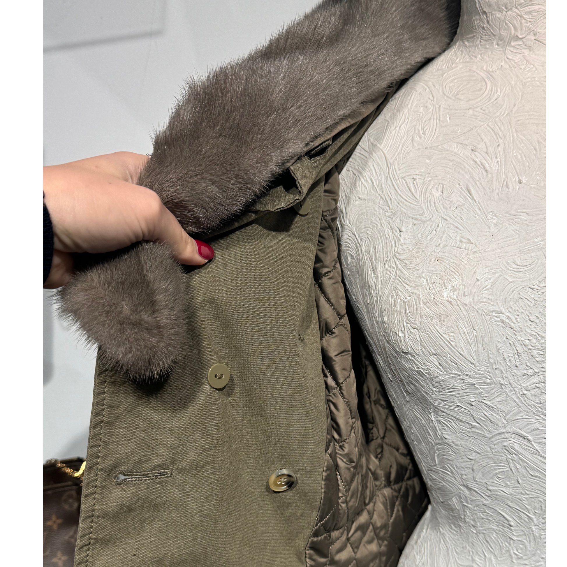 Impermeabile Ermanno Scervino verde oliva , interno imbottito. Impreziosito da collo in visone amovibile color tortora. Apertura frontale a doppio petto, bottoni argentati.