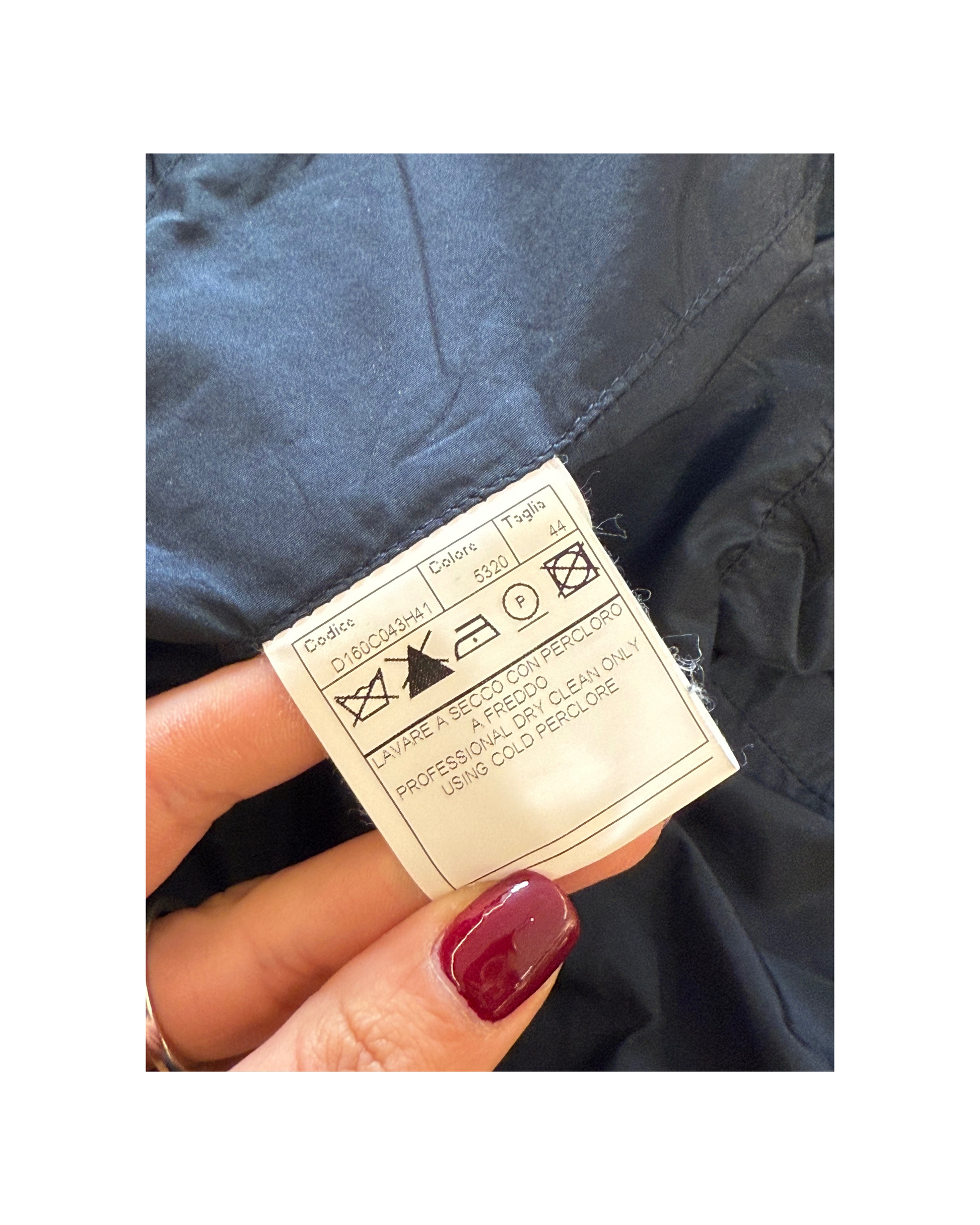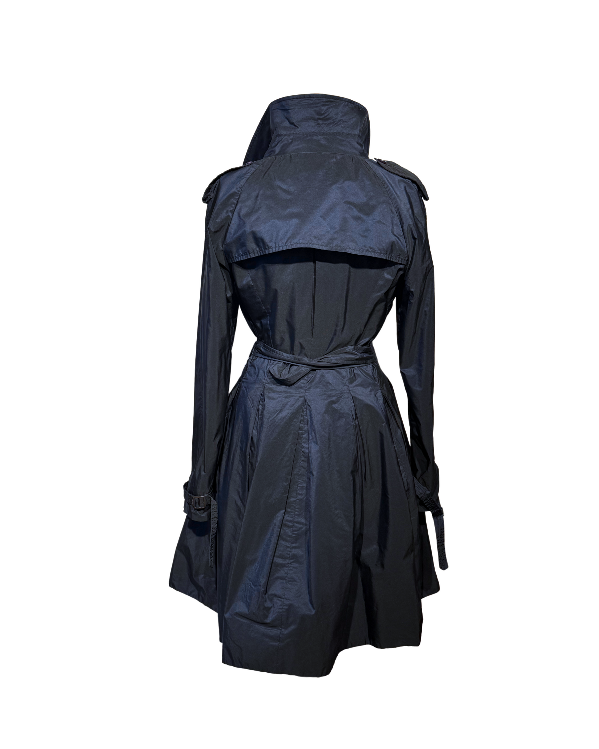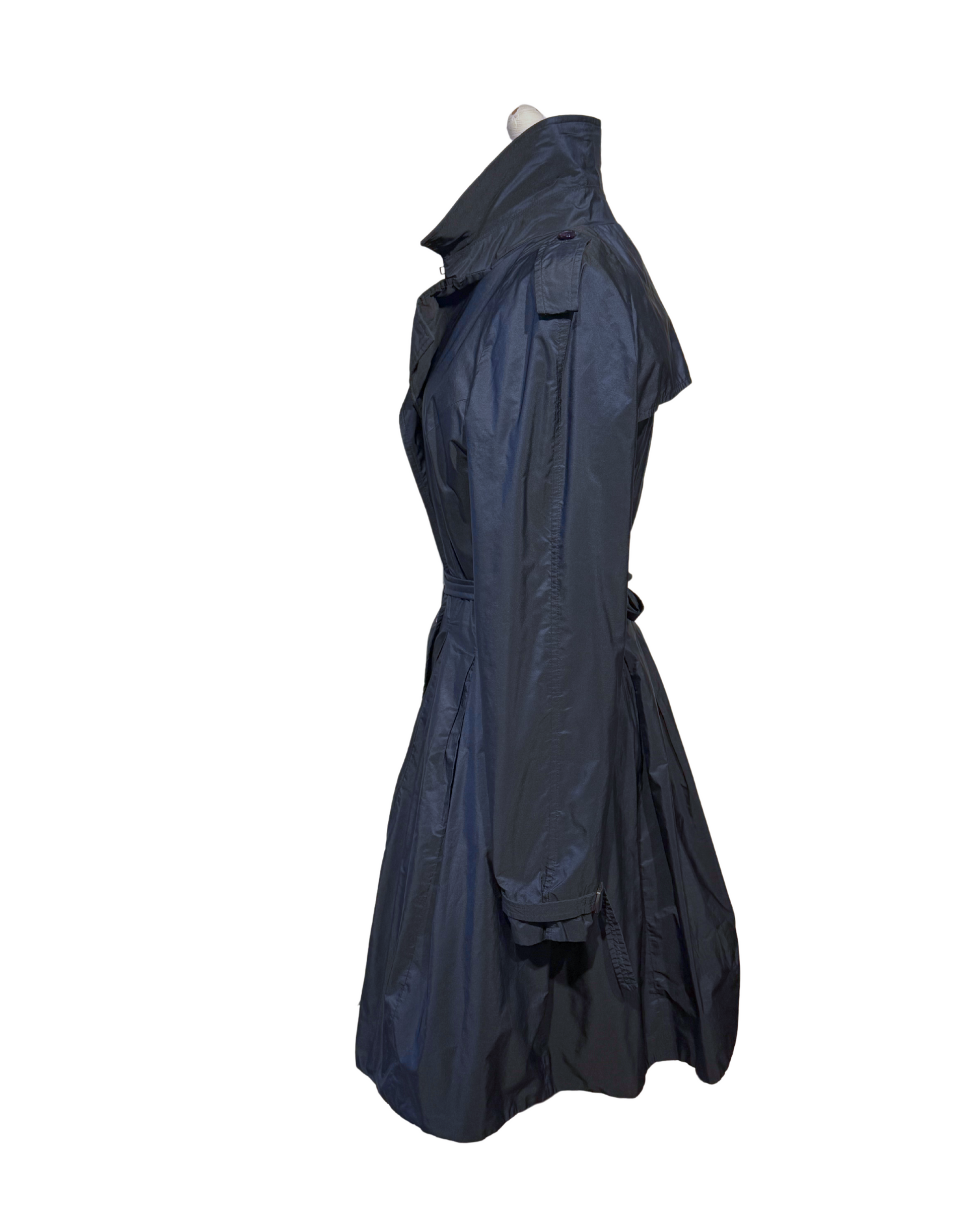 Impermeabile di Scervino blu scuro effetto metallizzato . Apertura frontale doppio petto e cintura in vita. Tasche laterali. Sfiancato, con gonna ampia effetto leggermente svasato.