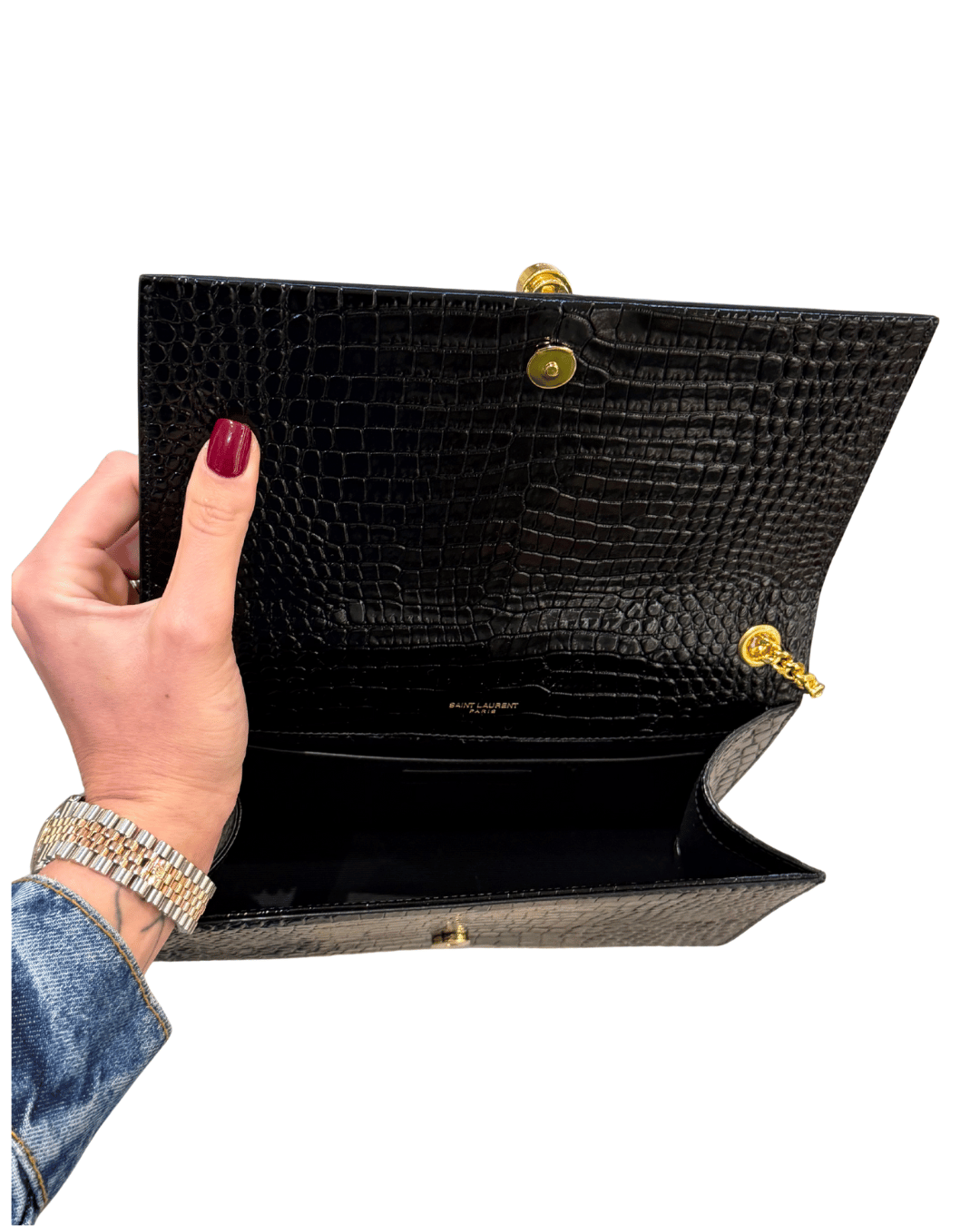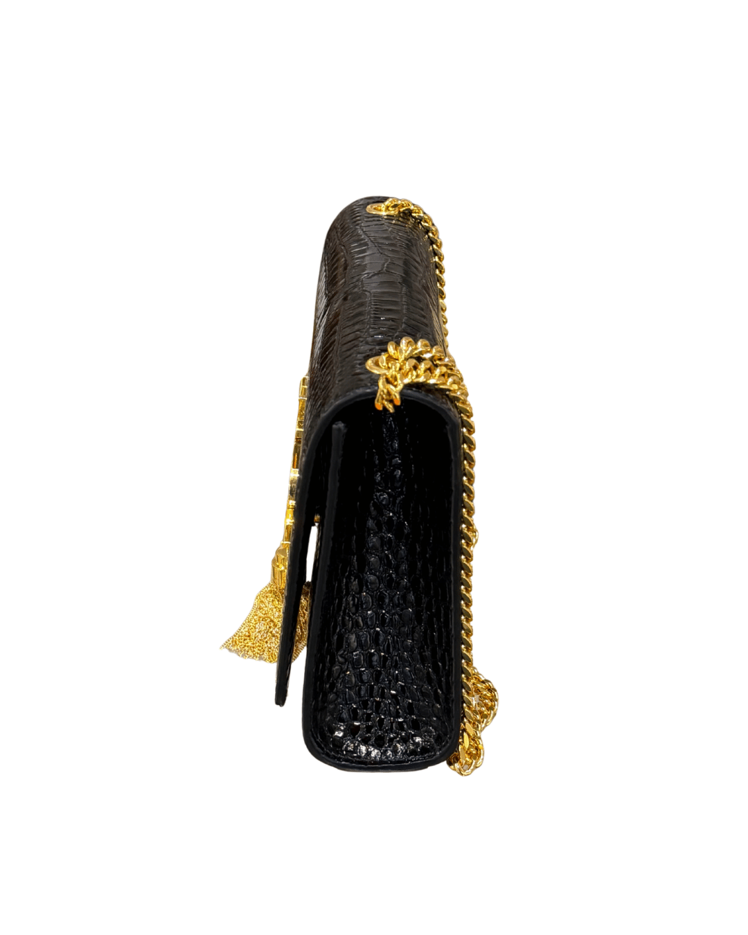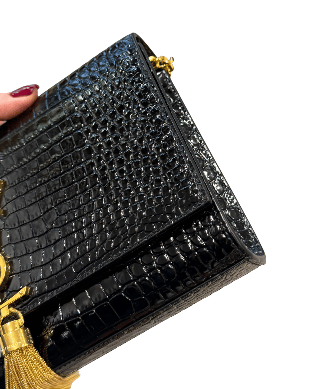 La Saint Laurent Kate Medium in versione stampa cocco nera è una delle borse più iconiche ed eleganti della Maison, un pezzo senza tempo pensato per accompagnare con classe sia le occasioni speciali che i look più minimal da giorno. Si distingue per la sua silhouette strutturata e pulita, illuminata dall’inconfondibile logo YSL in metallo dorato con nappina pendente, dettaglio simbolo della linea Kate. La catena dorata consente di indossarla comodamente a spalla o crossbody, rendendola estremamente versatile. L’interno, in contrasto scuro, è ideale per contenere l’essenziale con stile. ( codice: BRS 354119 0525)