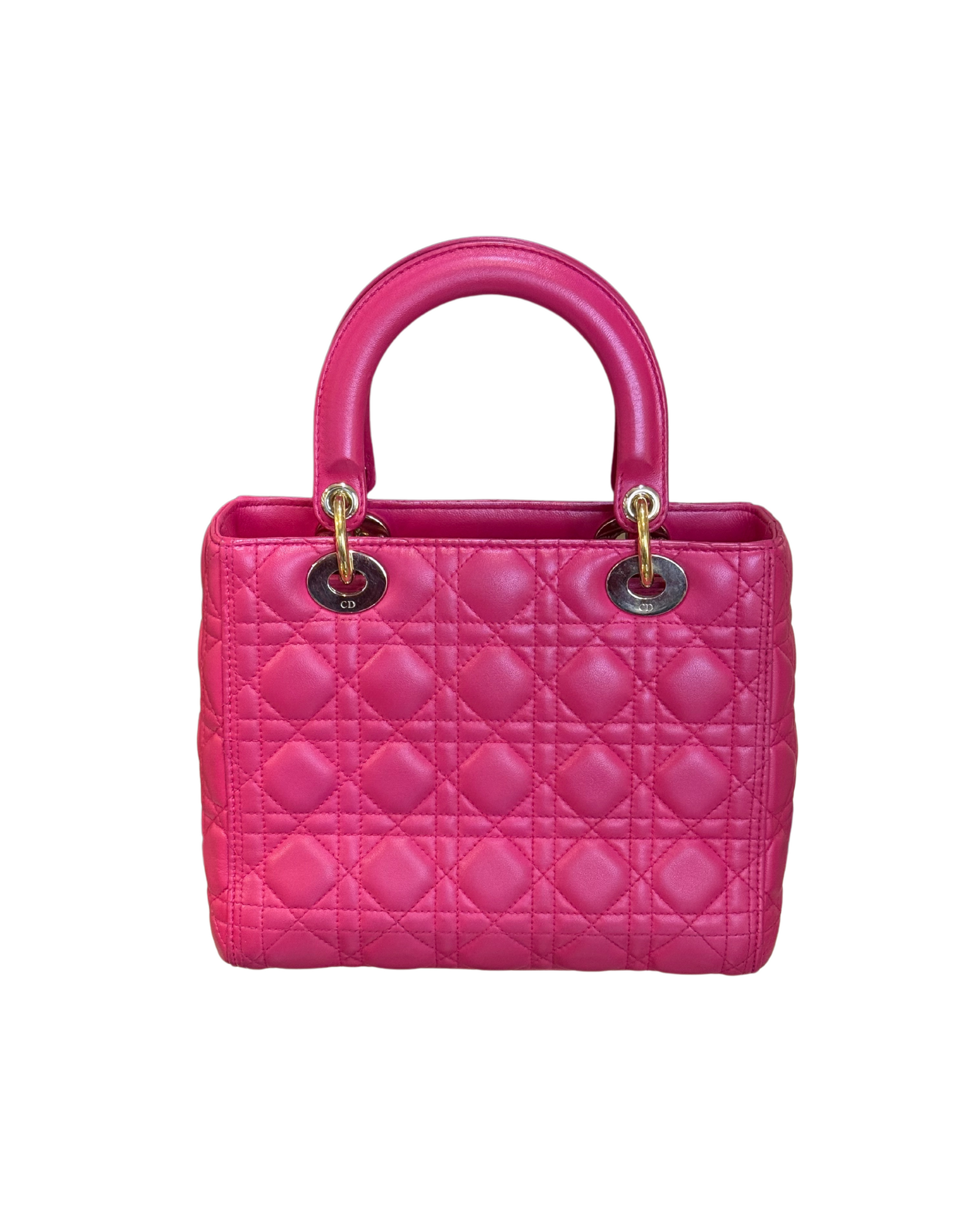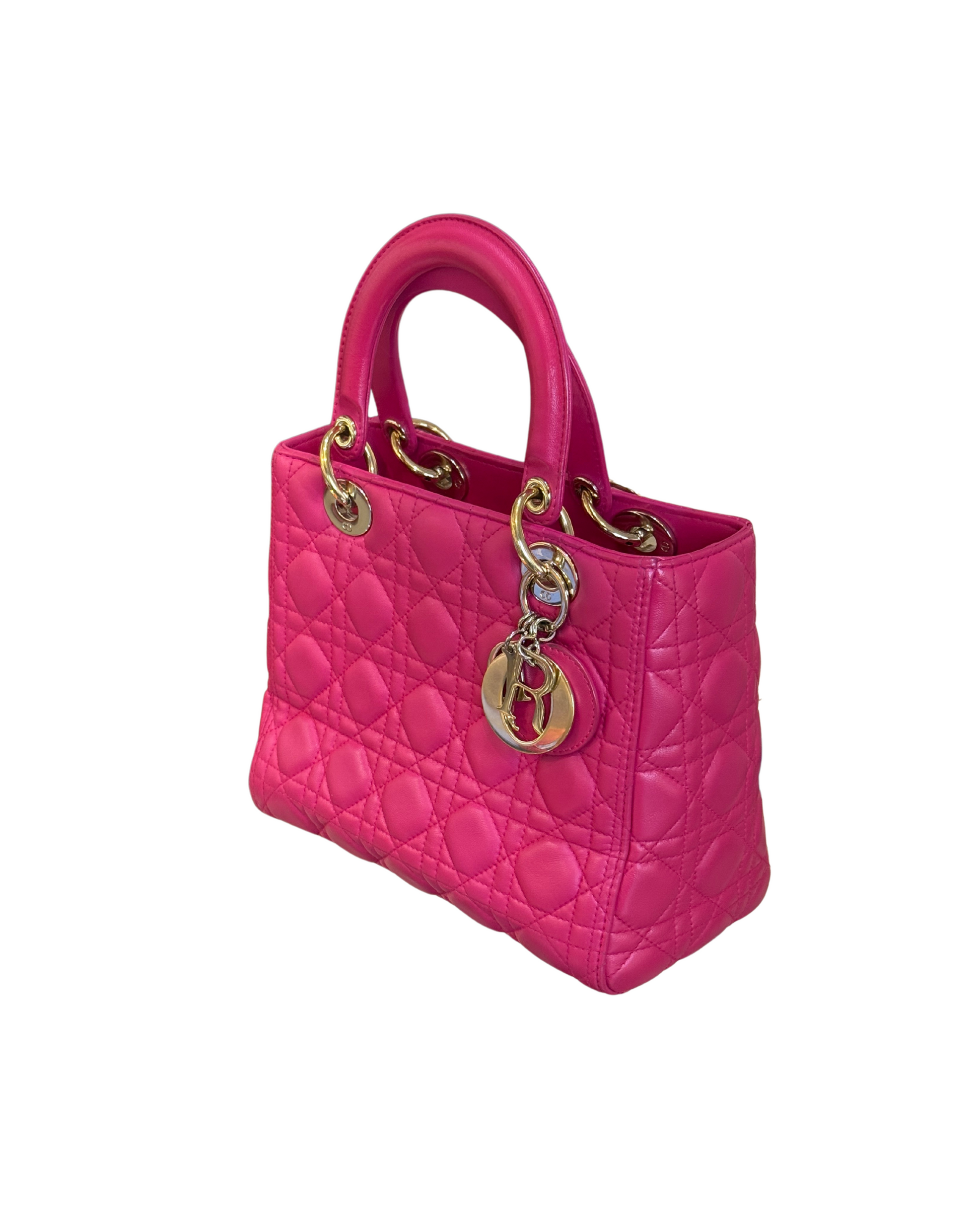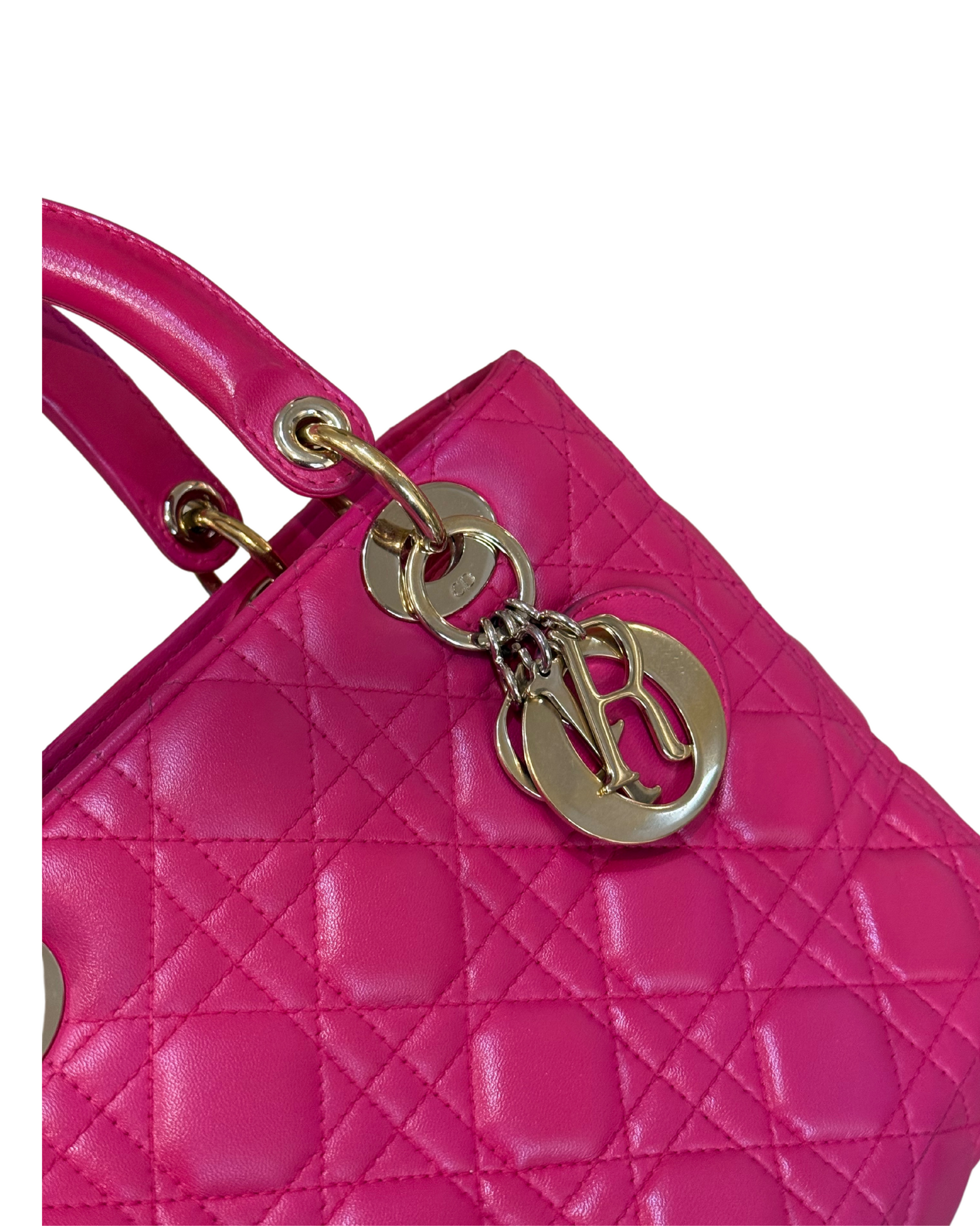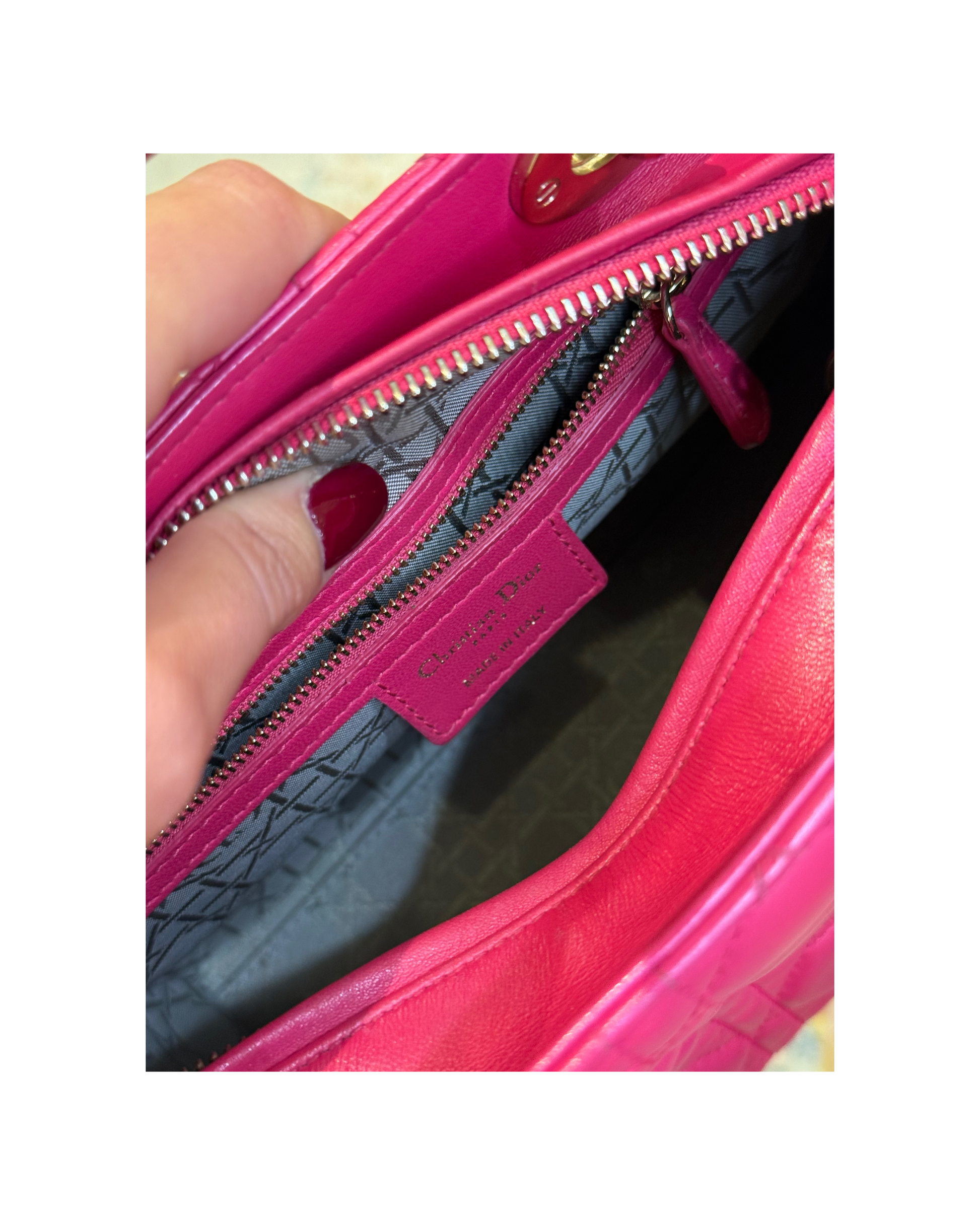 Intramontabile Lady Dior misura media realizzata in pelle di agnello fucsia con cuciture cannage che ricreano l'iconica trama trapuntata. Impreziosita da ciondolo D.I.O.R in metallo dorato.Doppi manici rigidi superiori, tracolla amovibile che consente di indossarla sia a mano che a spalla. Apertura superiore con cerniera, interno in tessuto grigio logato, tasca con cerniera. Quattro piedini d'appoggio. (CODICE: 18-MA-1113)