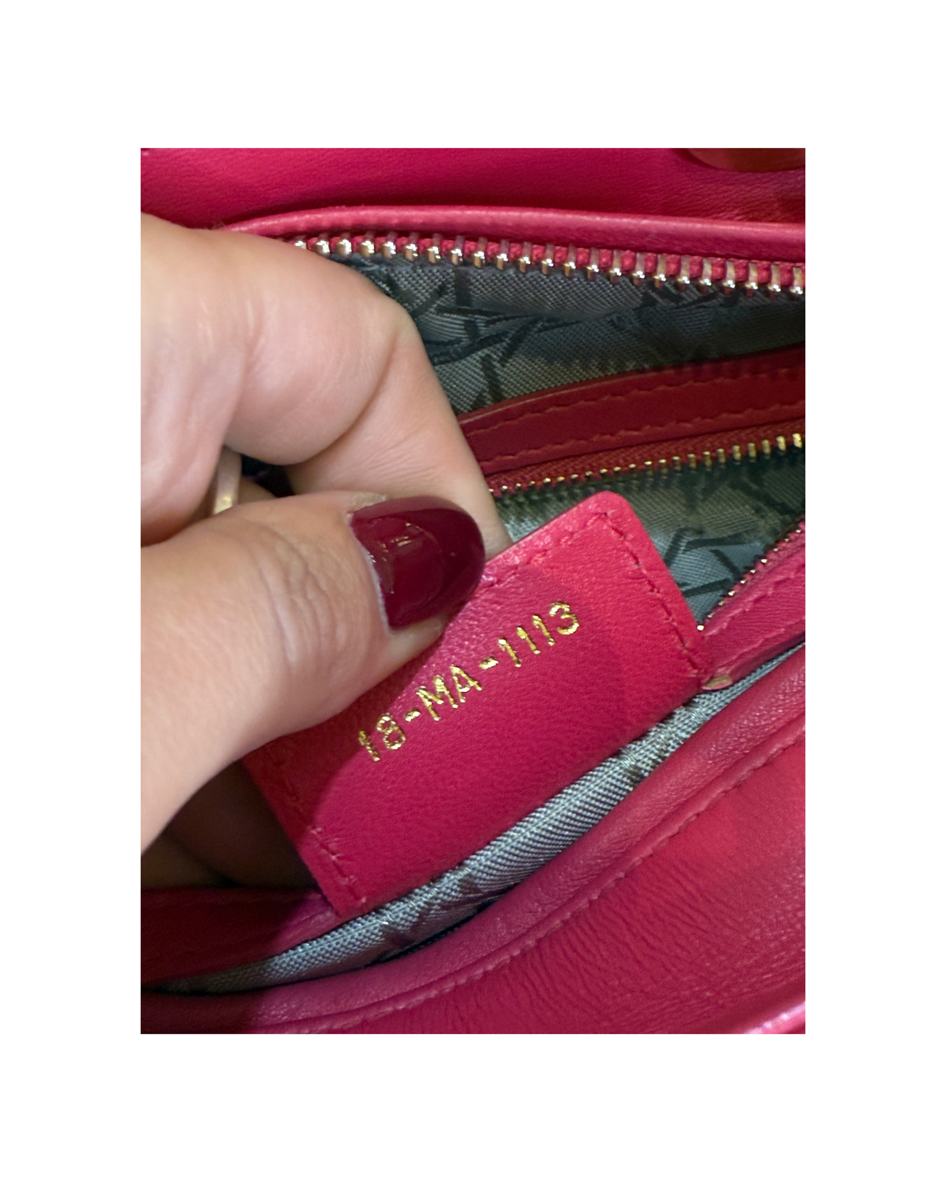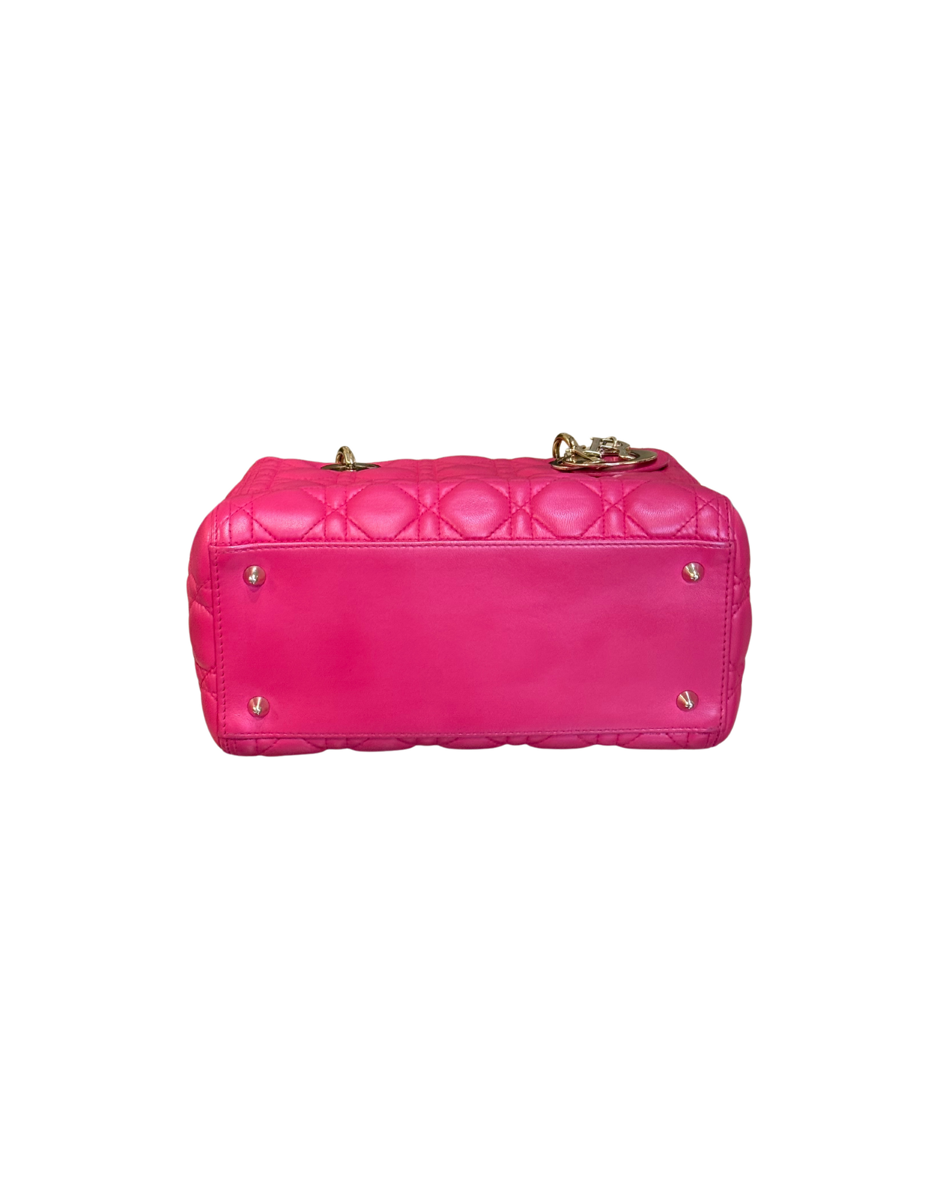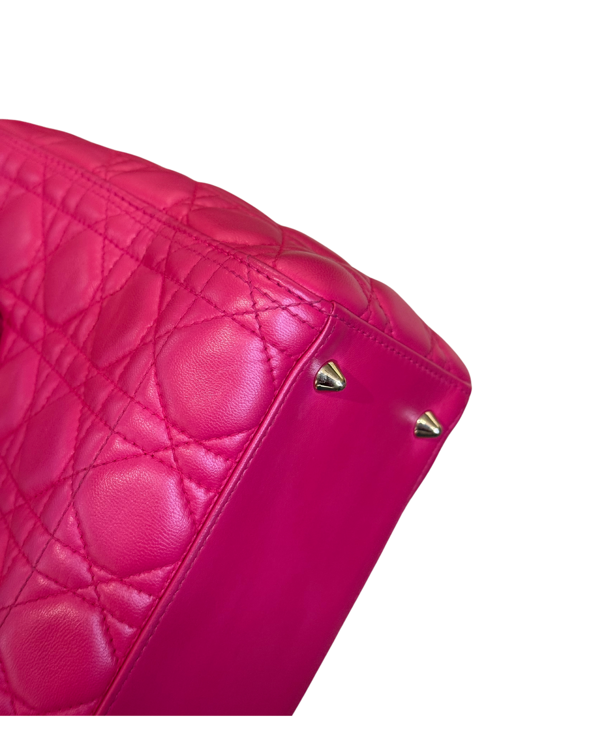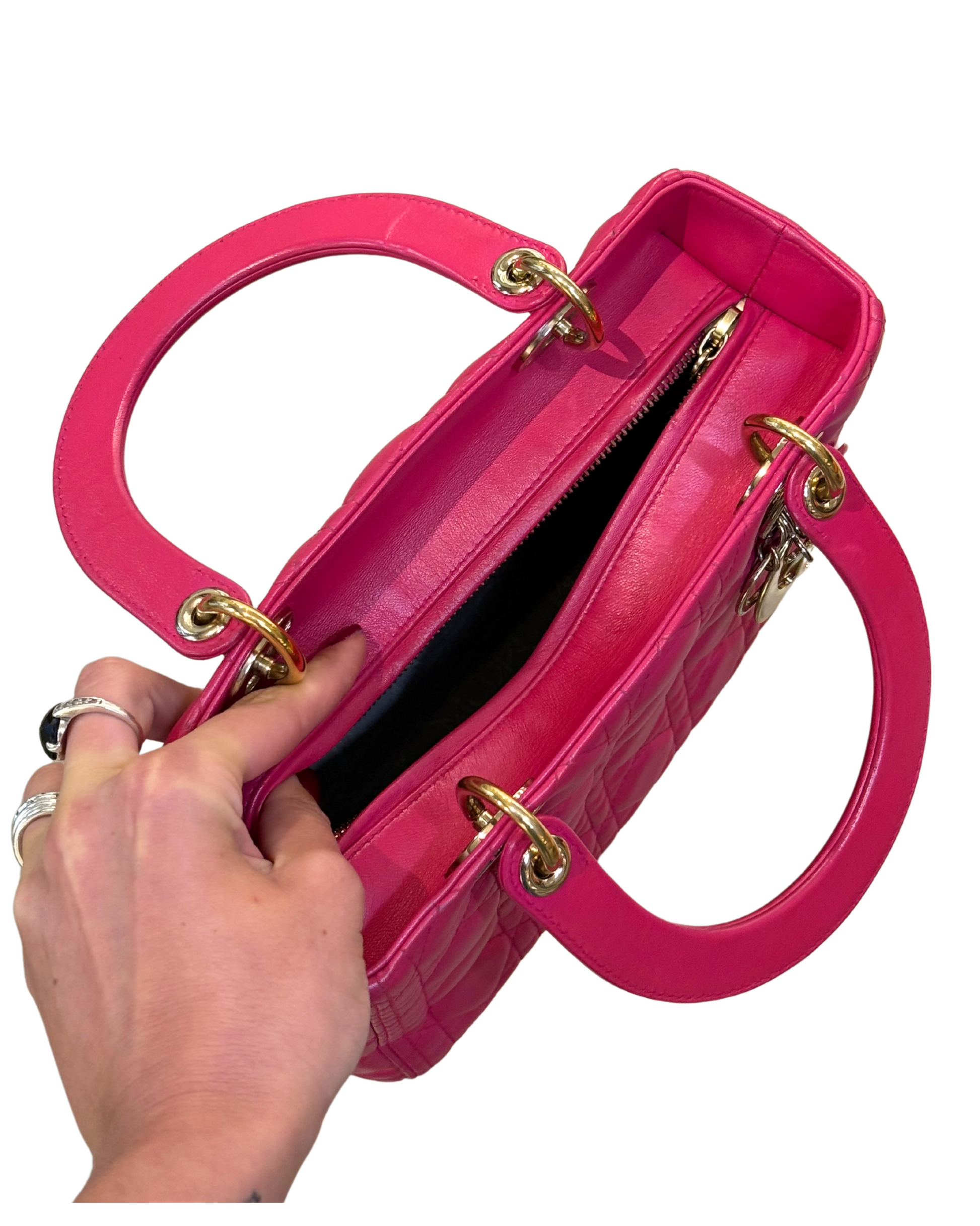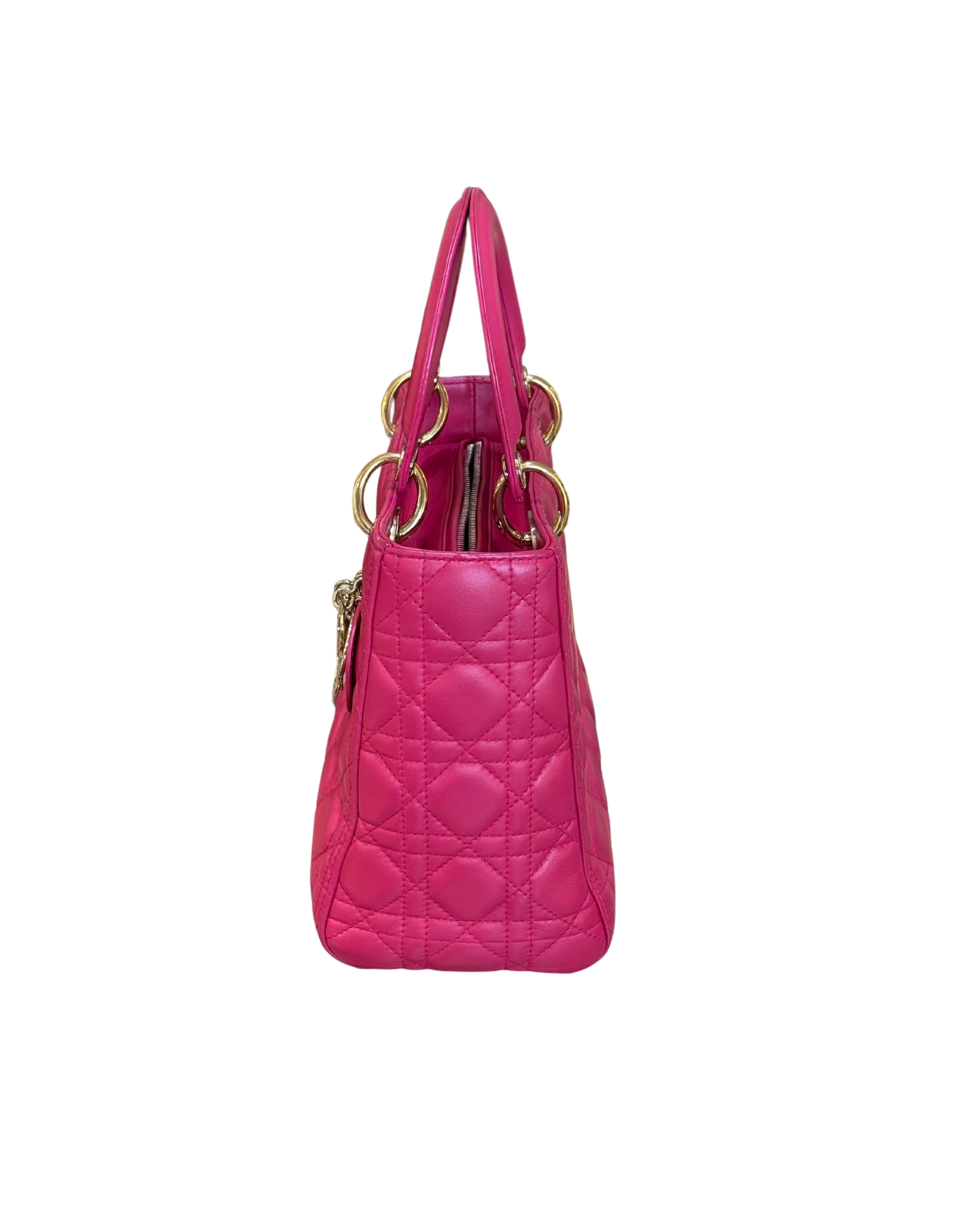 Intramontabile Lady Dior misura media realizzata in pelle di agnello fucsia con cuciture cannage che ricreano l'iconica trama trapuntata. Impreziosita da ciondolo D.I.O.R in metallo dorato.Doppi manici rigidi superiori, tracolla amovibile che consente di indossarla sia a mano che a spalla. Apertura superiore con cerniera, interno in tessuto grigio logato, tasca con cerniera. Quattro piedini d'appoggio. (CODICE: 18-MA-1113)