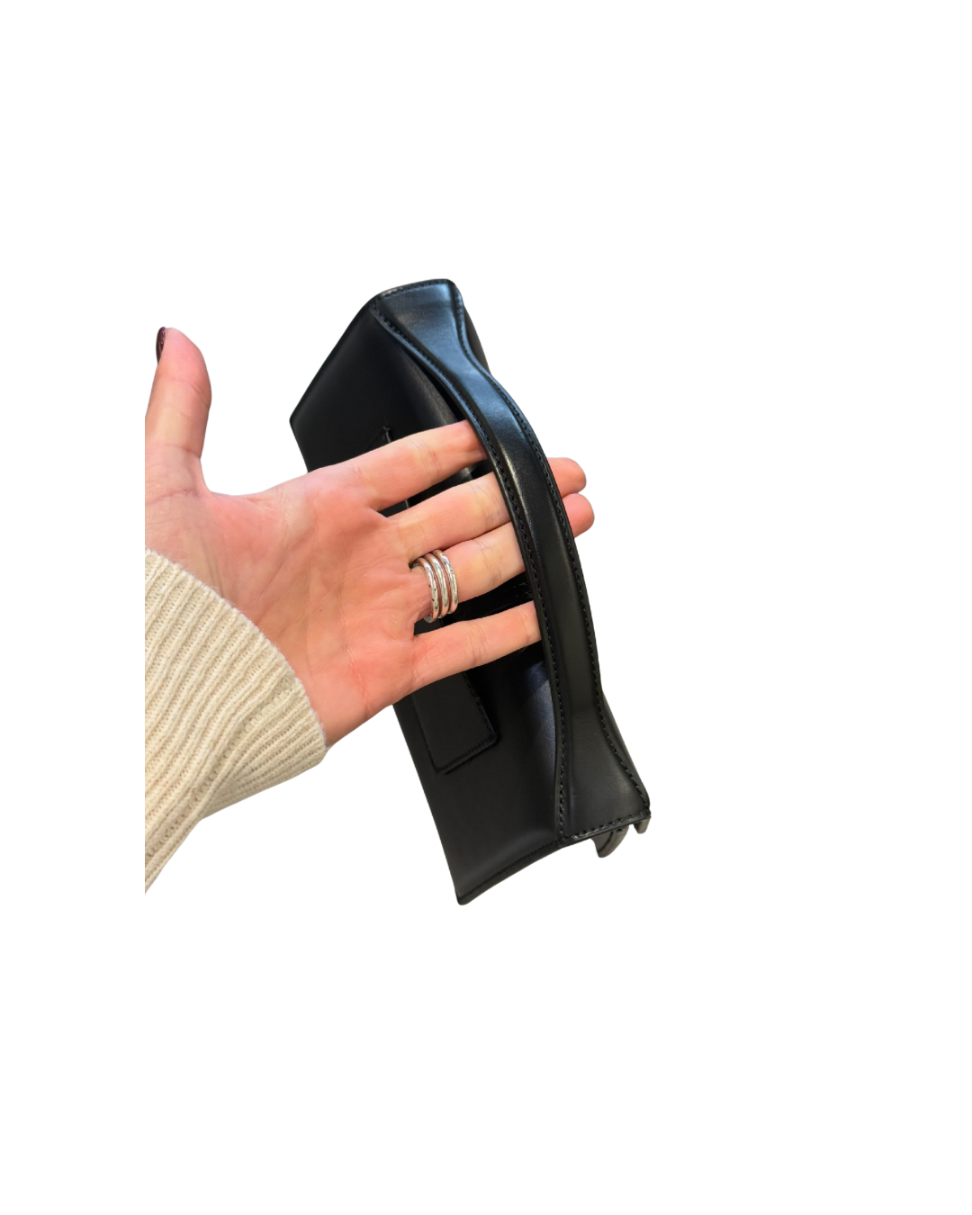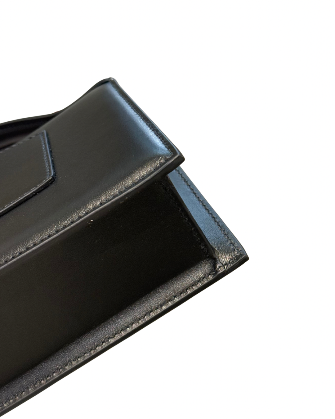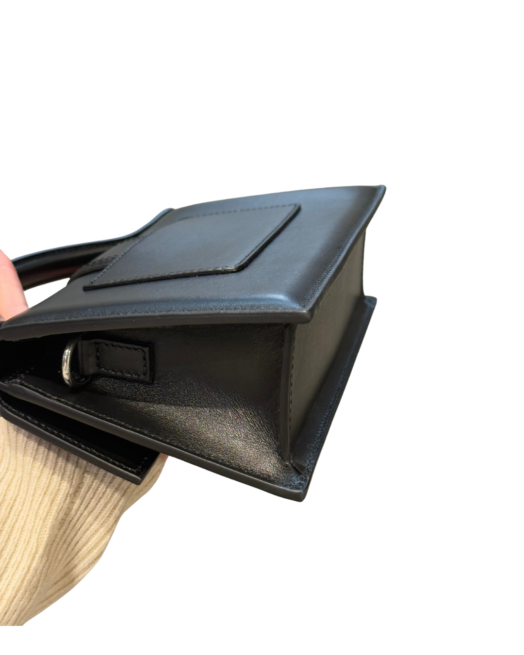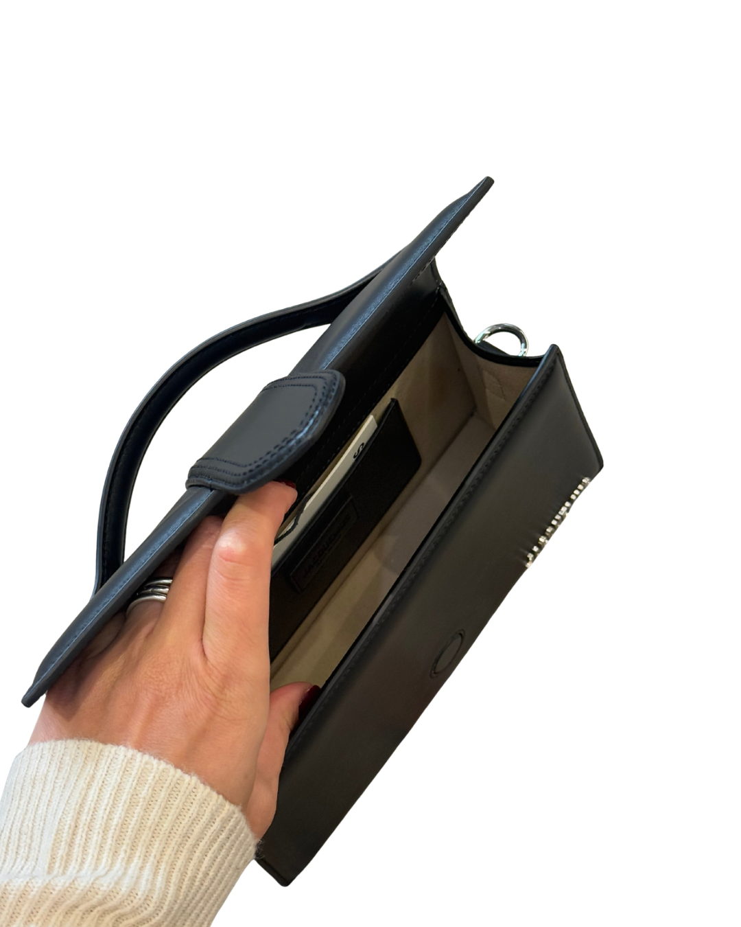 Un design compatto e lineare che racchiude tutta l’eleganza contemporanea di Jacquemus, Le Grand Bambino. Realizzata in pelle nera liscia, questa borsa a mano è caratterizzata da forme geometriche pulite e da un manico superiore strutturato che la rende facile da portare sia di giorno che di sera. La chiusura con pattina frontale e bottone magnetico assicura praticità, mentre l’interno rivestito in tessuto chiaro accoglie l’essenziale con un piccolo scomparto. Sul fronte spicca il logo Jacquemus in metallo argentato, dettaglio iconico che dona un tocco sofisticato e moderno.