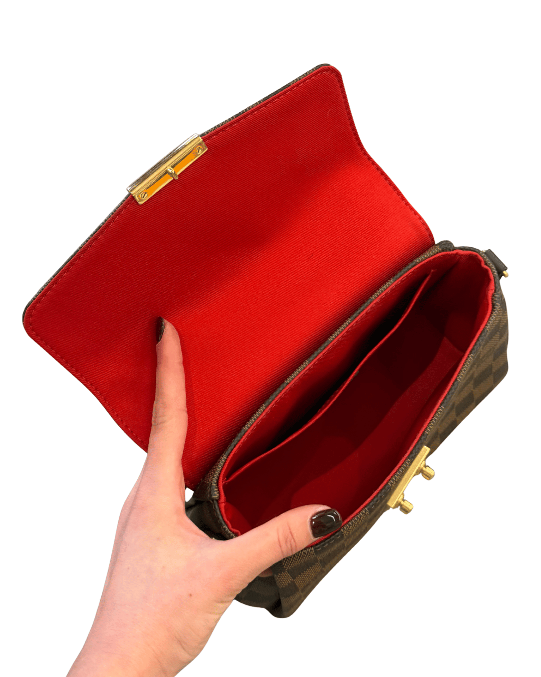 Louis Vuitton Croisette realizzata nell’inconfondibile tela Damier Ebene. Compatta ma sorprendentemente funzionale, presenta un interno in tessuto rosso vivace con tasca piatta, chiusura con elegante hardware dorato e doppia portabilità grazie al manico superiore e alla tracolla regolabile e removibile. ( codice: TR5106)