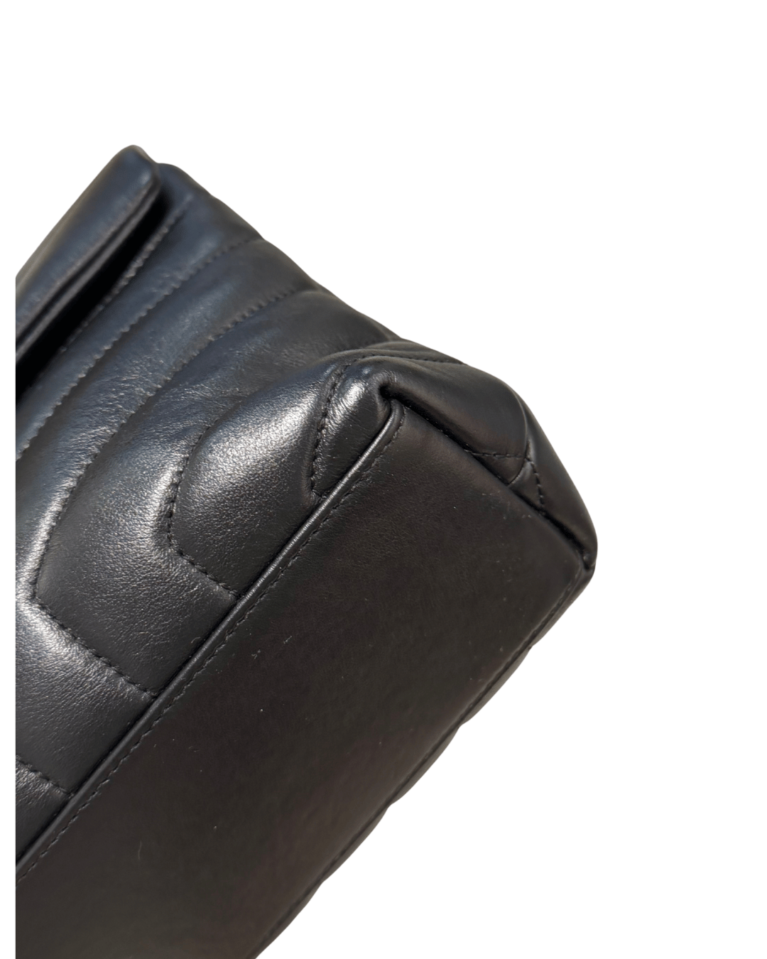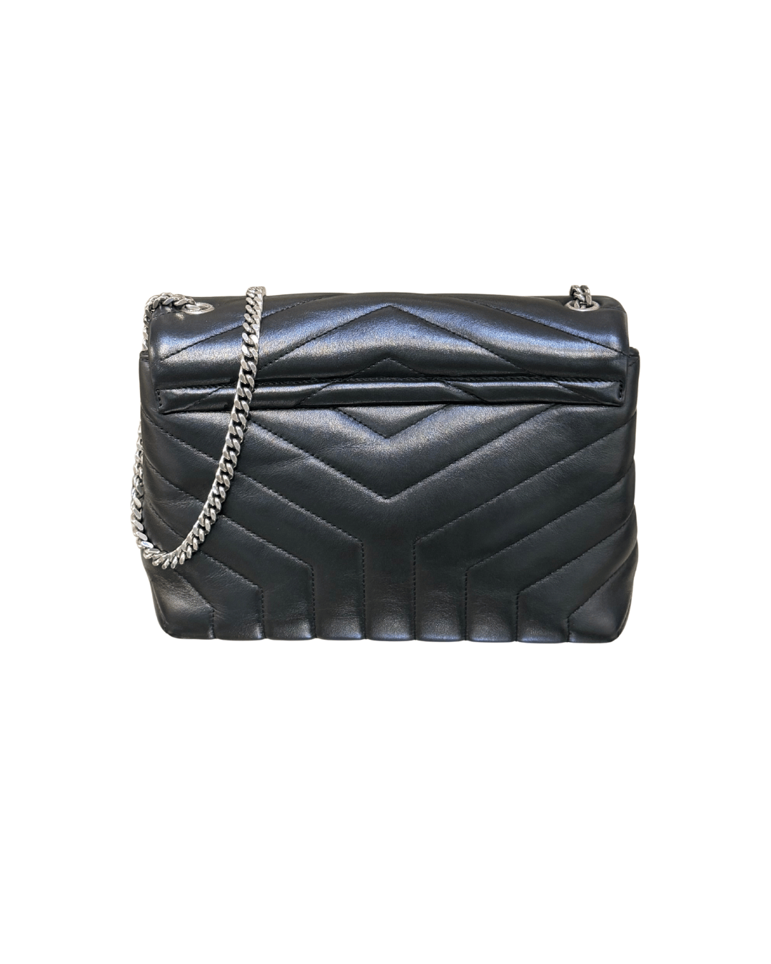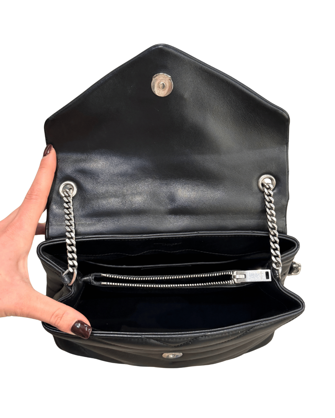 Borsa YSL modello LouLou con iniziali YSL intrecciate in metallo argentato. 100% pelle di vitello liscia nera, fodera gros-grain. Chiusura magnetica. Interno suddiviso in due scomparti da una tasca centrale con cerniera. Tracolla che consente di indossarla a tracolla , non scorrevole. (codice: LND 487218 6717)