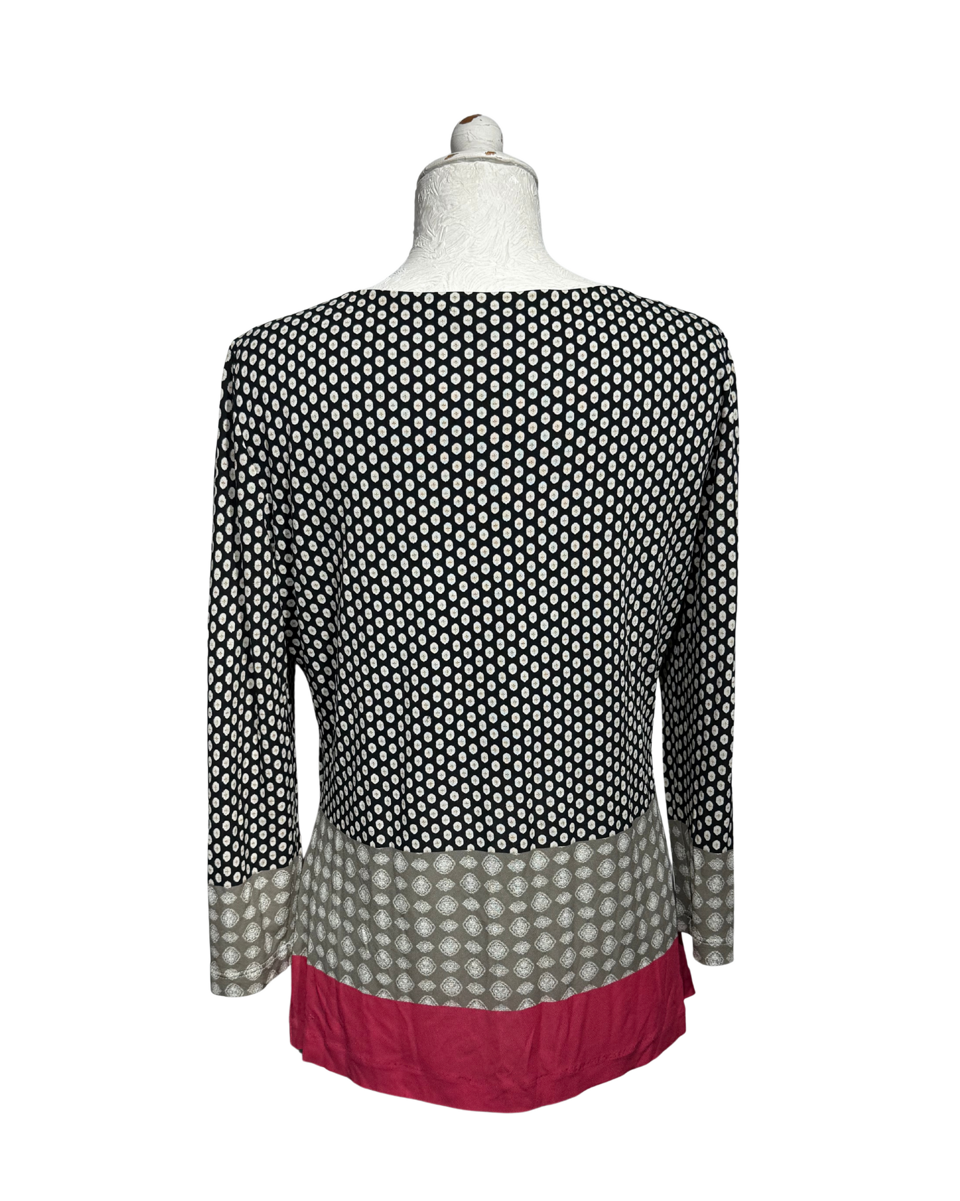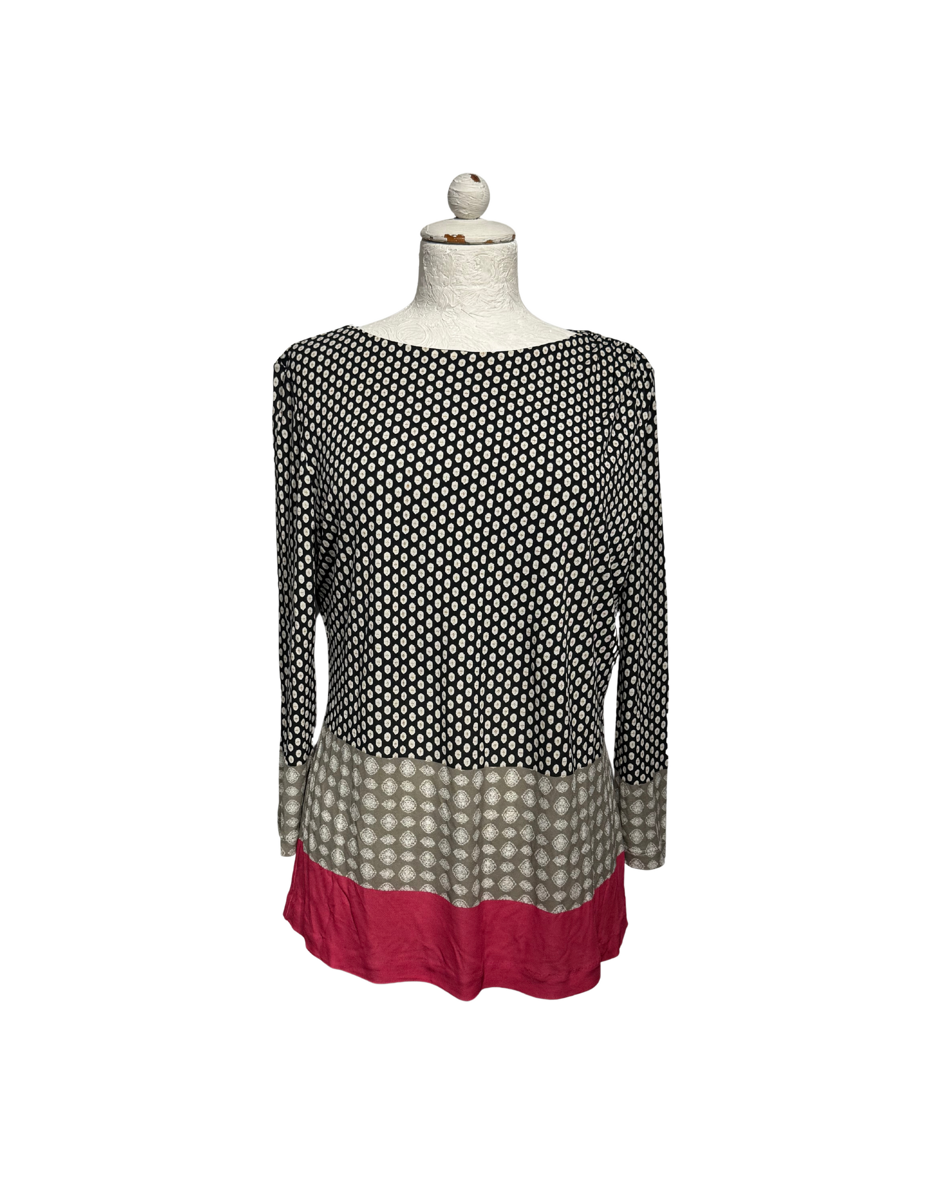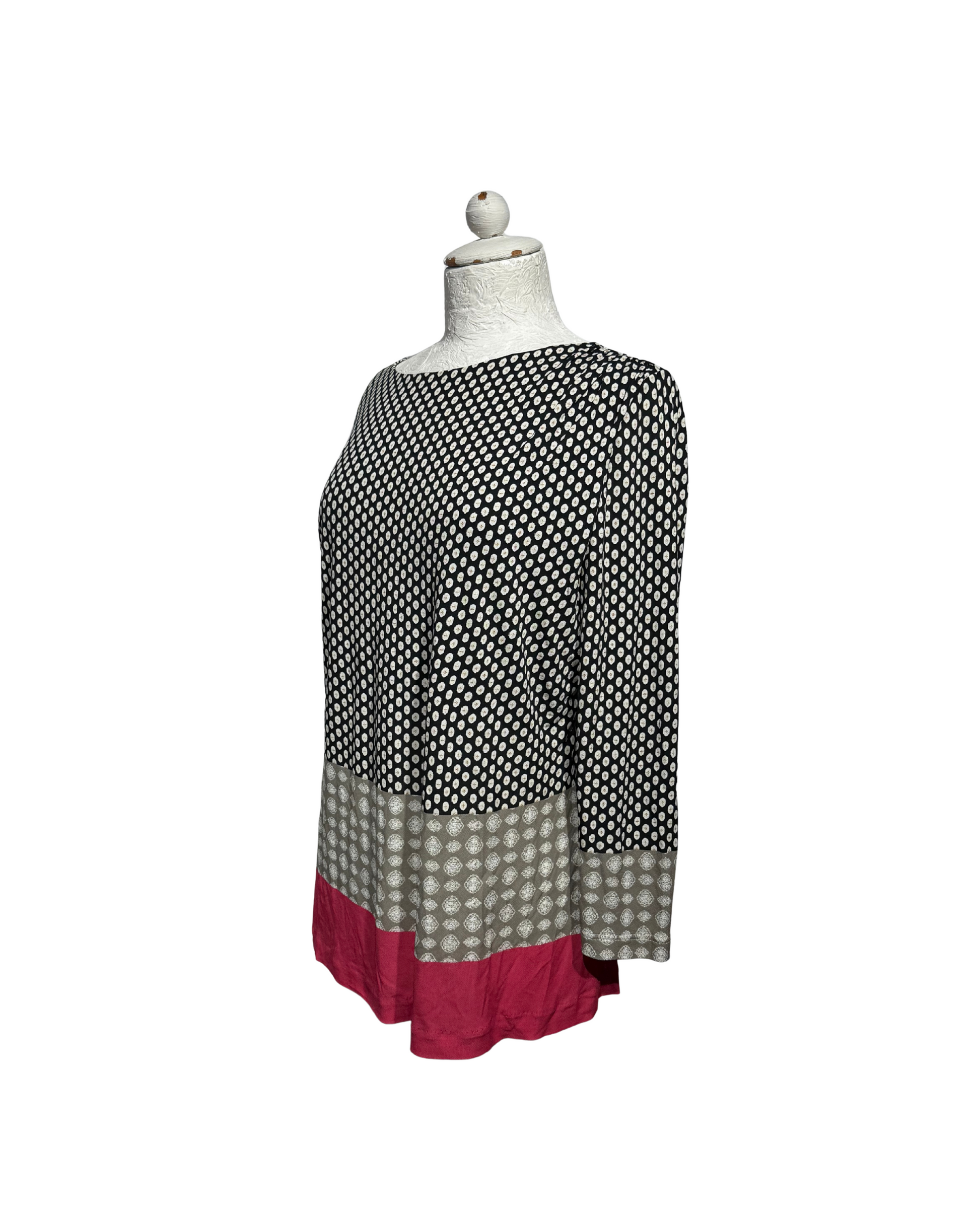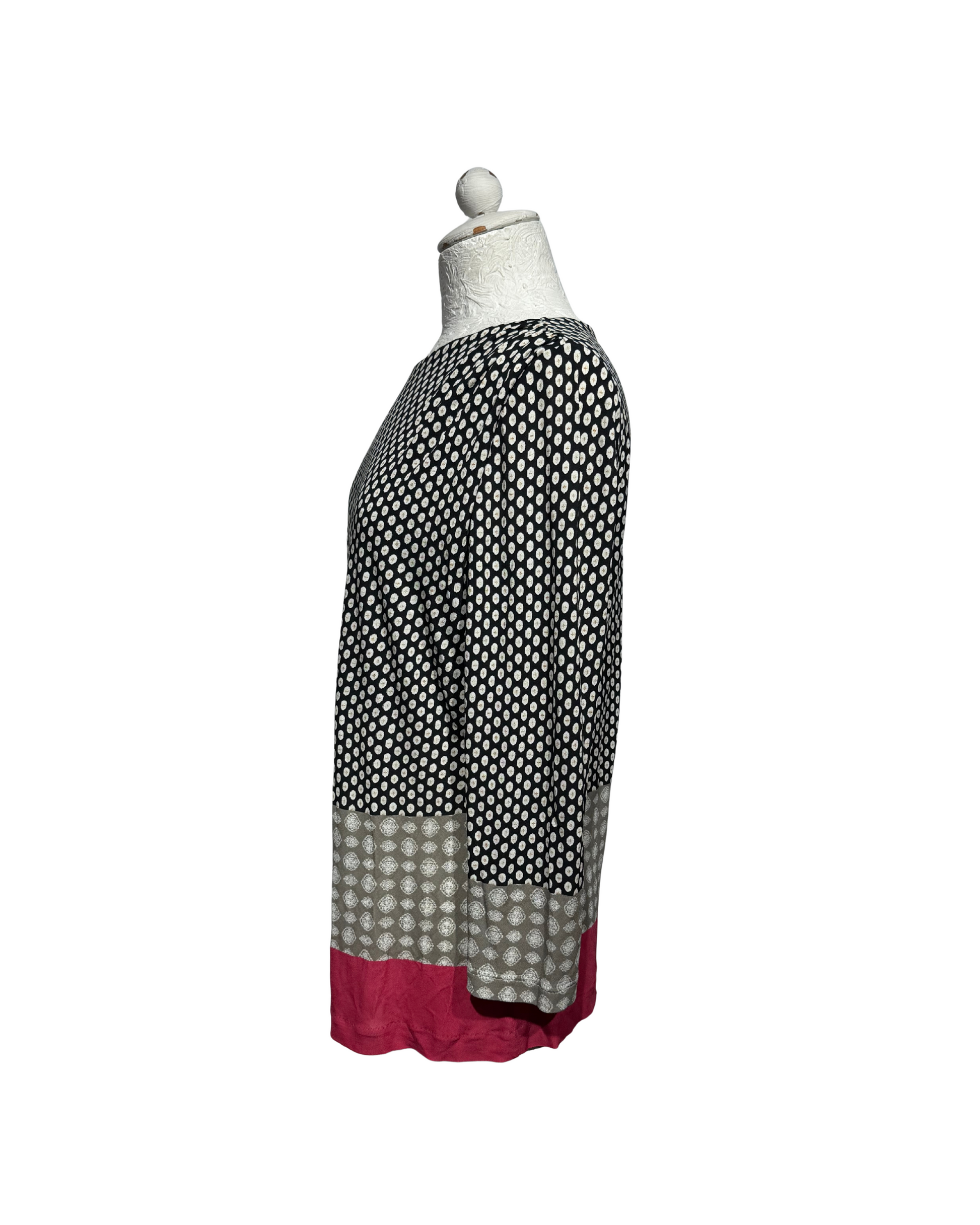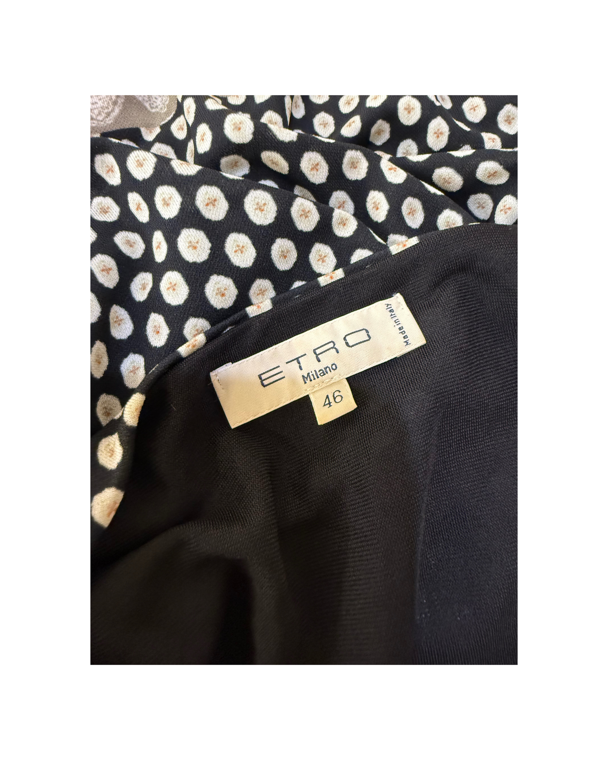 Elegante e raffinata blusa Etro Milano , caratterizzata da una fantasia geometrica a pois bianchi su fondo nero, arricchita da una fascia a contrasto in beige con motivo iconico e un dettaglio finale in rosa acceso che dona un tocco moderno e vivace.