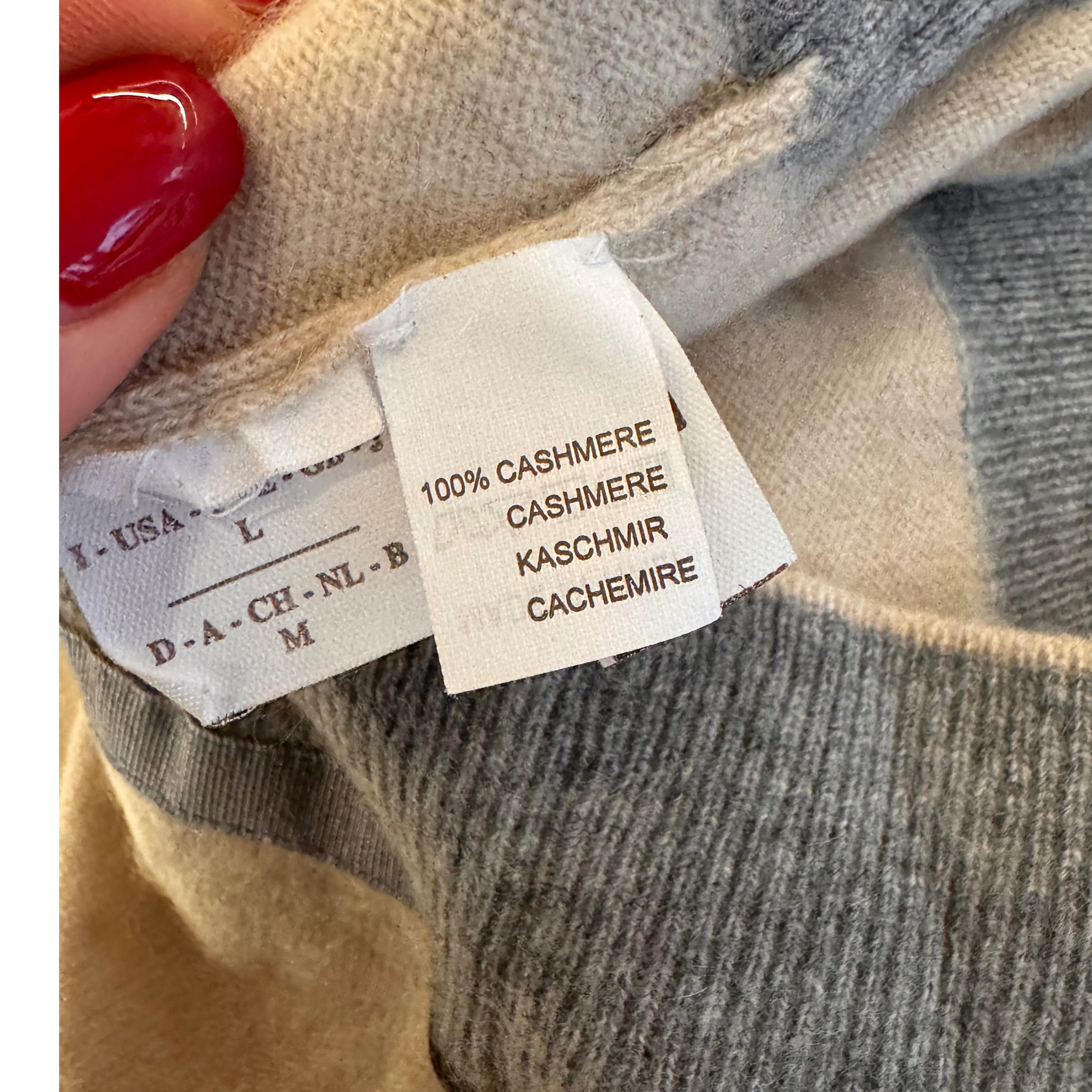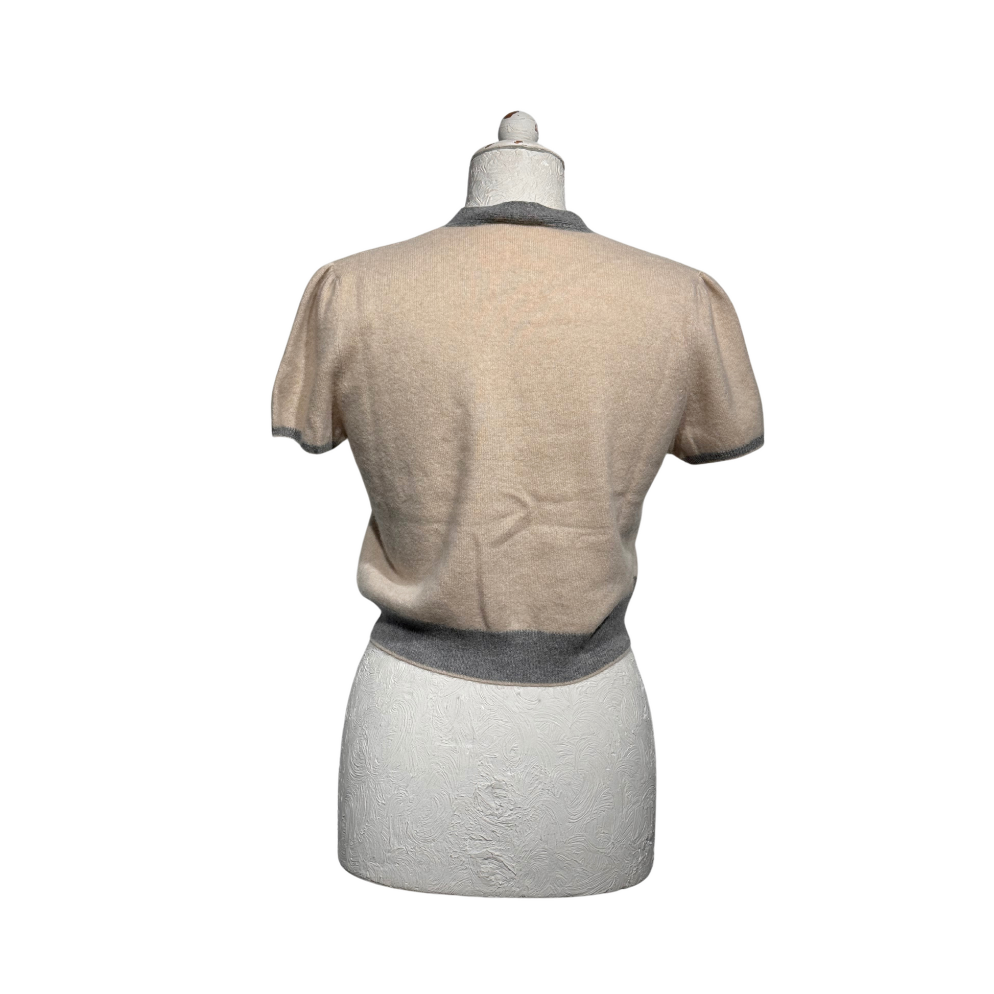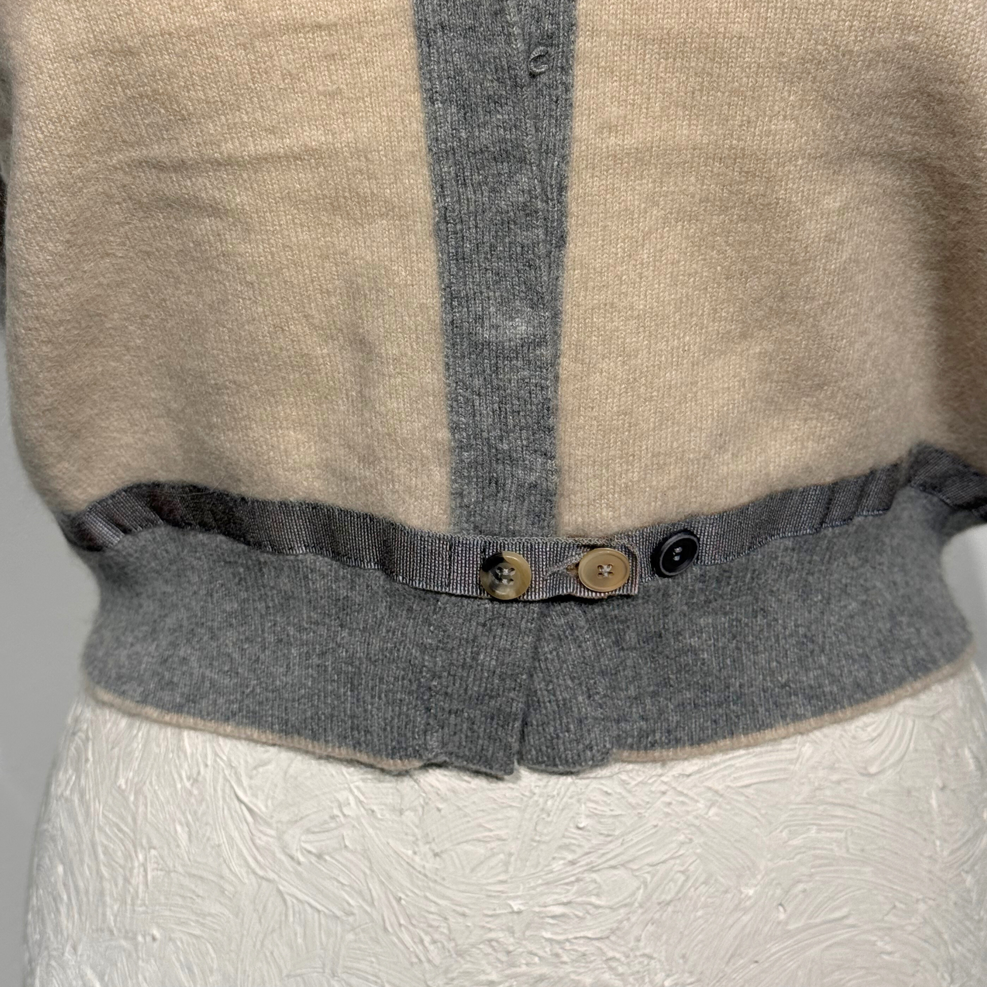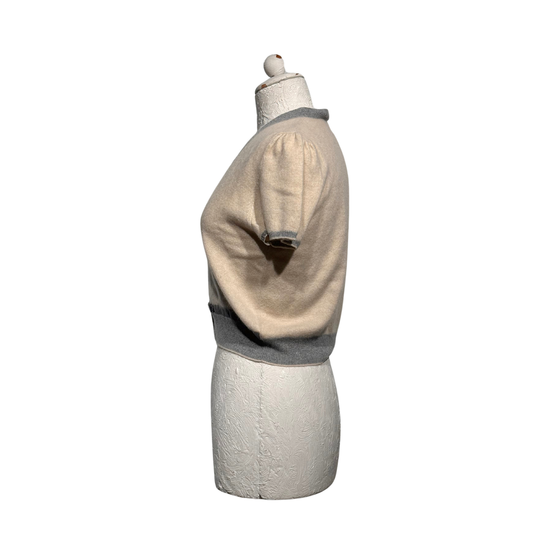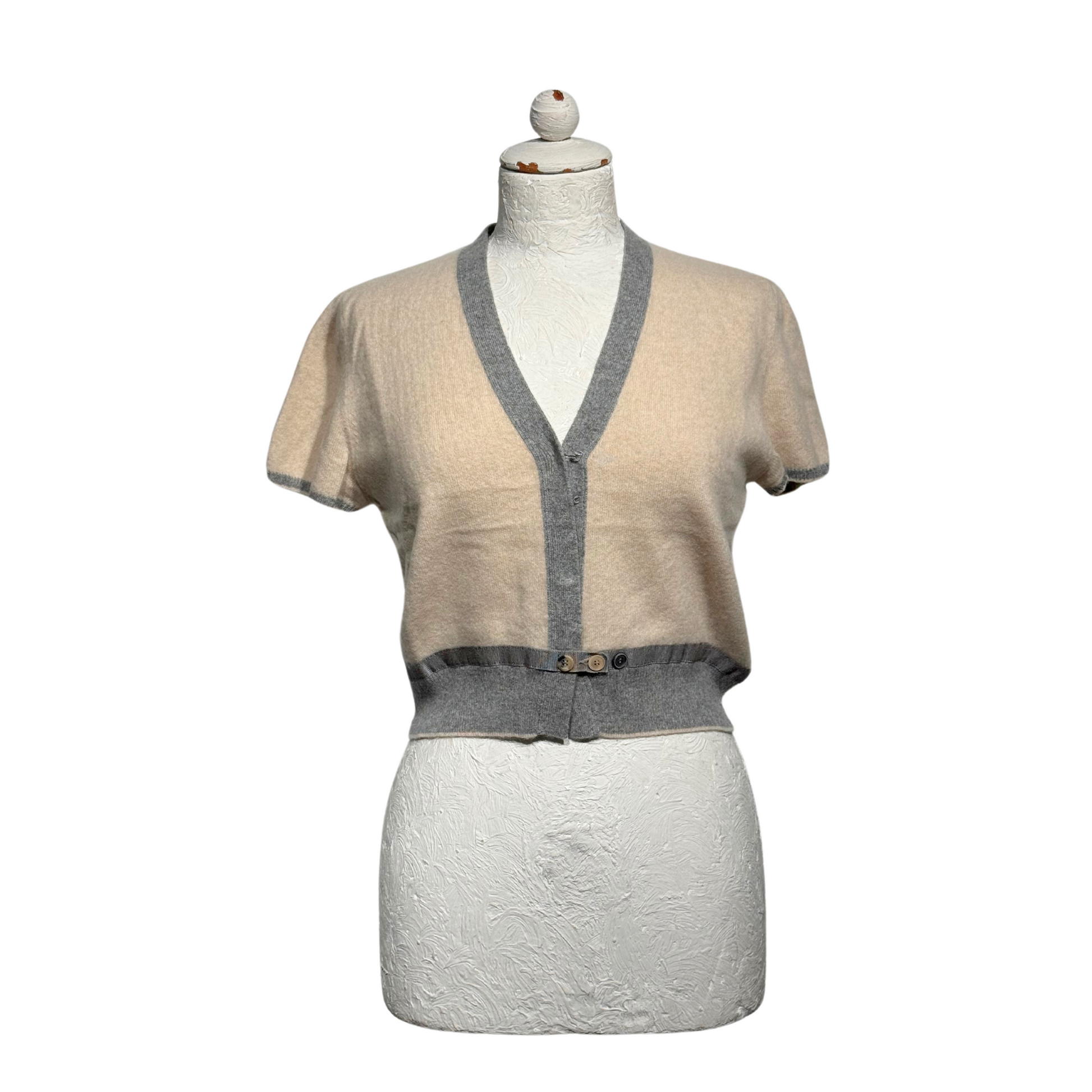 Maglioncino manica corta di Brunello Cucinelli beige con bordini grigi. Scollo a V. Apertura frontale con gancetti. Corto in vita. 100% cashmere
