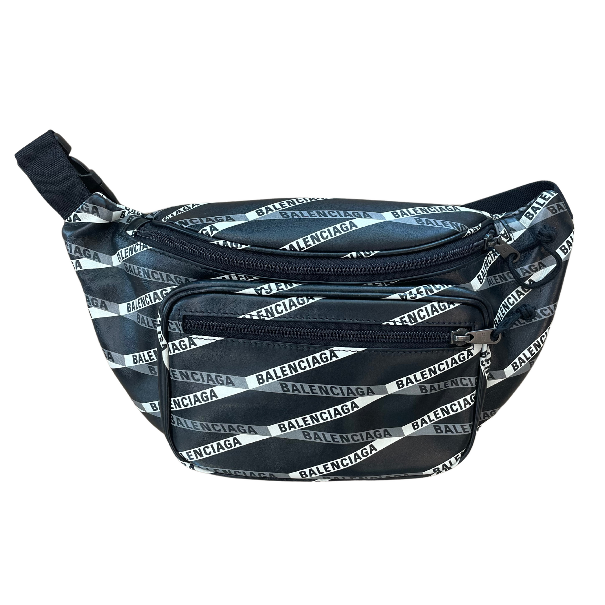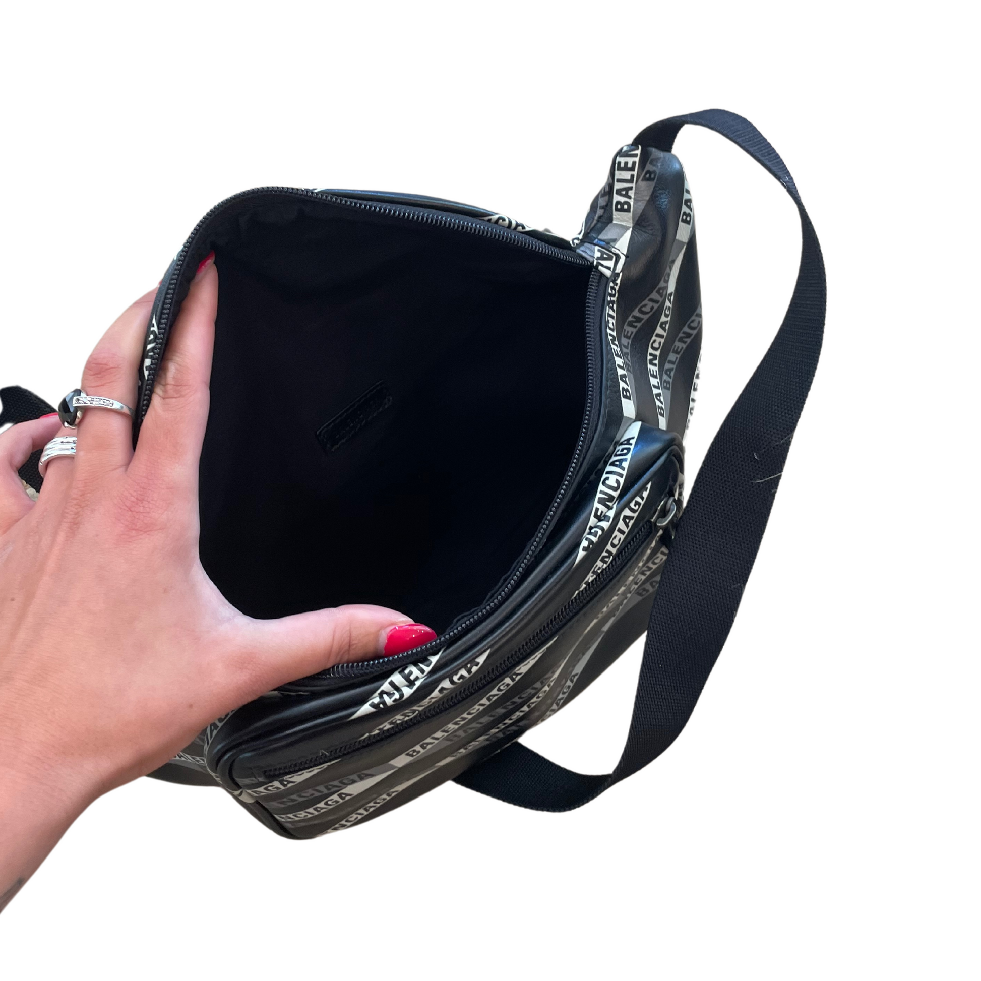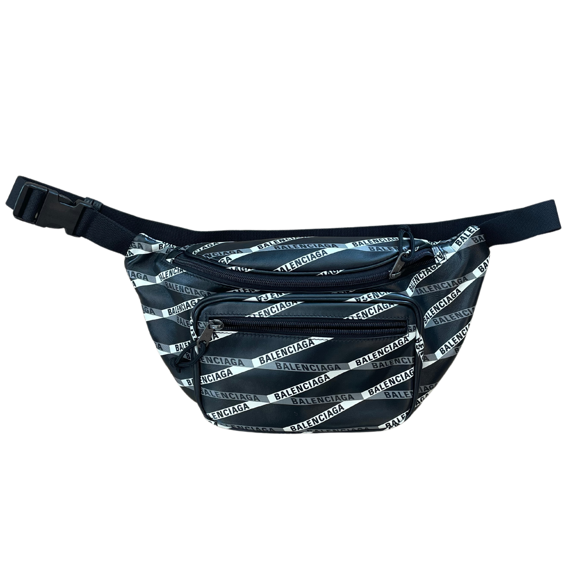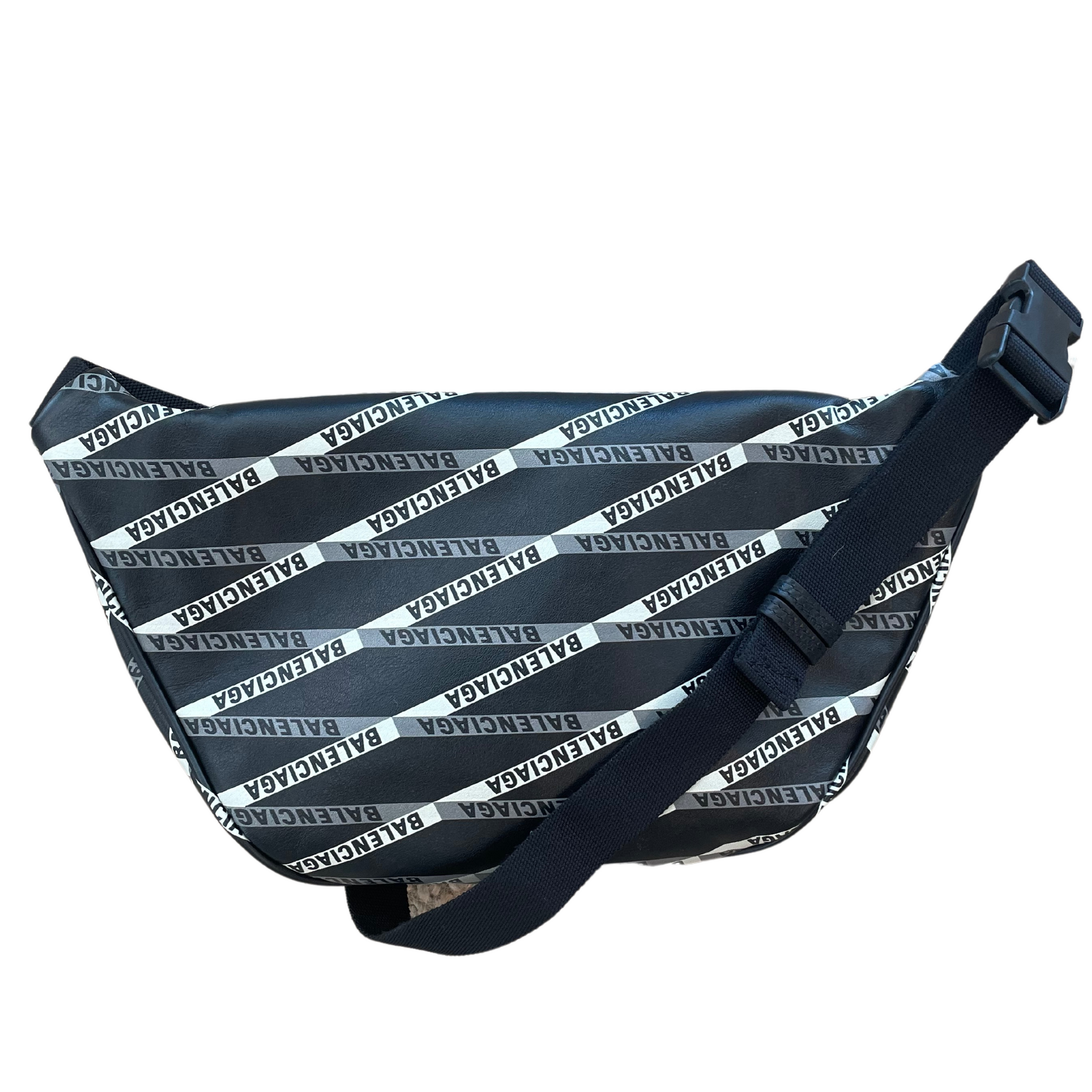 Marsupio Balenciaga in pelle di vitello liscia nera ,stampa logo della maison, strisce bianche e grigie. Tasca esterna frontale. Apertura con cerniera. Interno in tessuto nero . Tracolla regolabile.