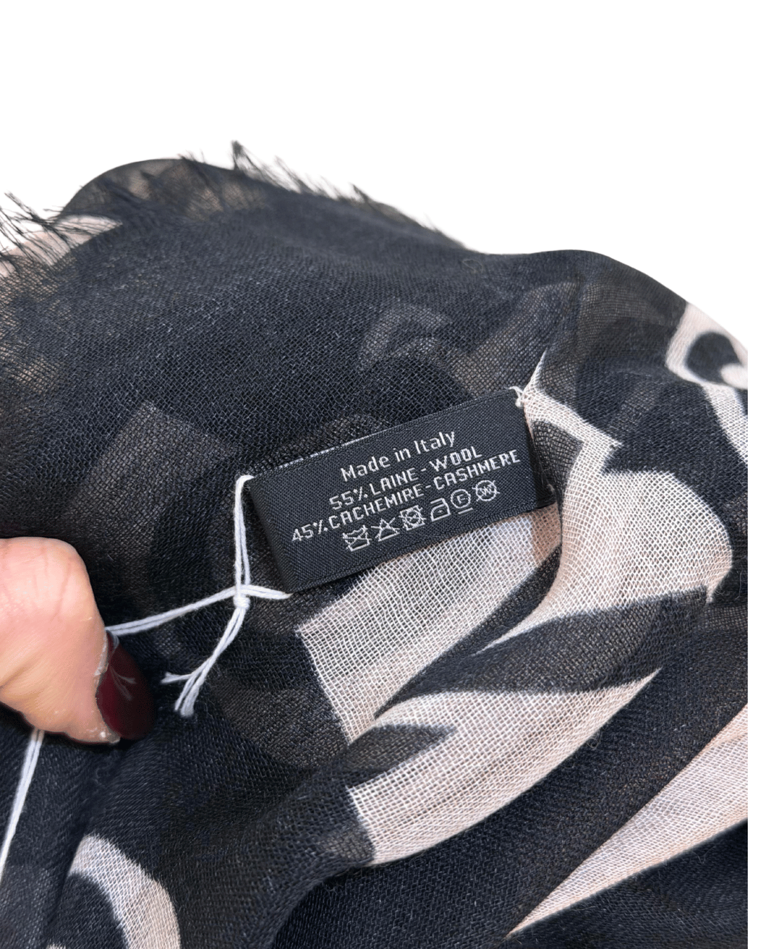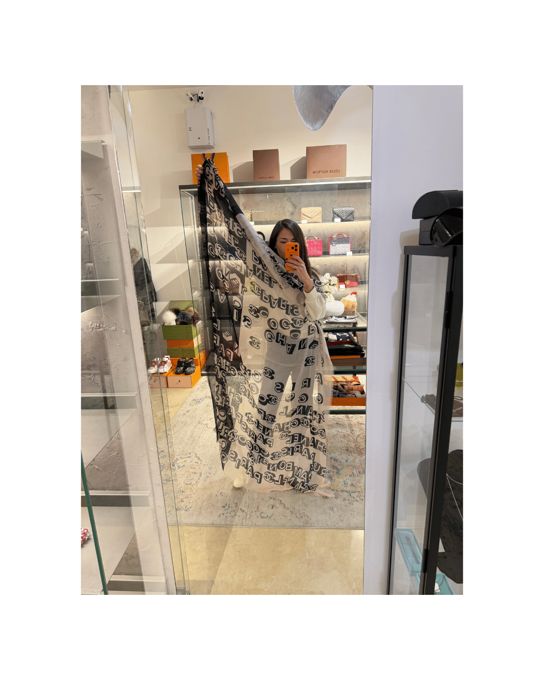 Maxi stola Chanel iconica, realizzata in un pregiato mix di lana (55%) e cashmere(45%), caratterizzata da una grafica bold e contemporanea con maxi scritte CHANEL PARIS e logo CC all-over nei toni del nero, avorio e grigio. Le dimensioni generose permettono di indossarla in molti modi: avvolta come sciarpa, portata morbida sulle spalle come una mantella, oppure utilizzata come vero e proprio elemento protagonista del look. Un accessorio intramontabile, perfetto sia su look casual (denim, maglia, sneakers) sia su outfit più eleganti, capace di elevare immediatamente qualsiasi abbinamento.