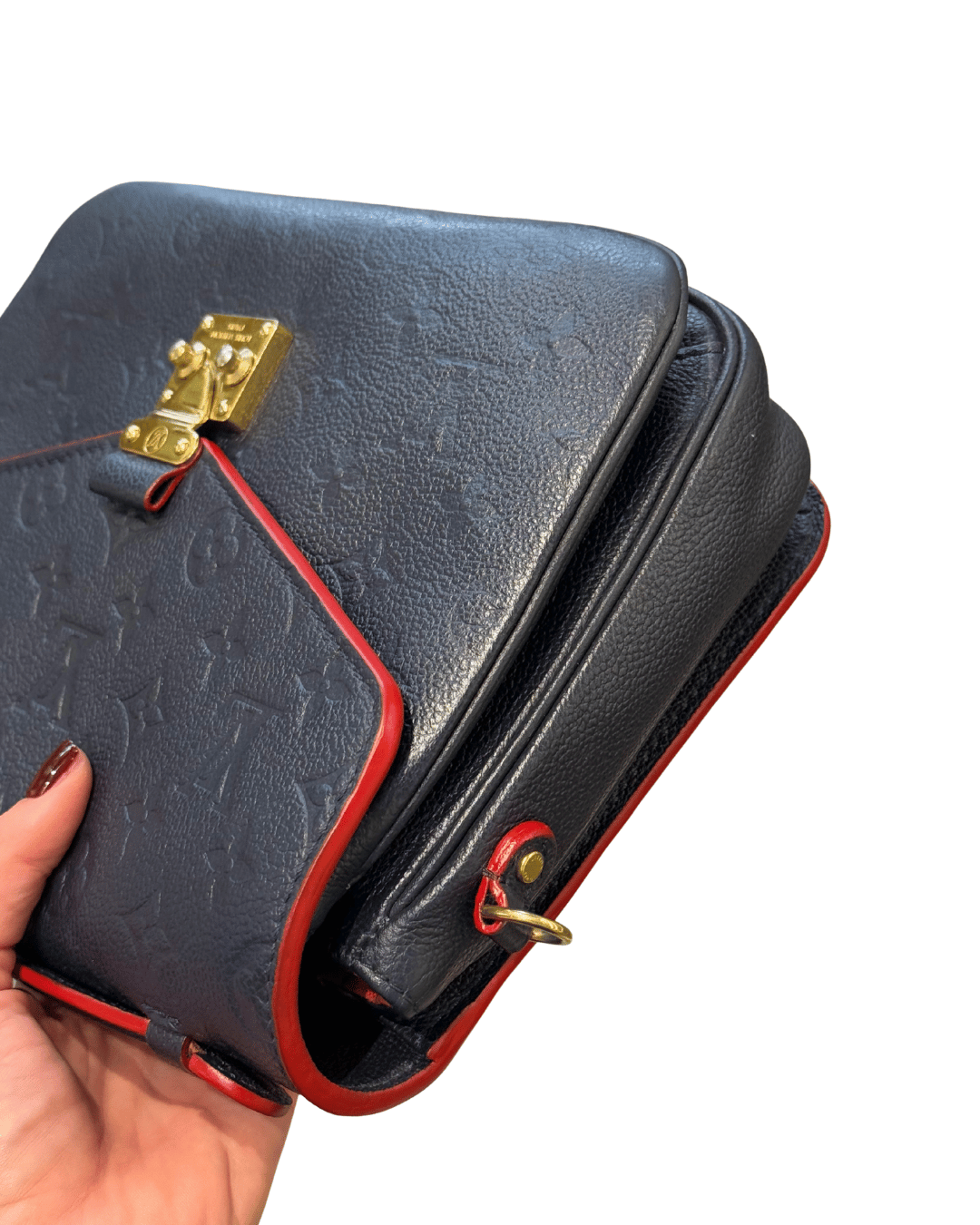 La Louis Vuitton Pochette Métis Empreinte è una delle icone moderne della Maison, amatissima per la sua praticità e il design elegante. Questo modello si distingue per la sua pelle Monogram Empreinte in una raffinata tonalità blu scuro, resa ancora più particolare dai profili rossi a contrasto che le regalano carattere e unicità. Il formato è compatto ma ben organizzato: la chiusura con serratura dorata sul davanti custodisce un interno a tre scomparti, rivestito in tessuto rigato rosso, che permette di mantenere tutto in ordine senza rinunciare allo stile. Può essere portata a spalla o crossbody grazie alla tracolla regolabile, oppure a mano con il piccolo manico superiore, rendendola estremamente versatile per il giorno e la sera.(codice: GI0290)