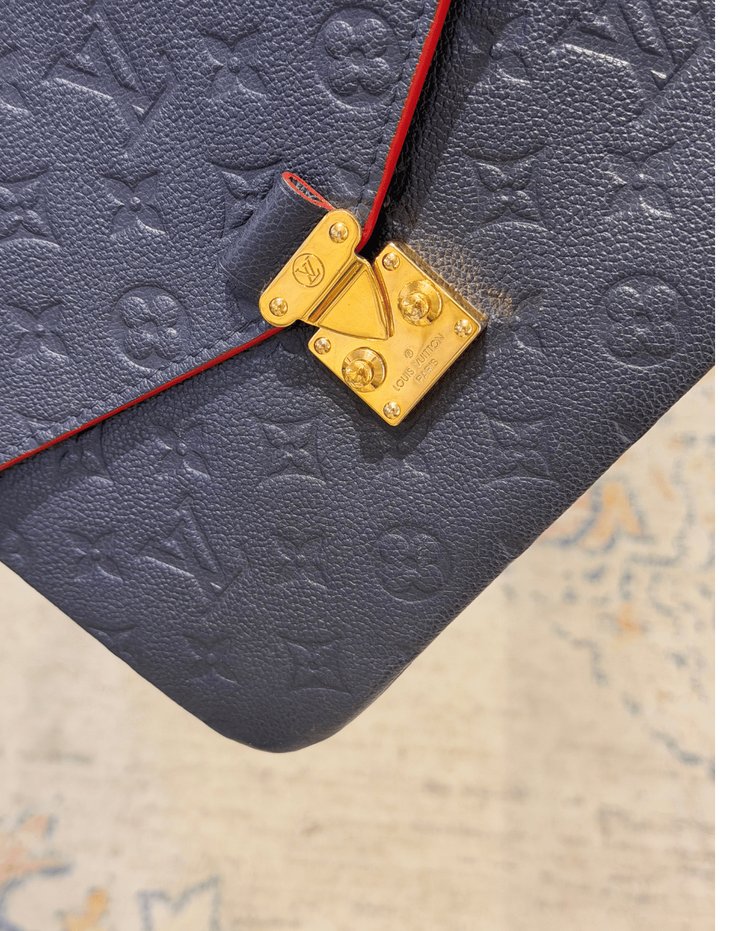 La Louis Vuitton Pochette Métis Empreinte è una delle icone moderne della Maison, amatissima per la sua praticità e il design elegante. Questo modello si distingue per la sua pelle Monogram Empreinte in una raffinata tonalità blu scuro, resa ancora più particolare dai profili rossi a contrasto che le regalano carattere e unicità. Il formato è compatto ma ben organizzato: la chiusura con serratura dorata sul davanti custodisce un interno a tre scomparti, rivestito in tessuto rigato rosso, che permette di mantenere tutto in ordine senza rinunciare allo stile. Può essere portata a spalla o crossbody grazie alla tracolla regolabile, oppure a mano con il piccolo manico superiore, rendendola estremamente versatile per il giorno e la sera.(codice: SD2240)
