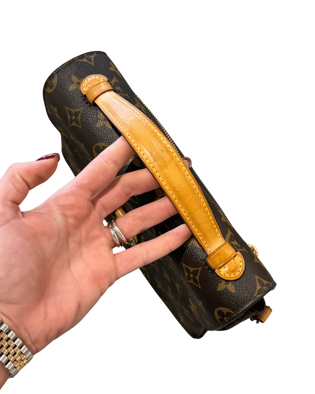 Pochette Metis in tela monogram. Tasca esterna con zip, finiture in vacchetta naturale . Parti metalliche dorate. Interno in alcantara marrone suddiviso in tre scomparti. Tracolla regolabile ad amovibile . ( codice: DU3165)