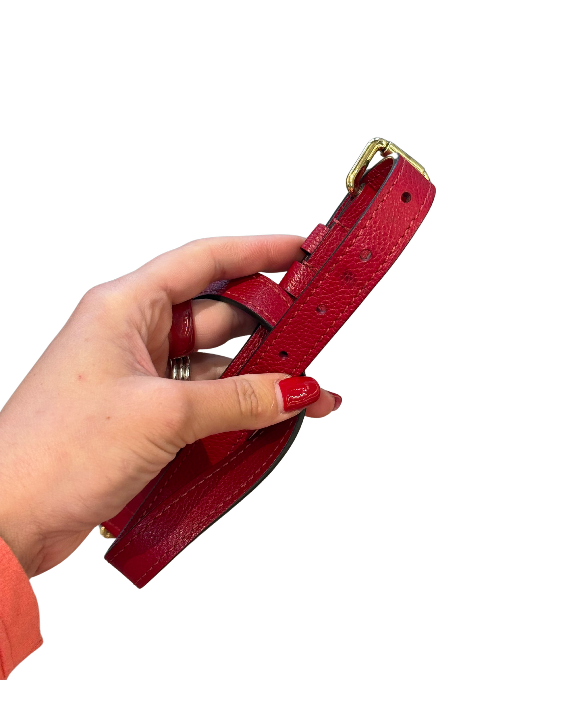 METIS LOUIS VUITTON in pelle empreinte rossa. Il manico superiore e la tracolla amovibile consentono di portare l'accessorio in modi differenti. Finiture in morbida vacchetta pieno fiore. Fodera in tessuto a righe rossa e nera. Parti metalliche dorate. Sistema di chiusura a scatto. Tre scomparti interni. Tasca esterna con zip. (CODICE: AR5129)