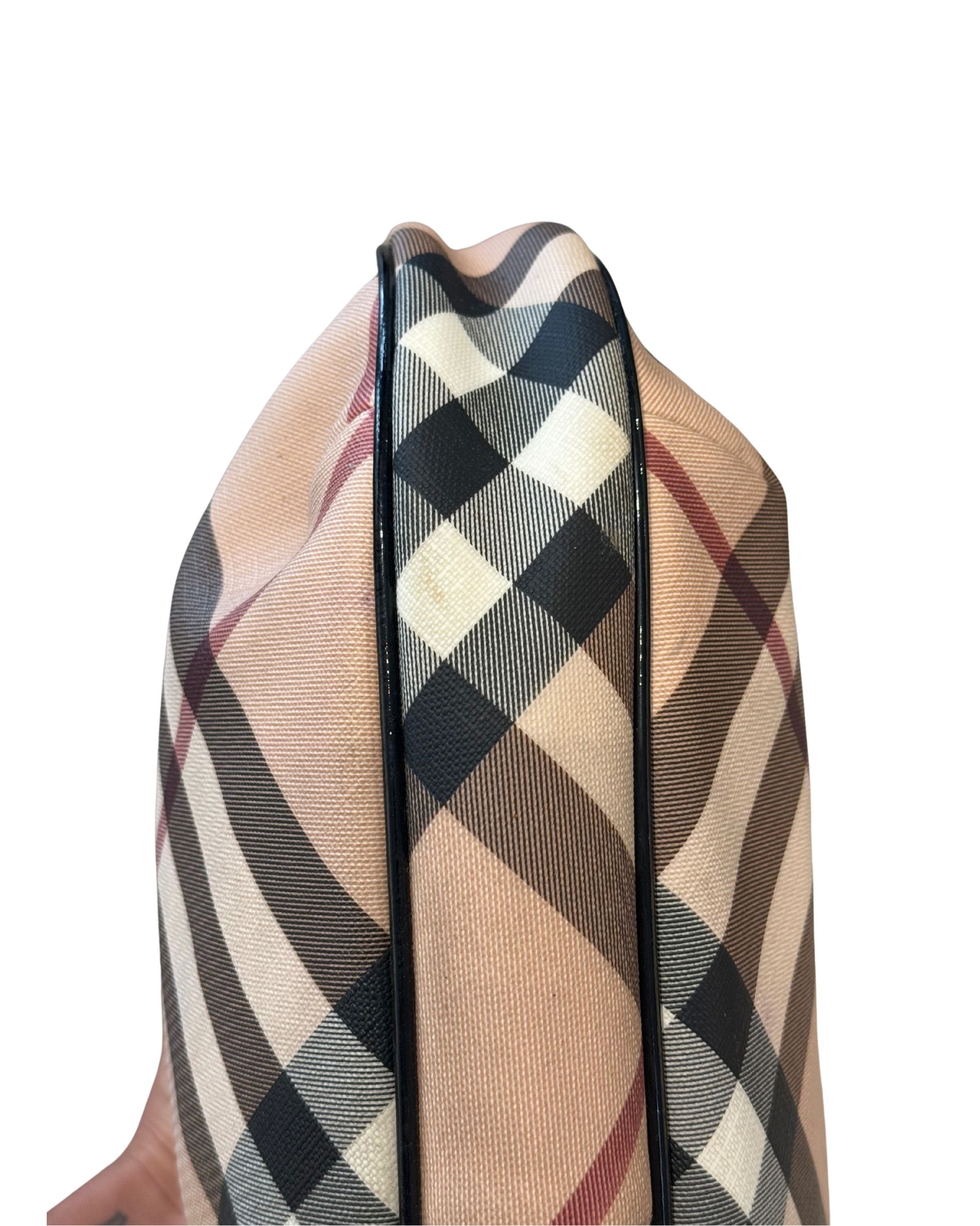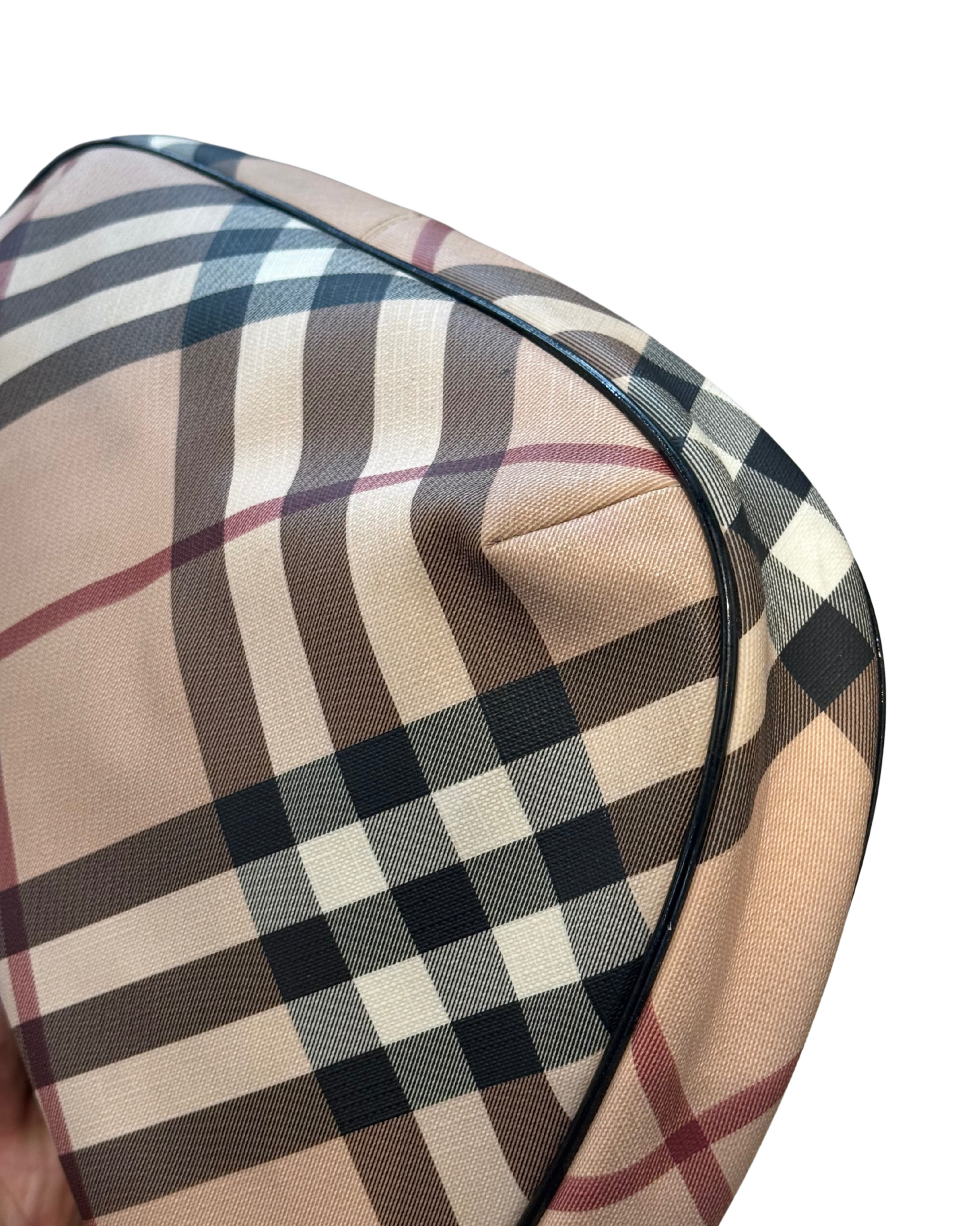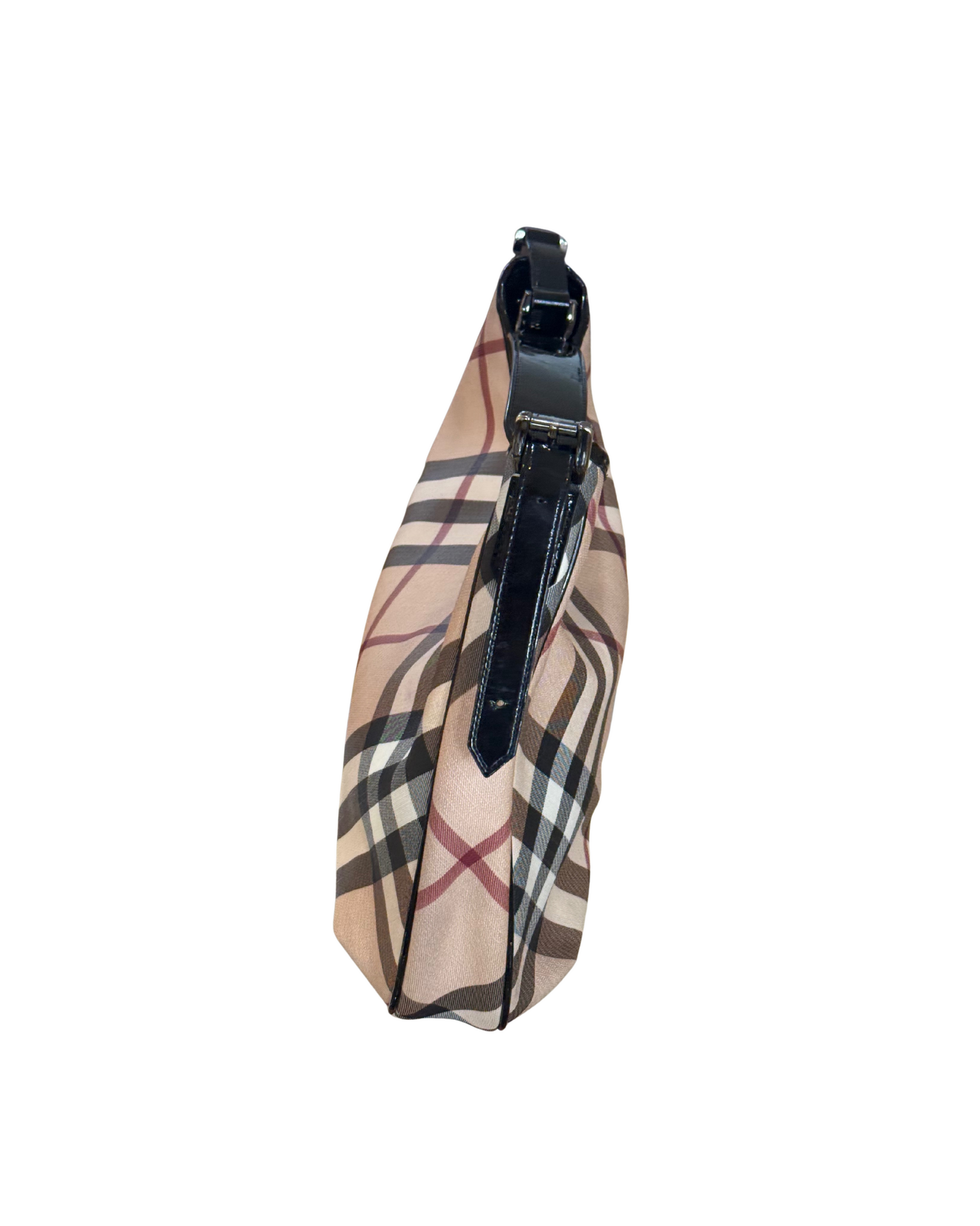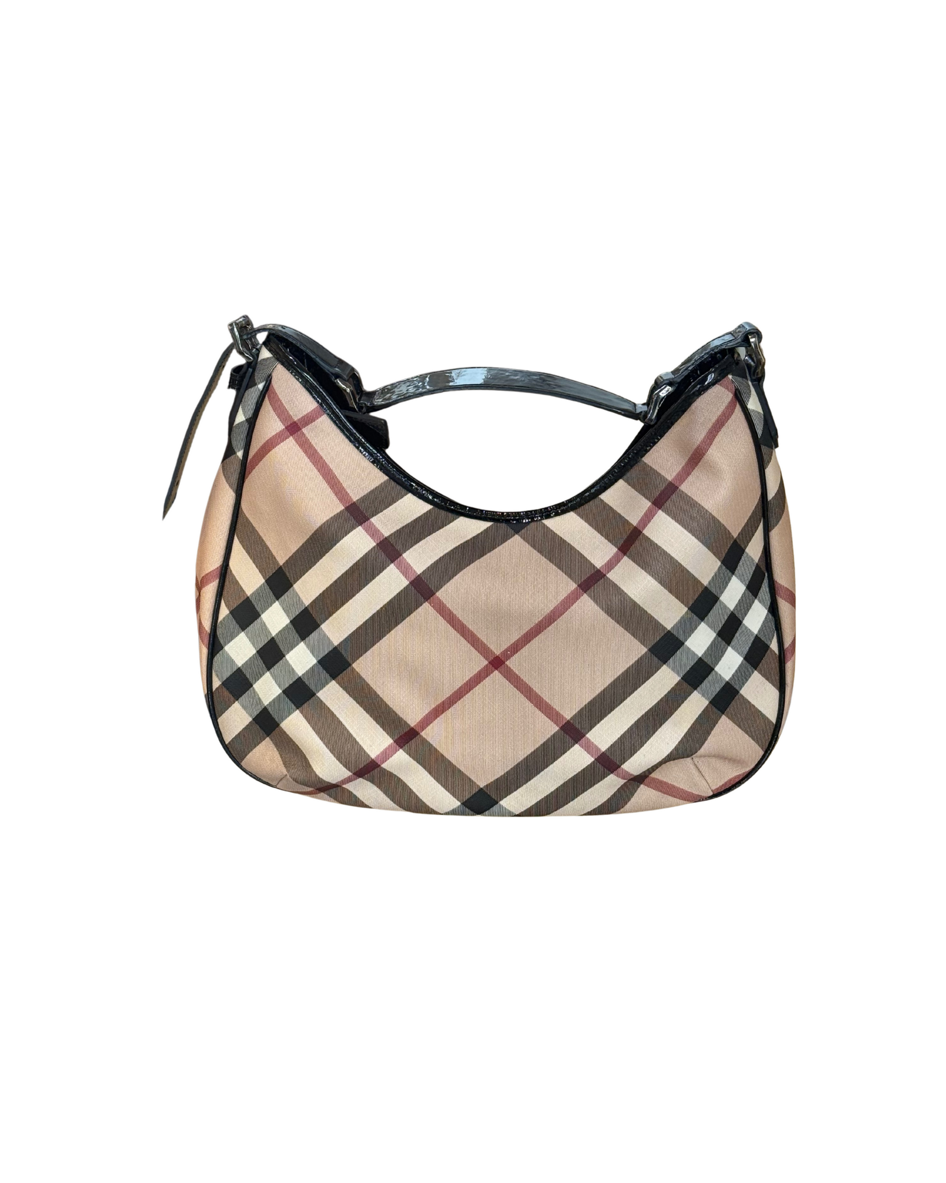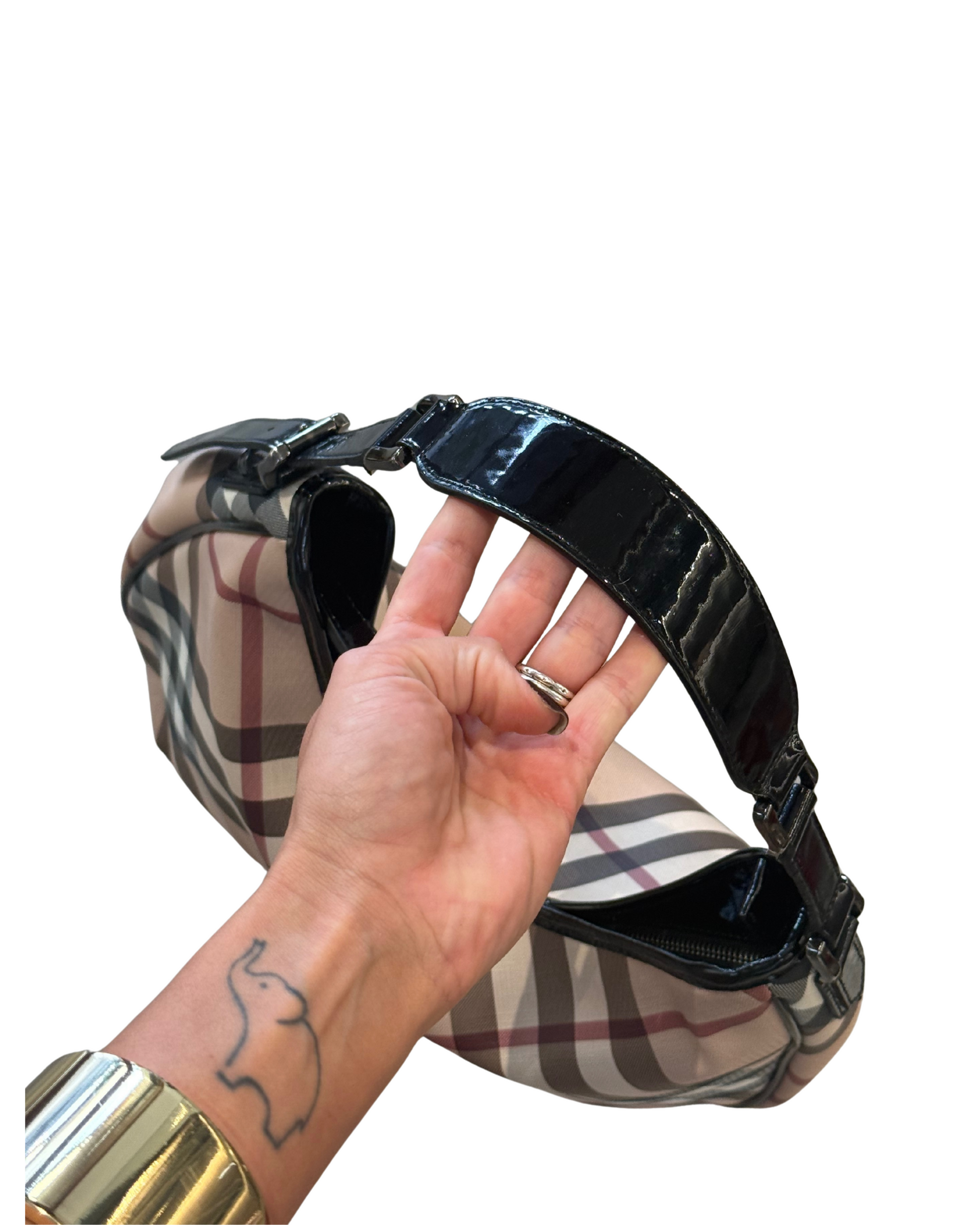 Mezzaluna di Burberry realizzata con iconico e inconfondibile check . Manico e rifiniture in pelle nera lucida. Apertura superiore con cerniera e interno in tessuto beige con tasca con cerniera. Si può indossare comodamente sia a spalla sia a mano.