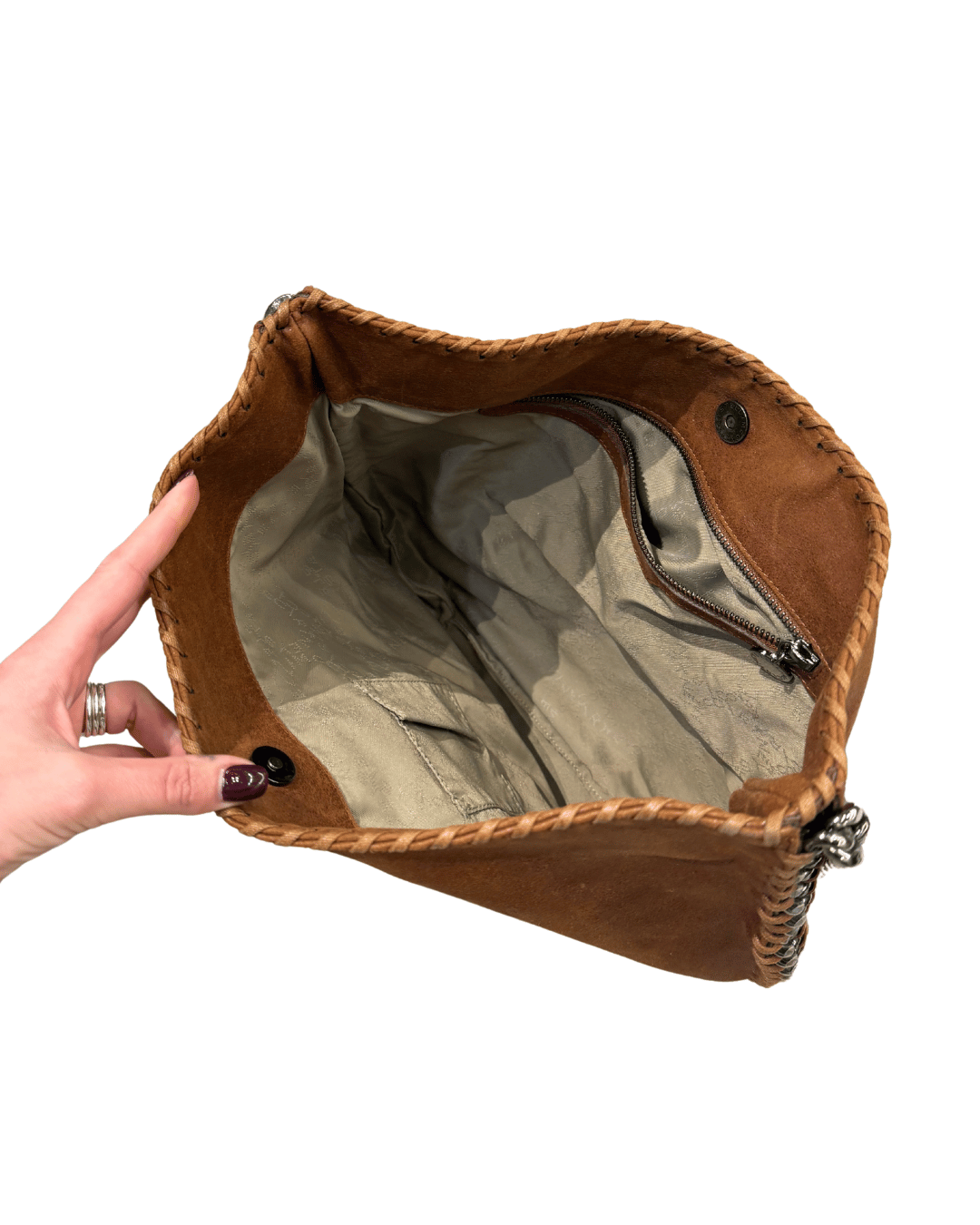Morbida, destrutturata e irresistibilmente cool: la Stella McCartney in versione color cuoio conquista con il suo fascino casual ma sofisticato. Realizzata in morbida eco-nappa, è rifinita dal caratteristico profilo intrecciato a catena e dalla tracolla a catena che consente di indossarla comodamente crossbody.