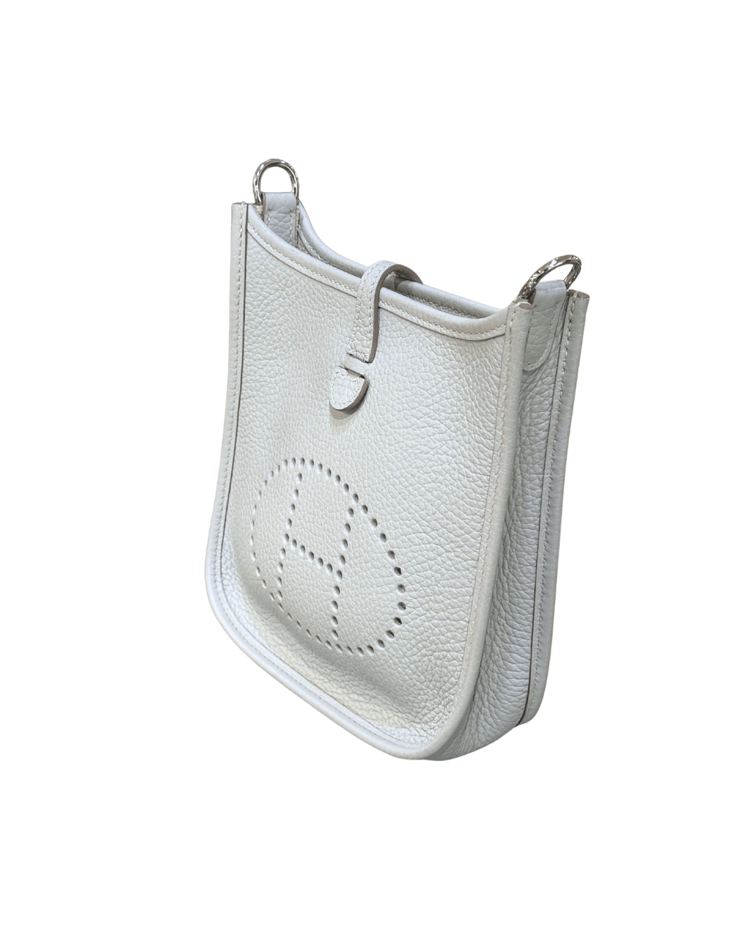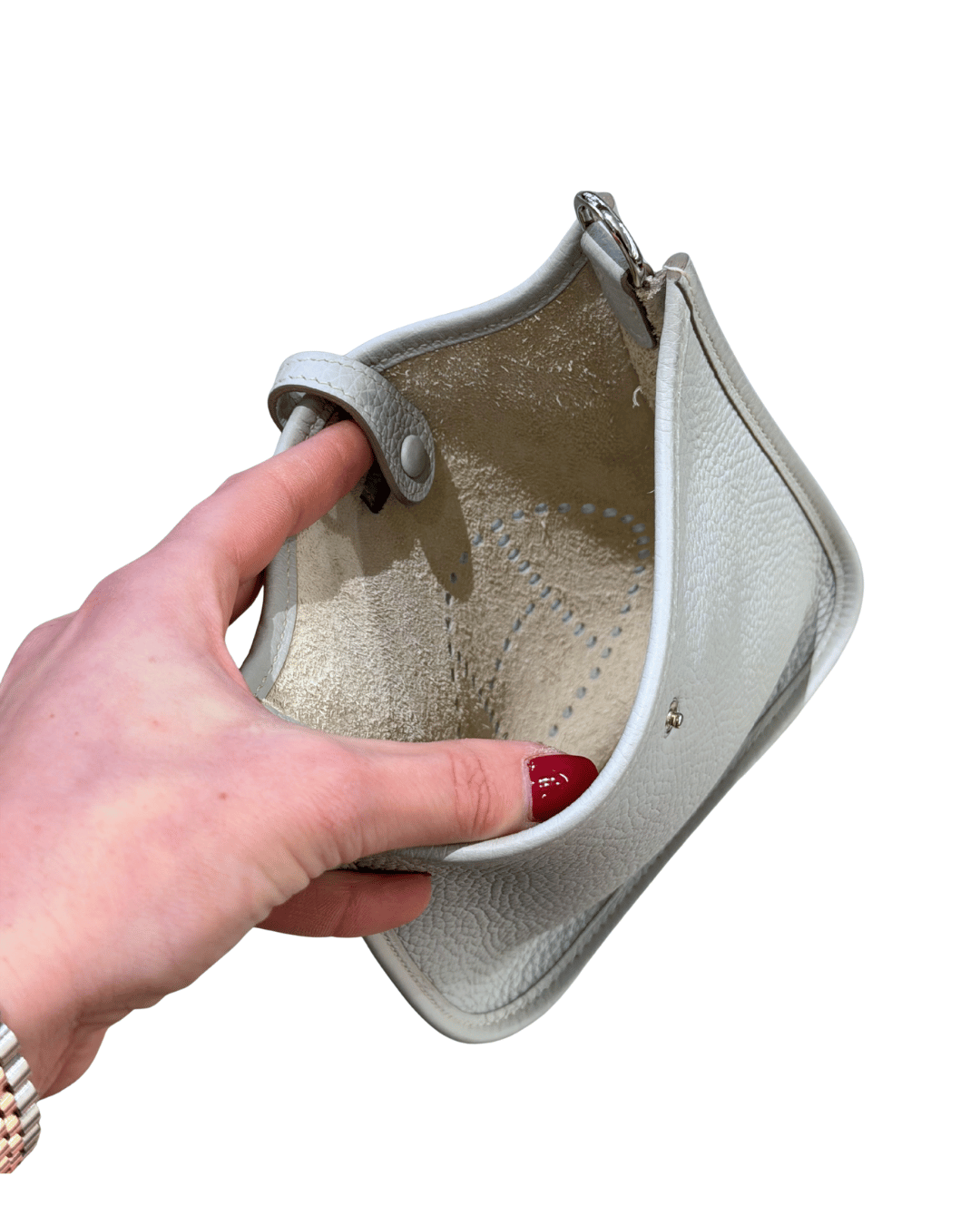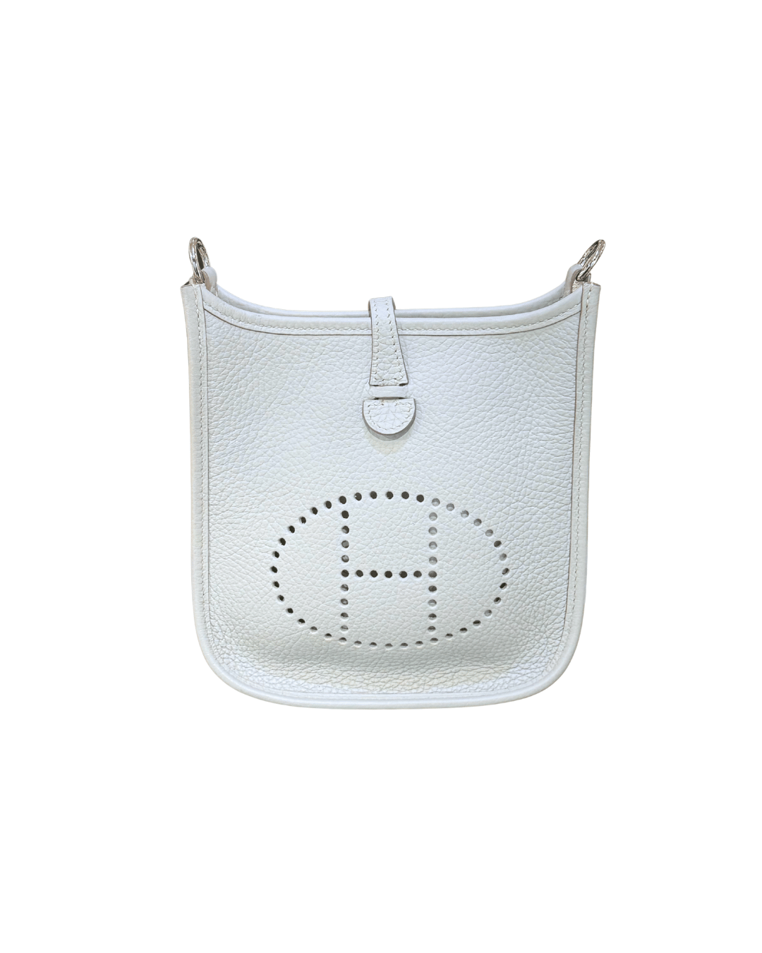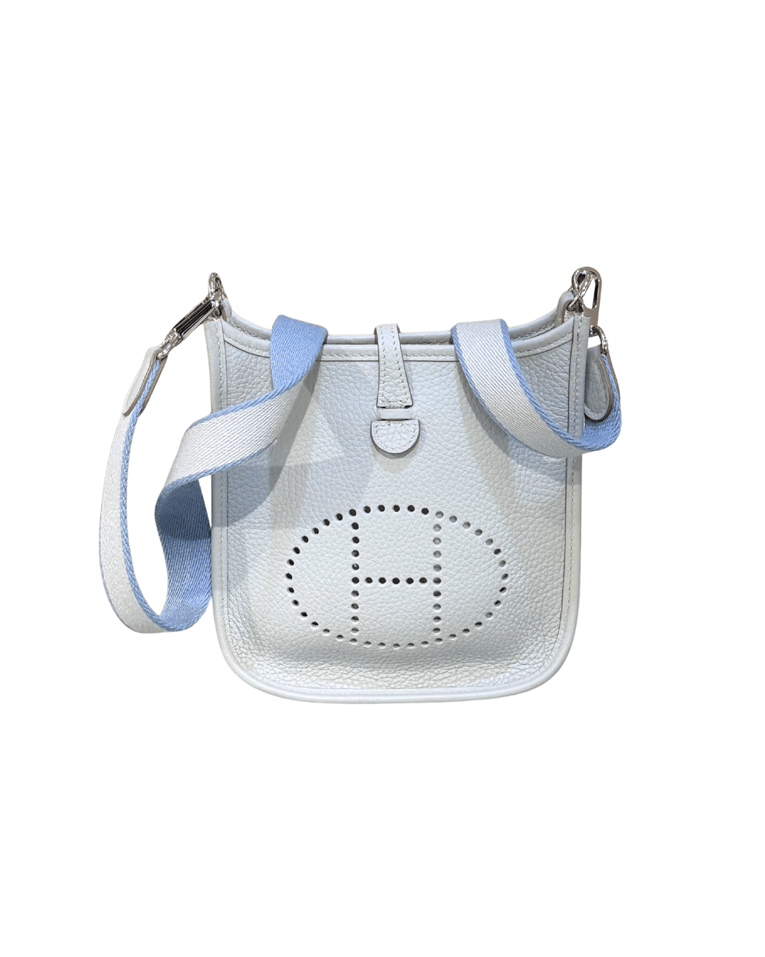 Un classico senza tempo firmato Hermès, la Mini Evelyne TPM è una delle borse più amate per la sua eleganza discreta e la praticità quotidiana. Realizzata in morbida pelle Togo nel raffinato coloreazzurro carta da zucchero, si distingue per la caratteristica “H” traforata sul fronte e la chiusura con linguetta. L’interno è in pelle scamosciata, mentre la tracolla in tela regolabile bicolore azzurra e turchese consente di portarla comodamente crossbody. Dettagli in metallo argentato completano il design essenziale ma iconico. Perfetta per chi ama i pezzi esclusivi e iconici, difficilmente reperibili in boutique.