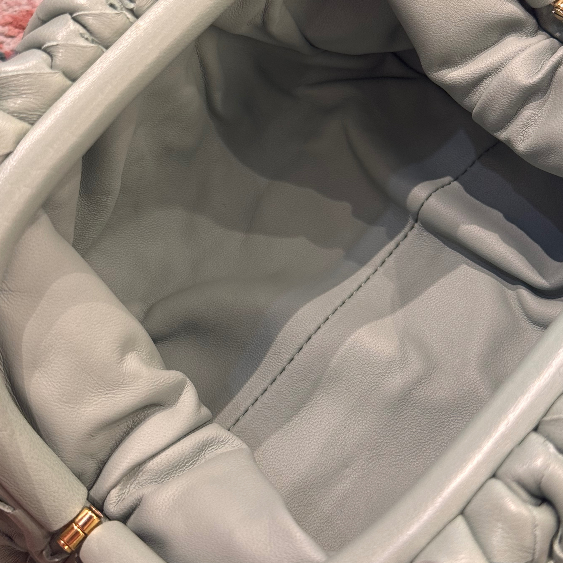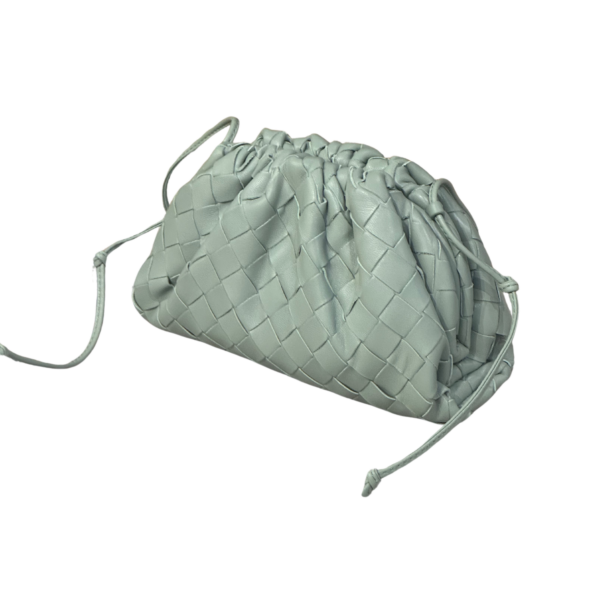 Mini Pouch Bottega veneta in pelle di agnello con motivo intrecciato color salvia. Tracollina. Scomparto unico, interno in pelle. Apertura a scatto magnetica.