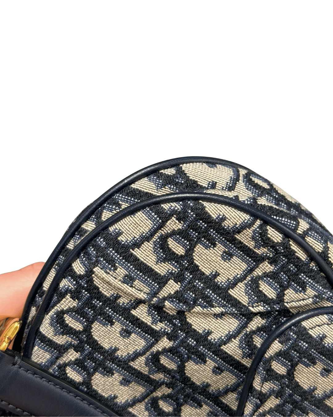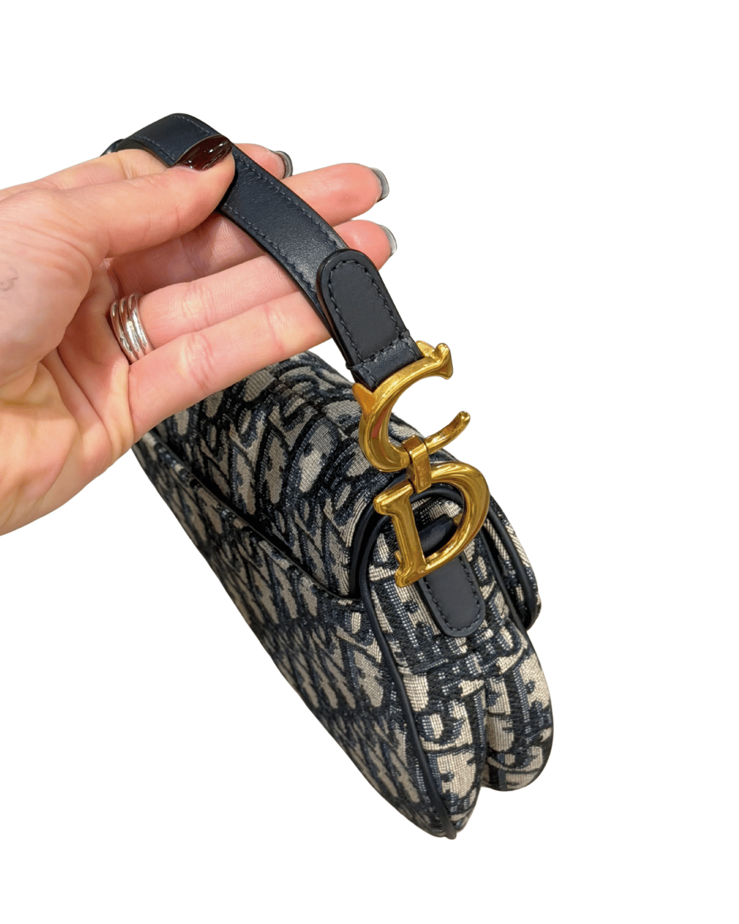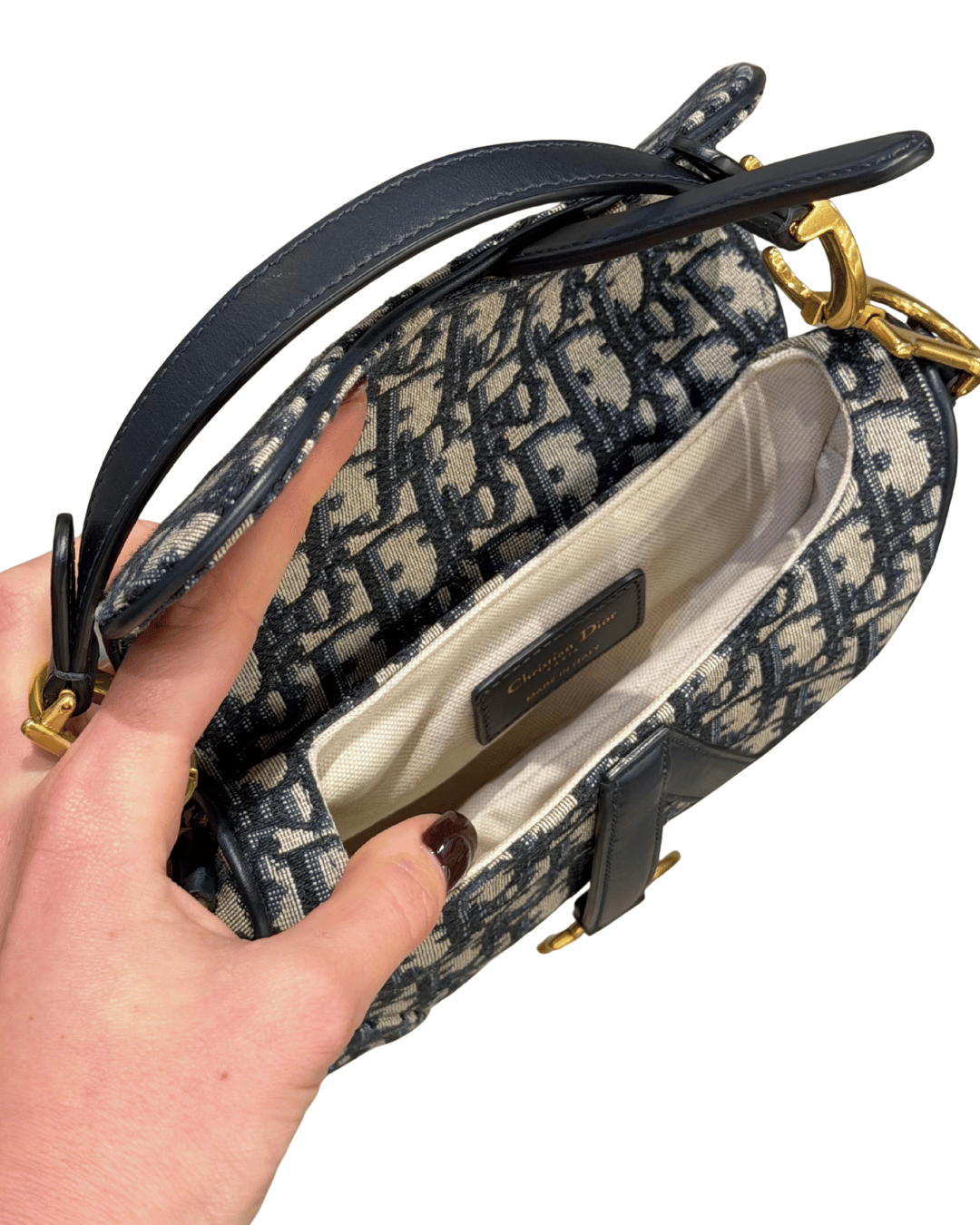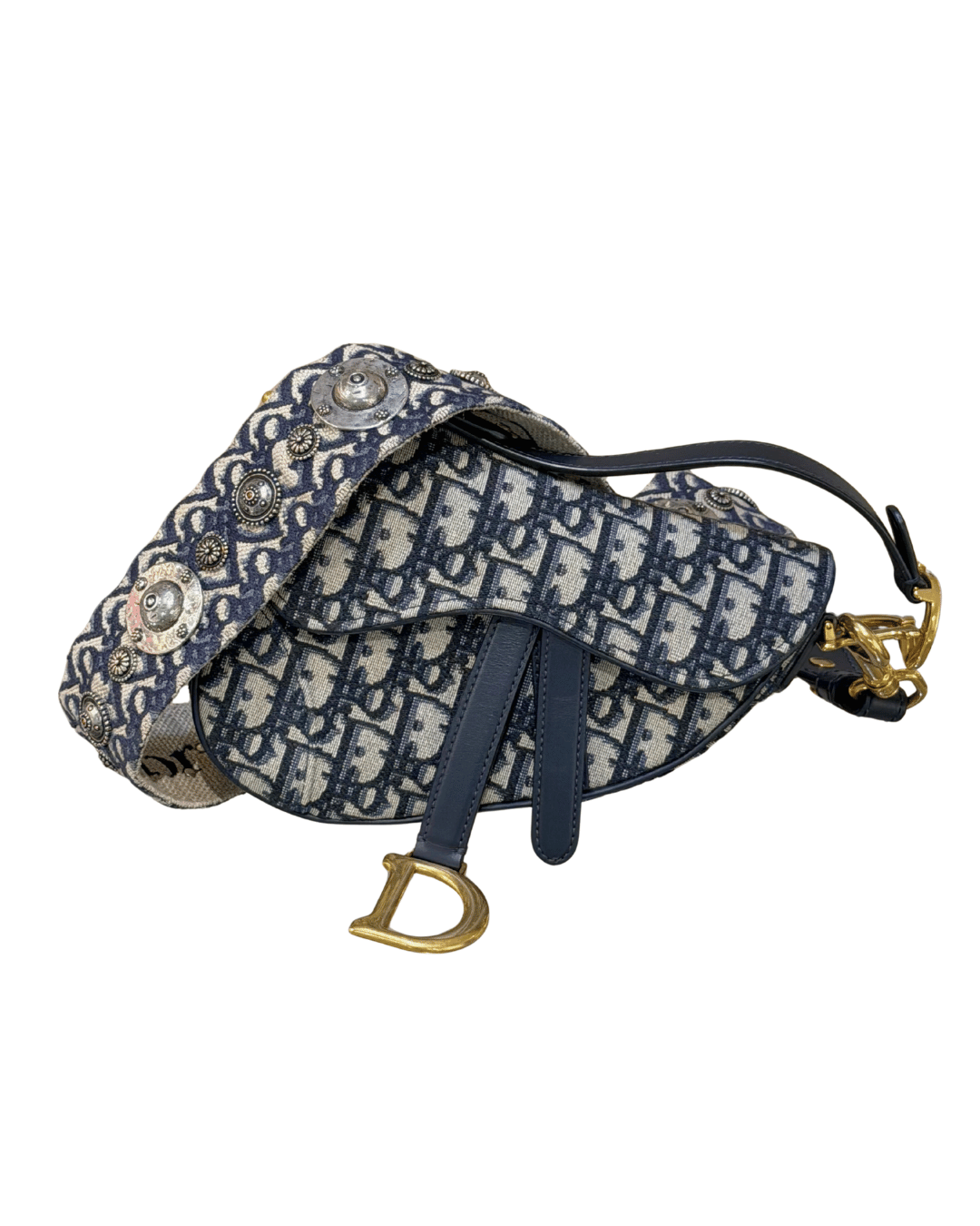 Iconica, compatta e immediatamente riconoscibile: questa Mini Saddle Bag firmata Dior è una delle silhouette più amate della Maison, reinterpretata in una versione mini super versatile e contemporanea. Realizzata nell’inconfondibile tessuto jacquard Dior Oblique nei toni del blu, è arricchita da dettagli in pelle scura e dall’elegante hardware color oro, con l’iconica chiusura a staffa “D” che rende questo modello un vero simbolo di stile. Completa di tracolla regolabile e rimovibile in tessuto Dior, impreziosita da applicazioni decorative, può essere indossata a spalla o crossbody, perfetta sia per look quotidiani che per occasioni più speciali. L’interno, foderato in tessuto chiaro, è ideale per contenere l’essenziale con leggerezza e classe.(codice: 05-RU-0169)