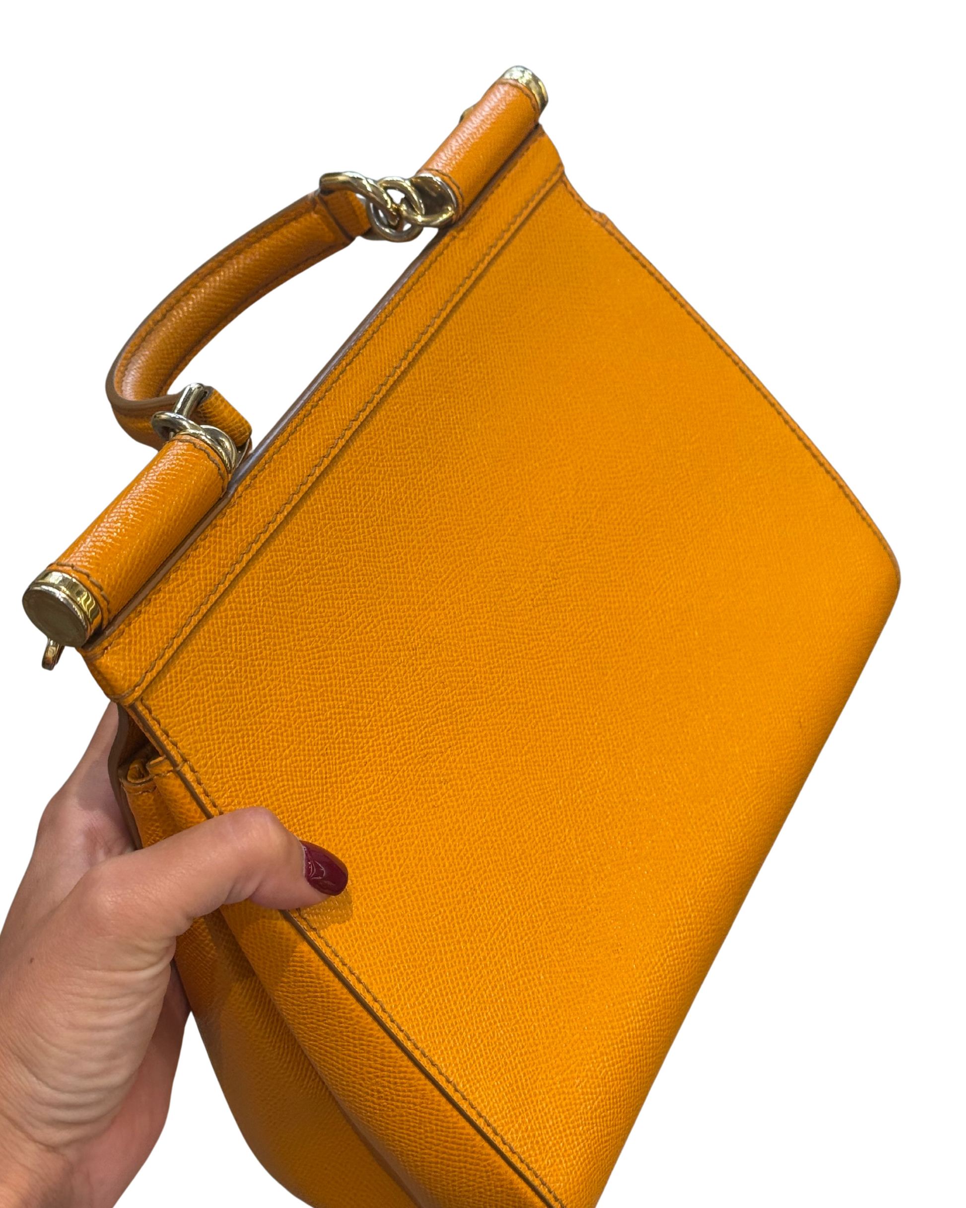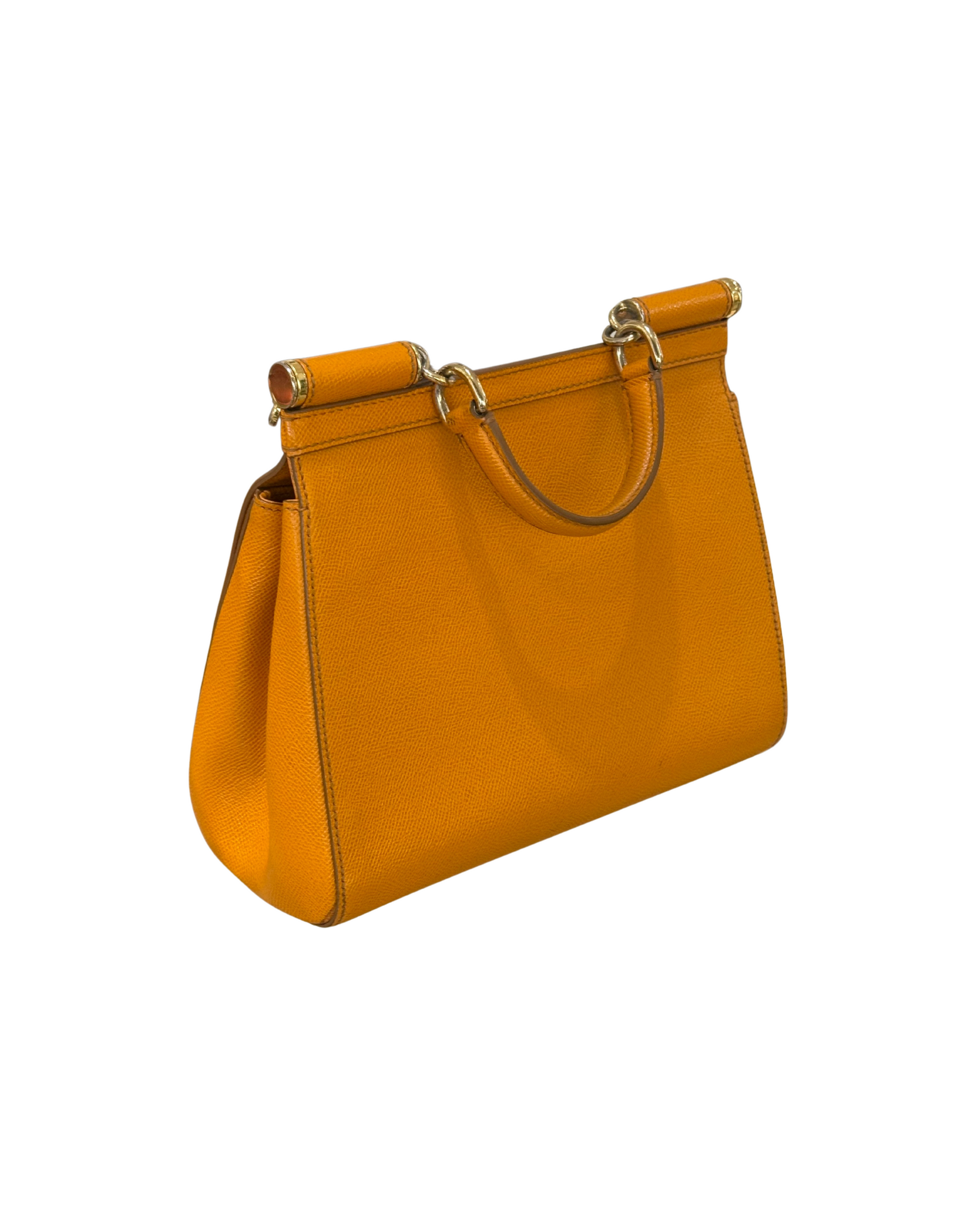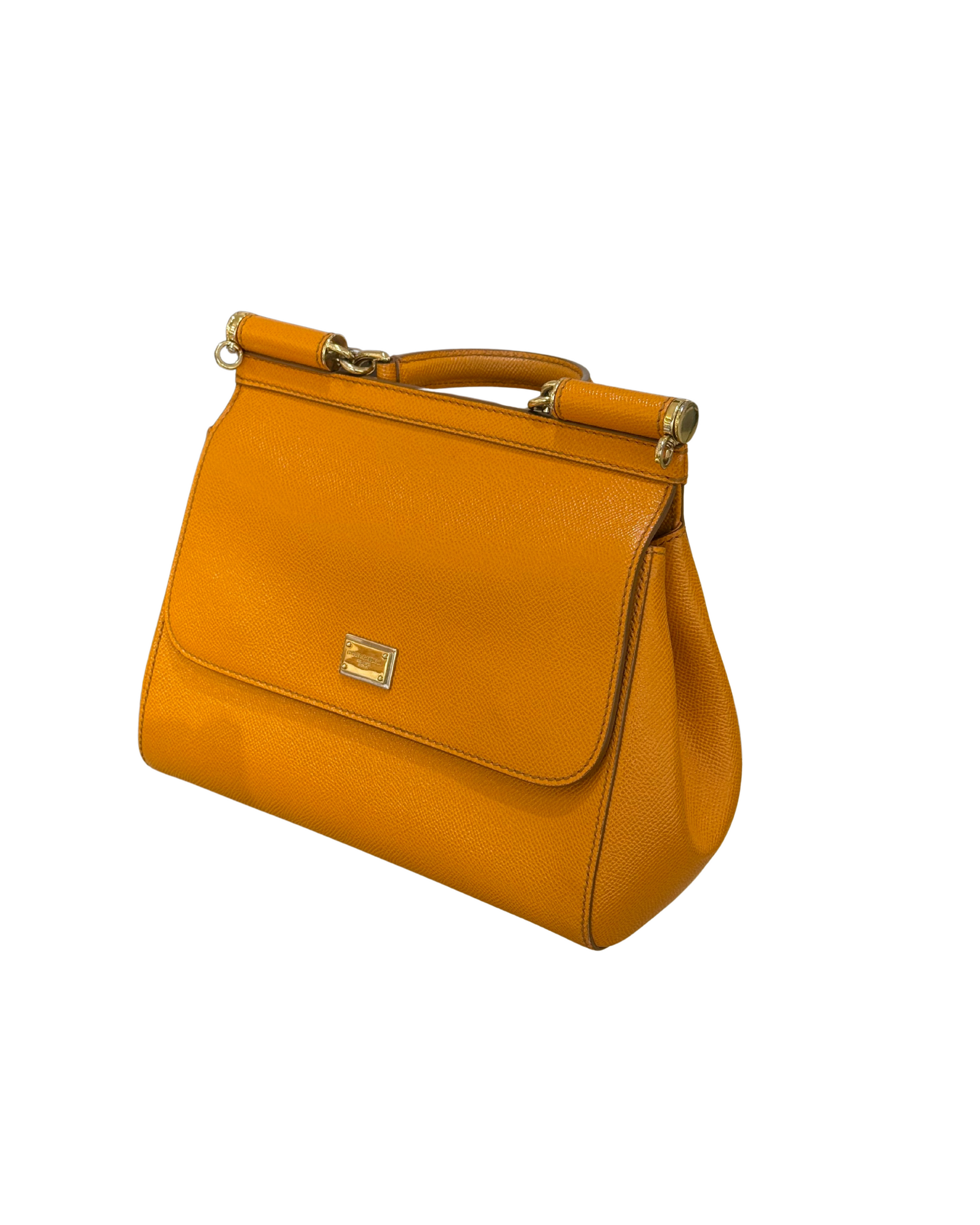 Un classico intramontabile della maison Dolce & Gabbana, la Miss Sicily si distingue per le sue linee eleganti e la raffinata artigianalità italiana. Realizzata in pelle martellata color arancio intenso, è arricchita da finiture dorate che donano luminosità e carattere. La silhouette strutturata e femminile è resa ancora più pratica dal manico rigido superiore e dalla tracolla regolabile e removibile, che permette di indossarla sia a mano che a spalla.L’interno, foderato con stampa animalier, custodisce tasche funzionali con zip e scomparti ideali per organizzare i propri effetti personali.