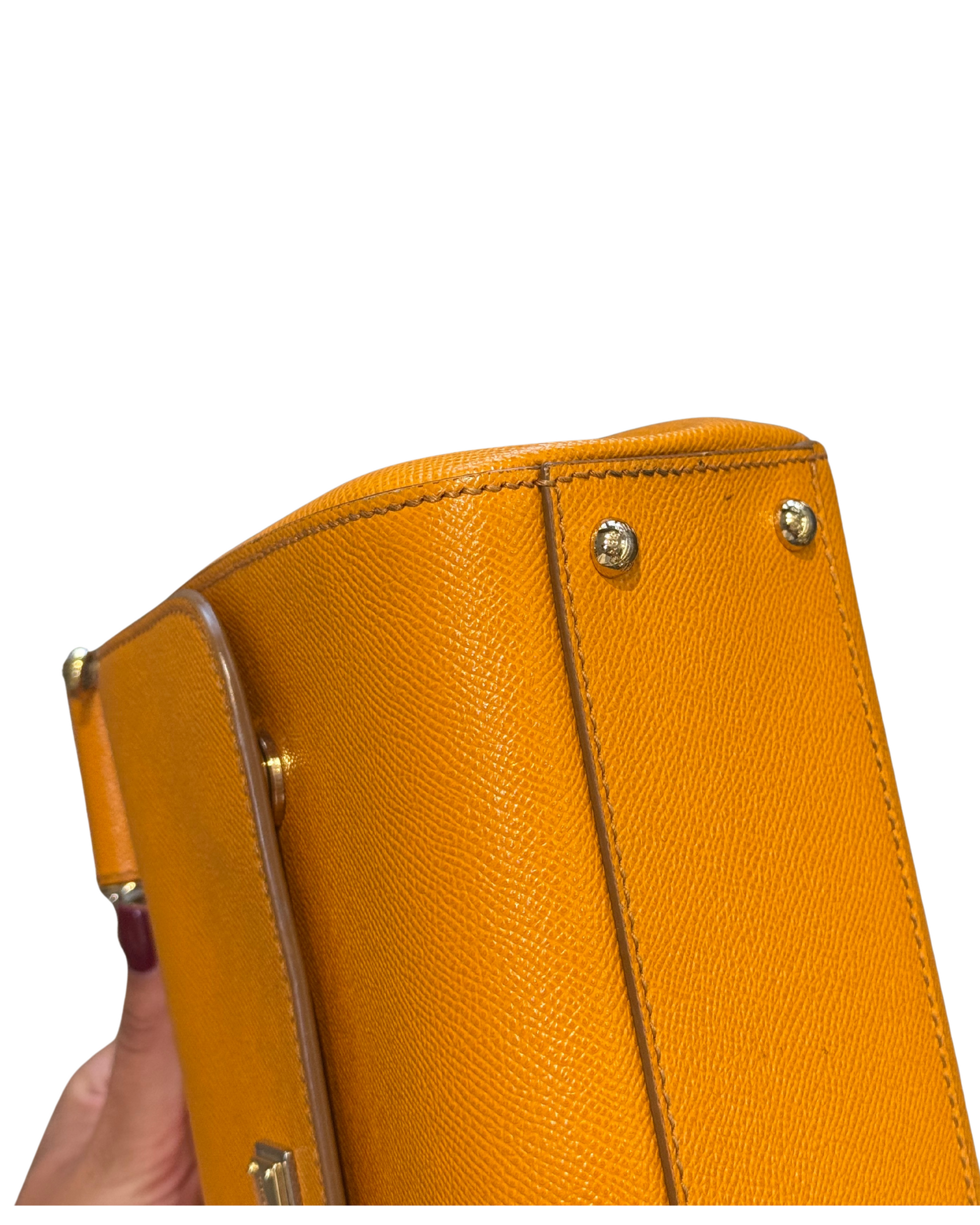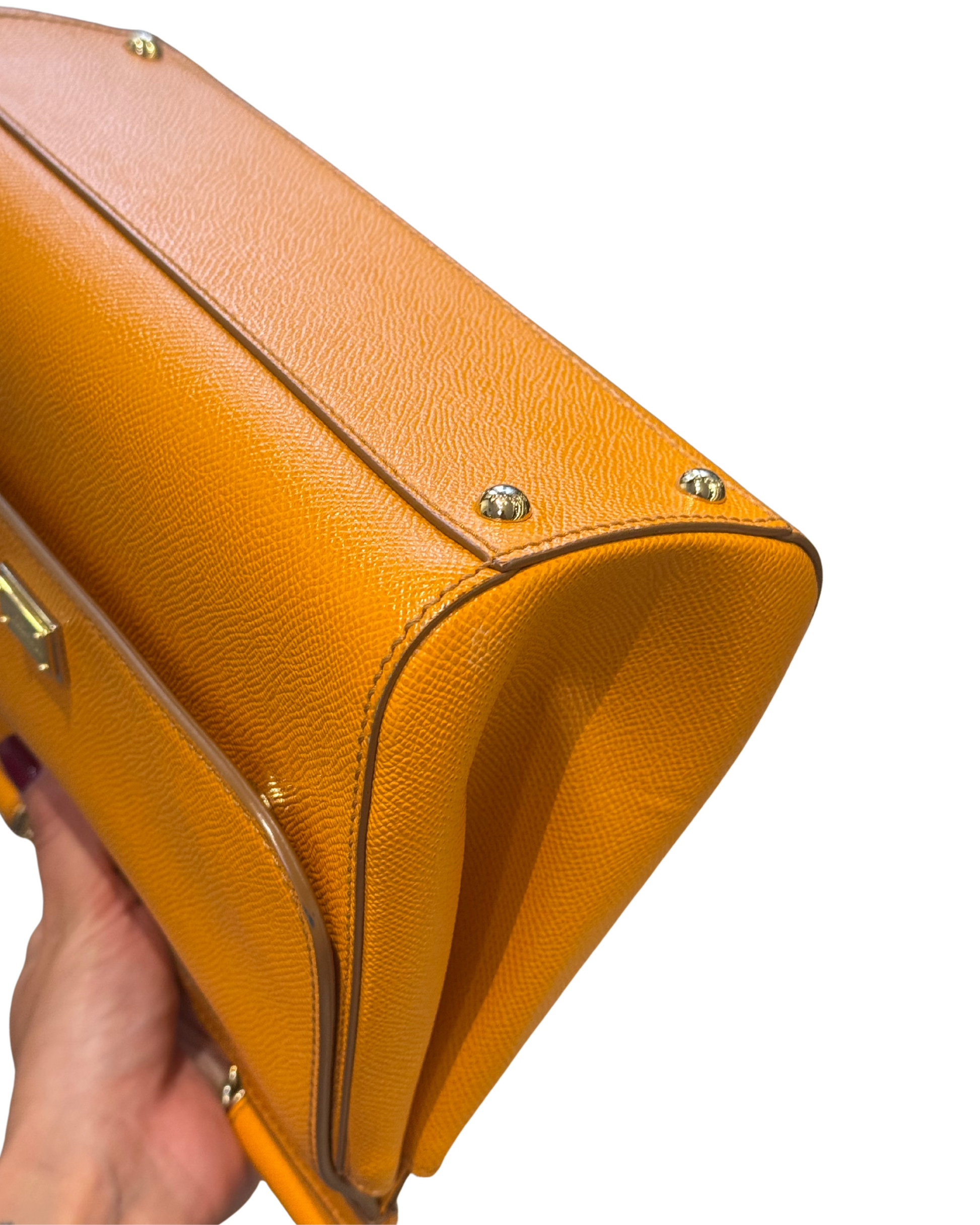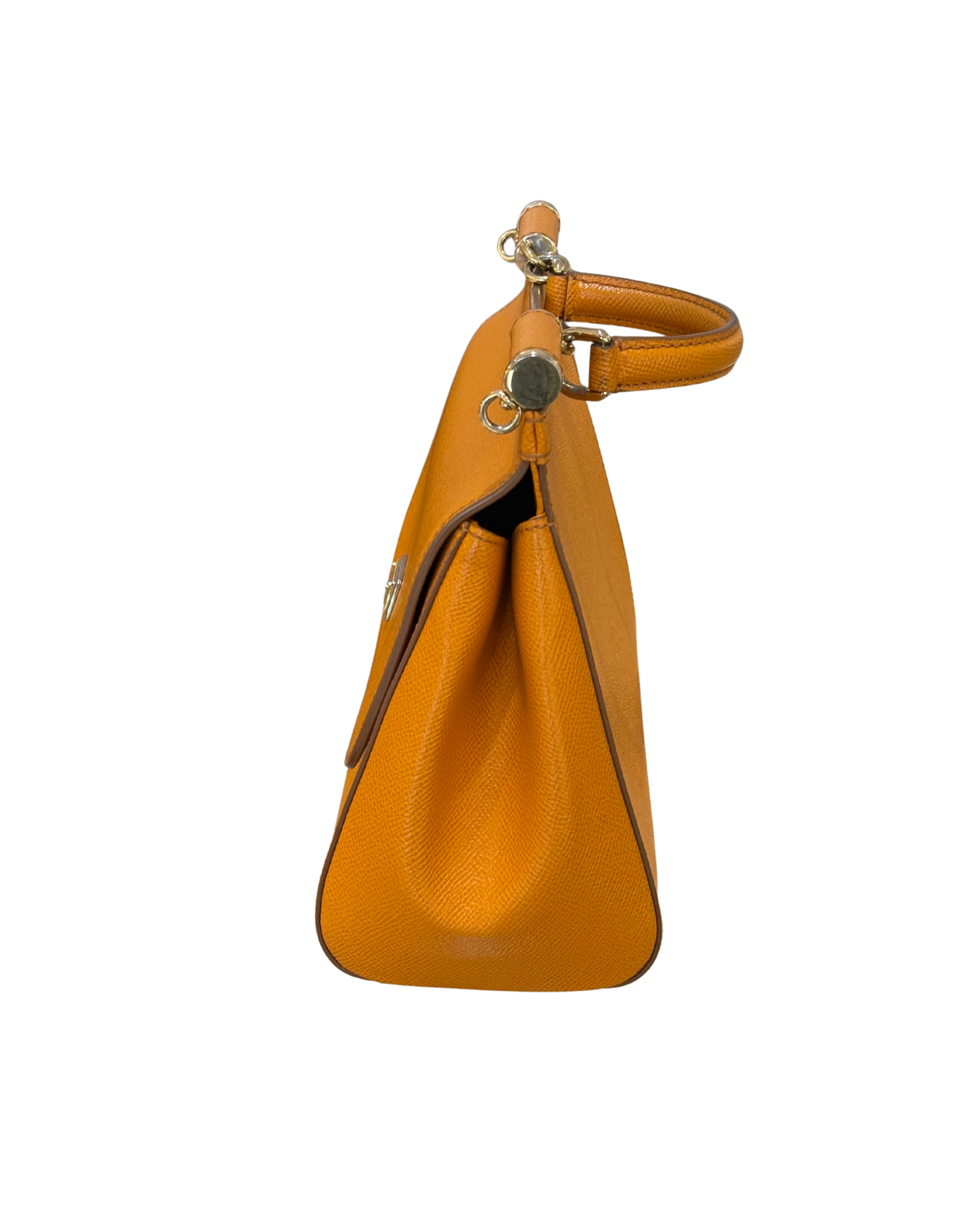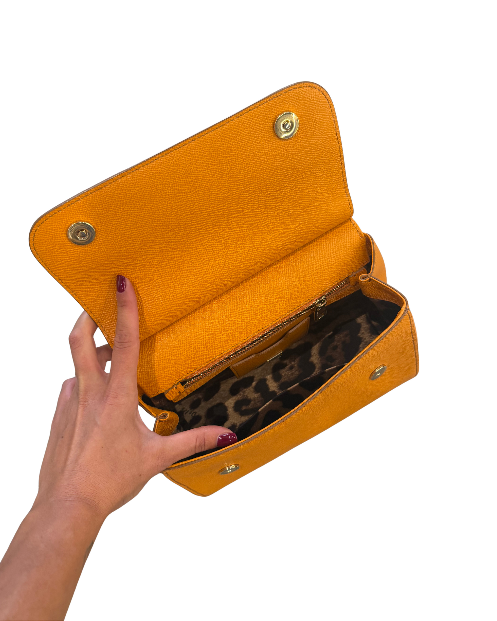 Un classico intramontabile della maison Dolce & Gabbana, la Miss Sicily si distingue per le sue linee eleganti e la raffinata artigianalità italiana. Realizzata in pelle martellata color arancio intenso, è arricchita da finiture dorate che donano luminosità e carattere. La silhouette strutturata e femminile è resa ancora più pratica dal manico rigido superiore e dalla tracolla regolabile e removibile, che permette di indossarla sia a mano che a spalla.L’interno, foderato con stampa animalier, custodisce tasche funzionali con zip e scomparti ideali per organizzare i propri effetti personali.