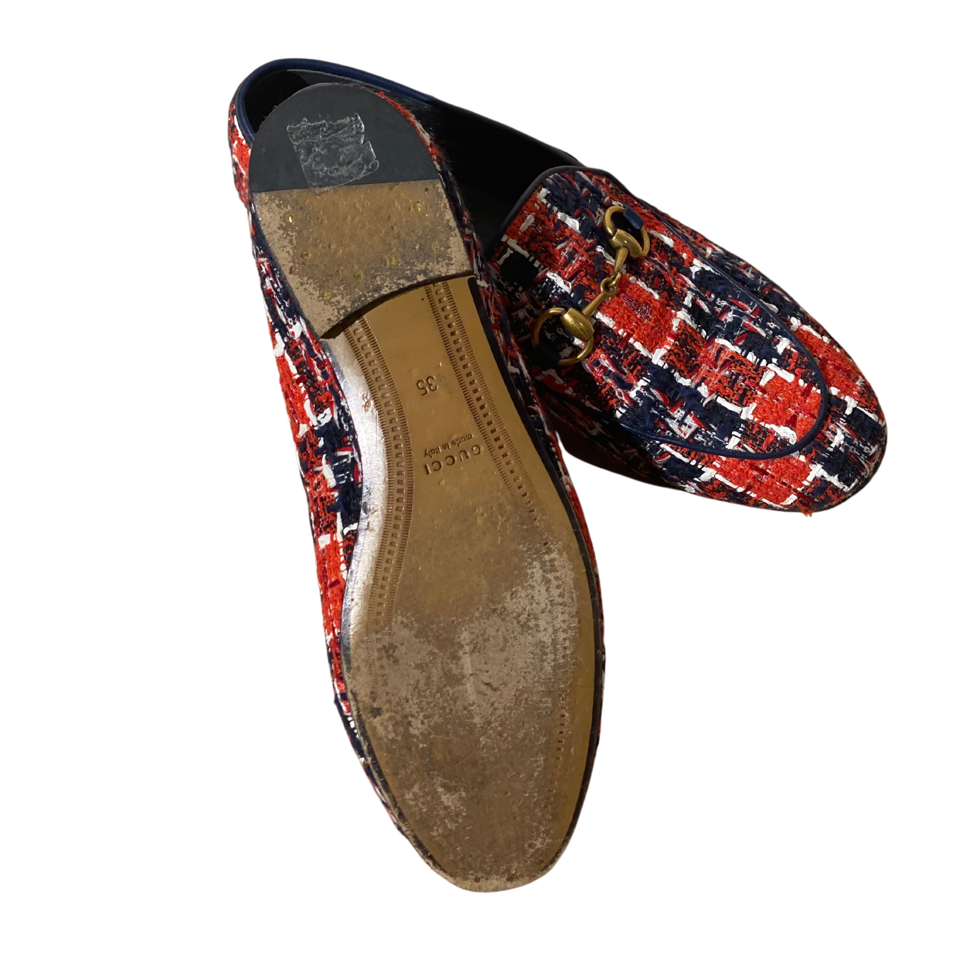 Mocassini Gucci Jordaan con trama tartan blu rossa e bianca. Impreziositi da morsetto dorato sulla parte frontale. Suola in cuoio, interno in pelle e tacco basso 10mm. Made In Italy.
