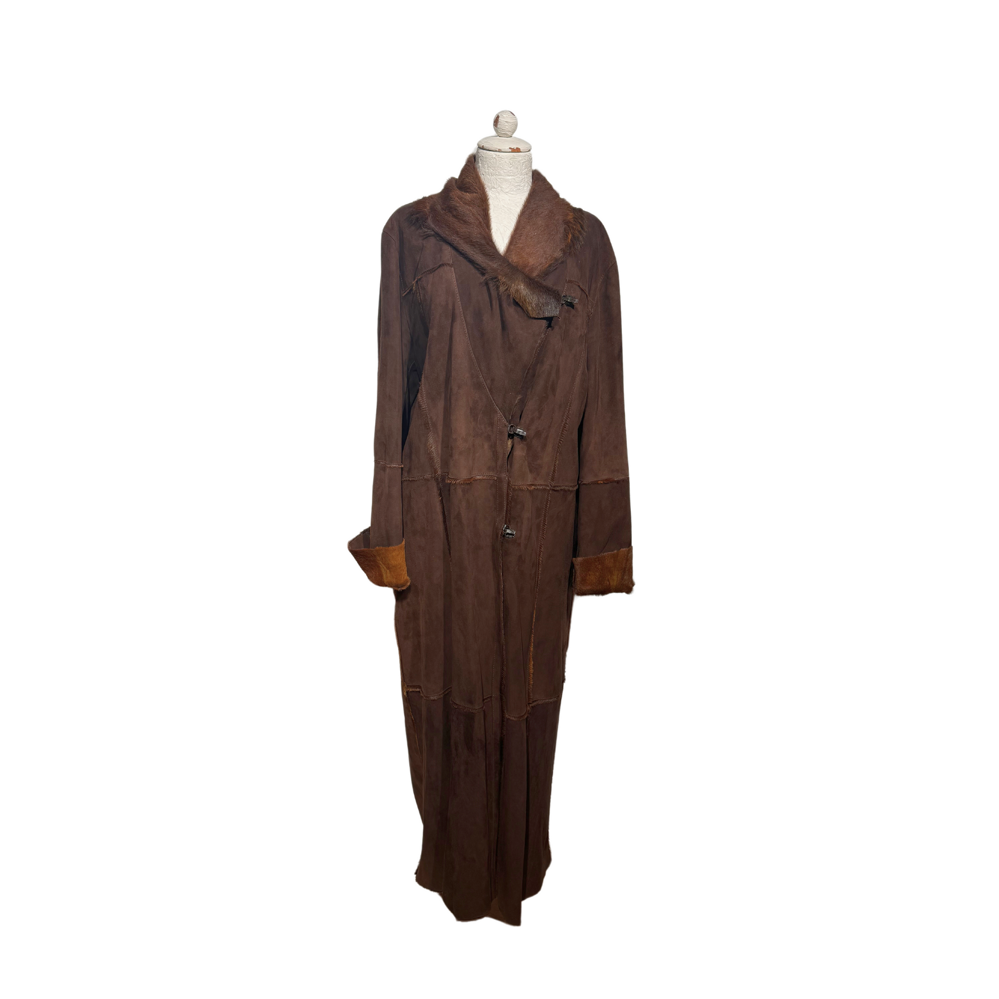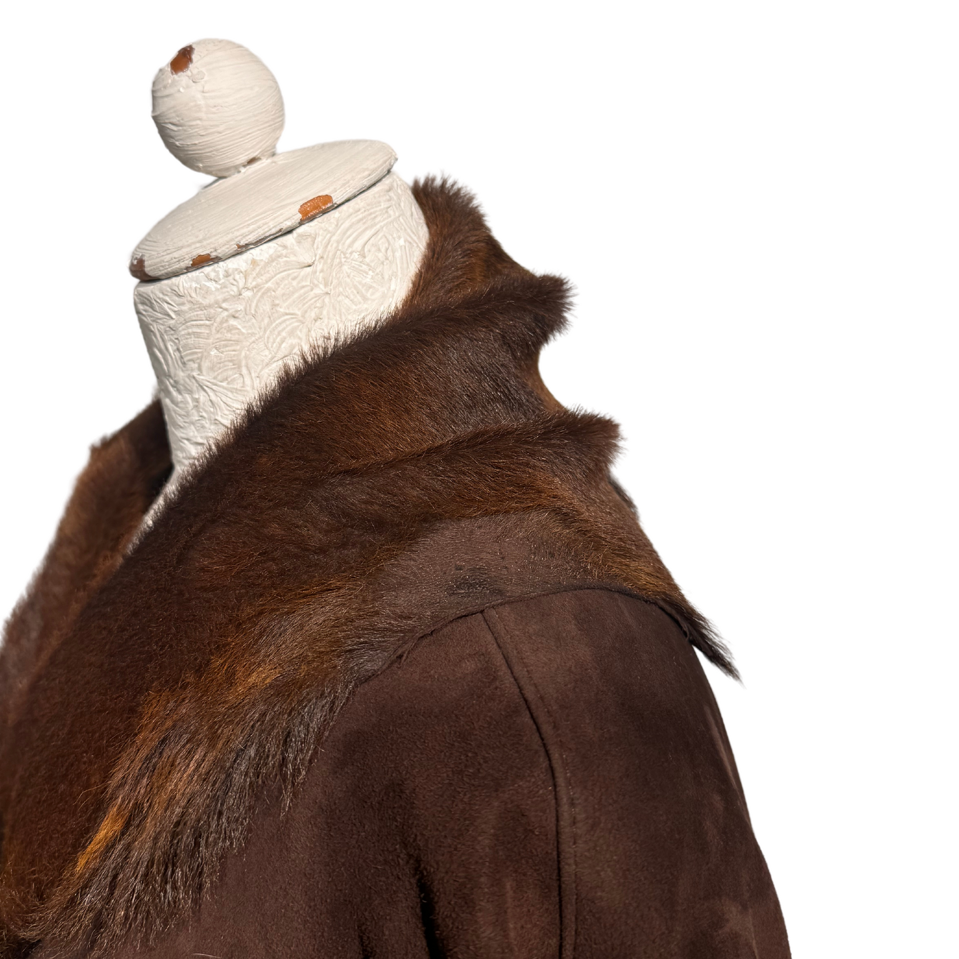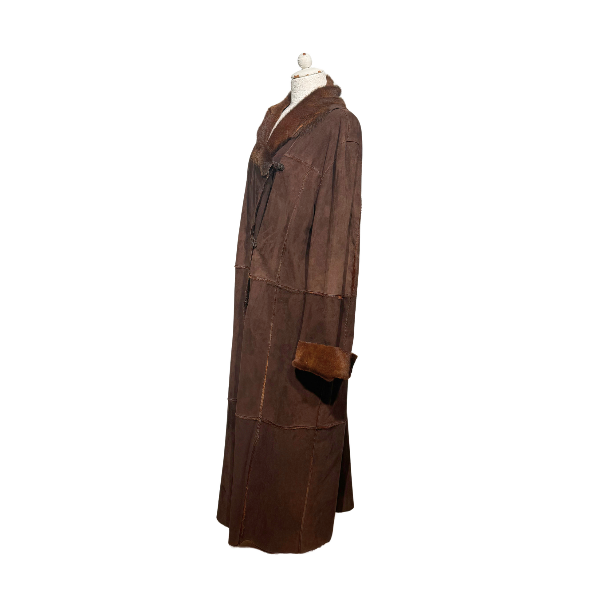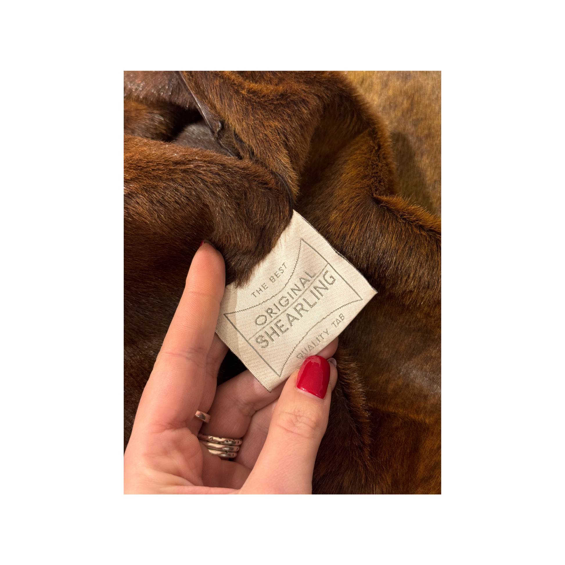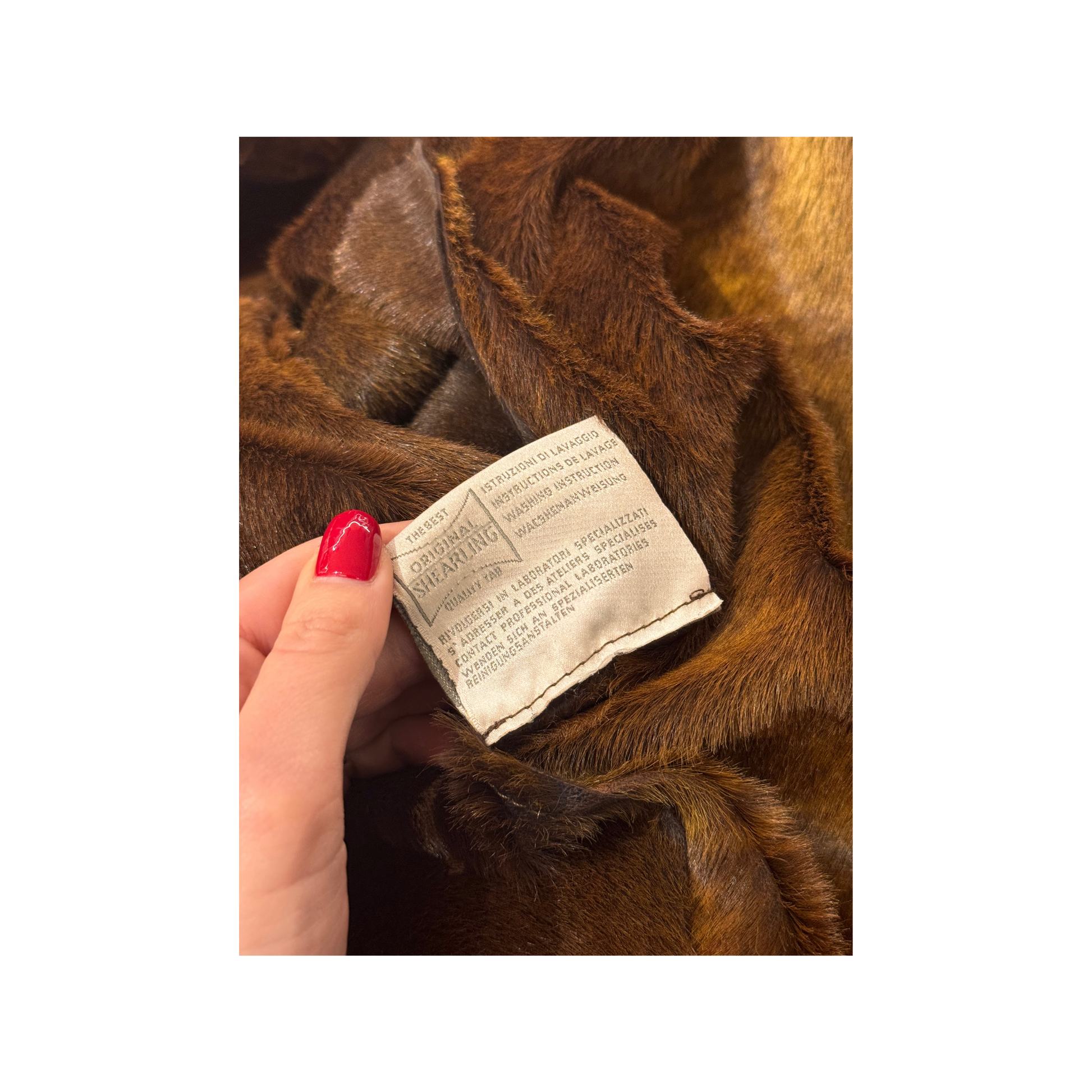 Montone marrone, Shearling originale. Esternamente pelle scamosciata , interno in pelo. Apertura frontale con ganci.