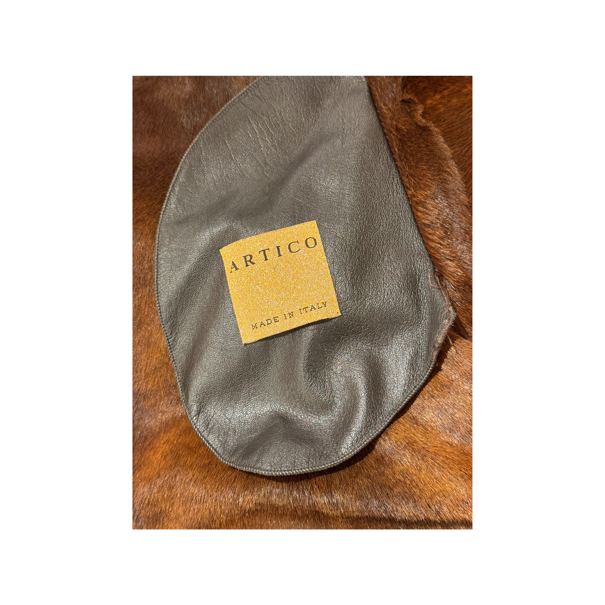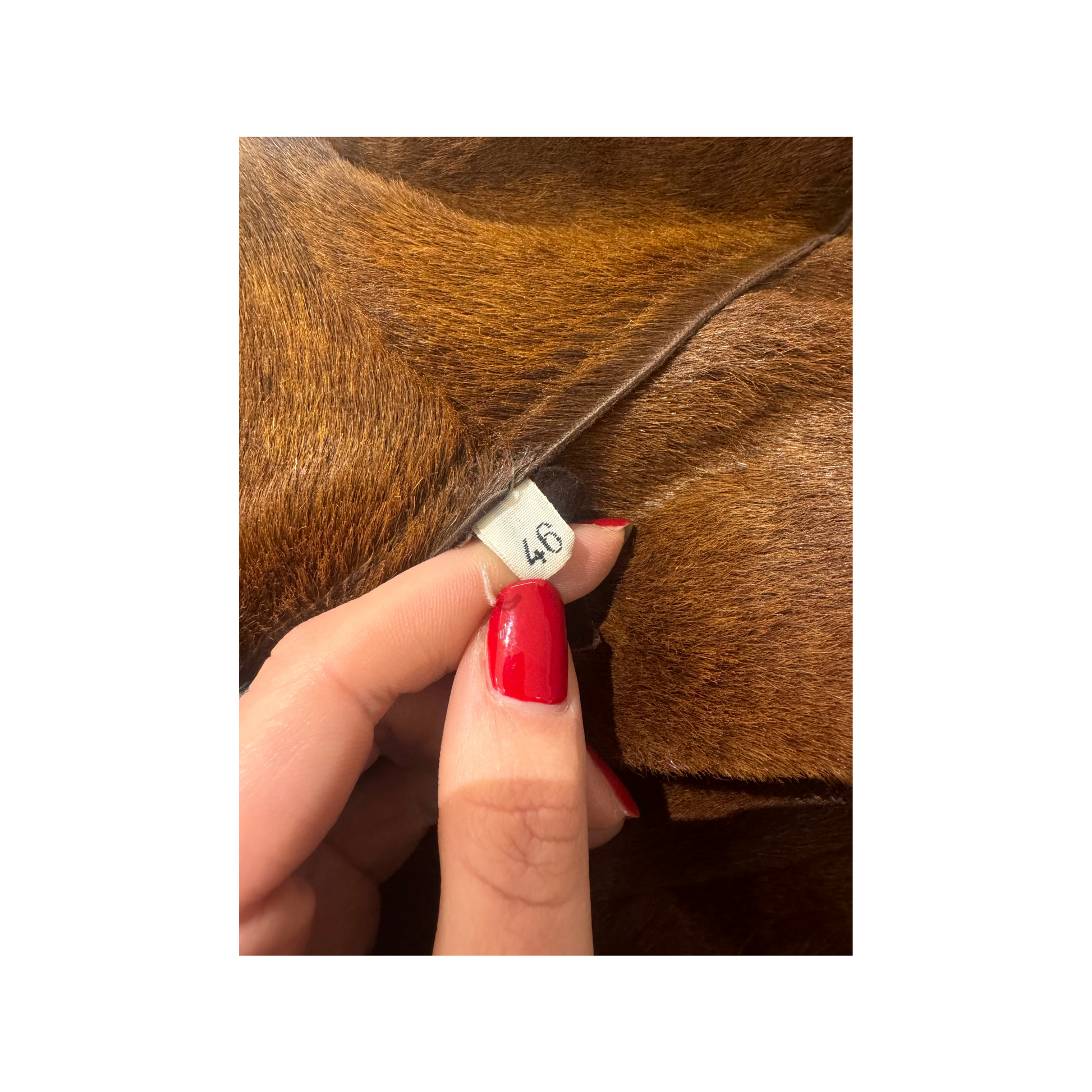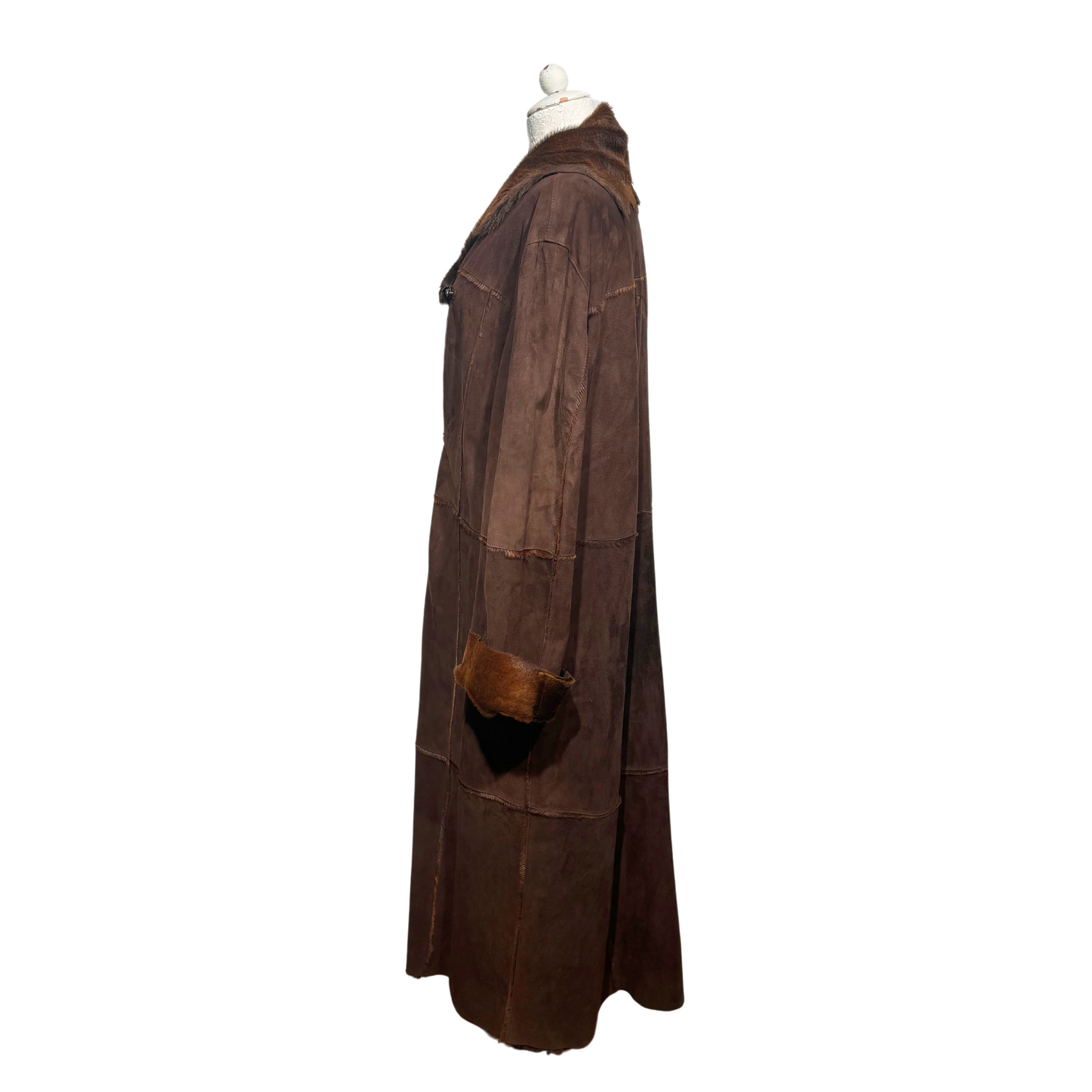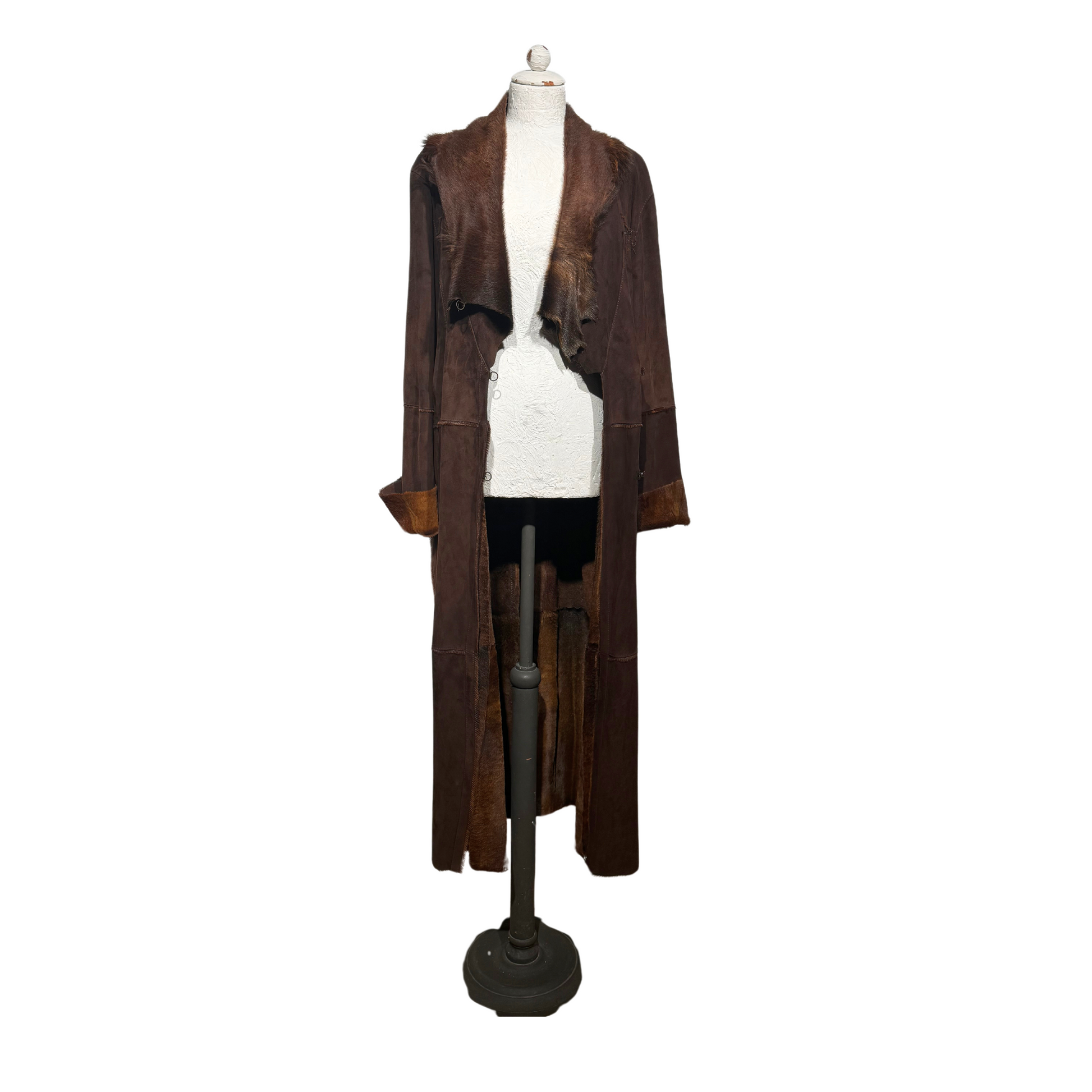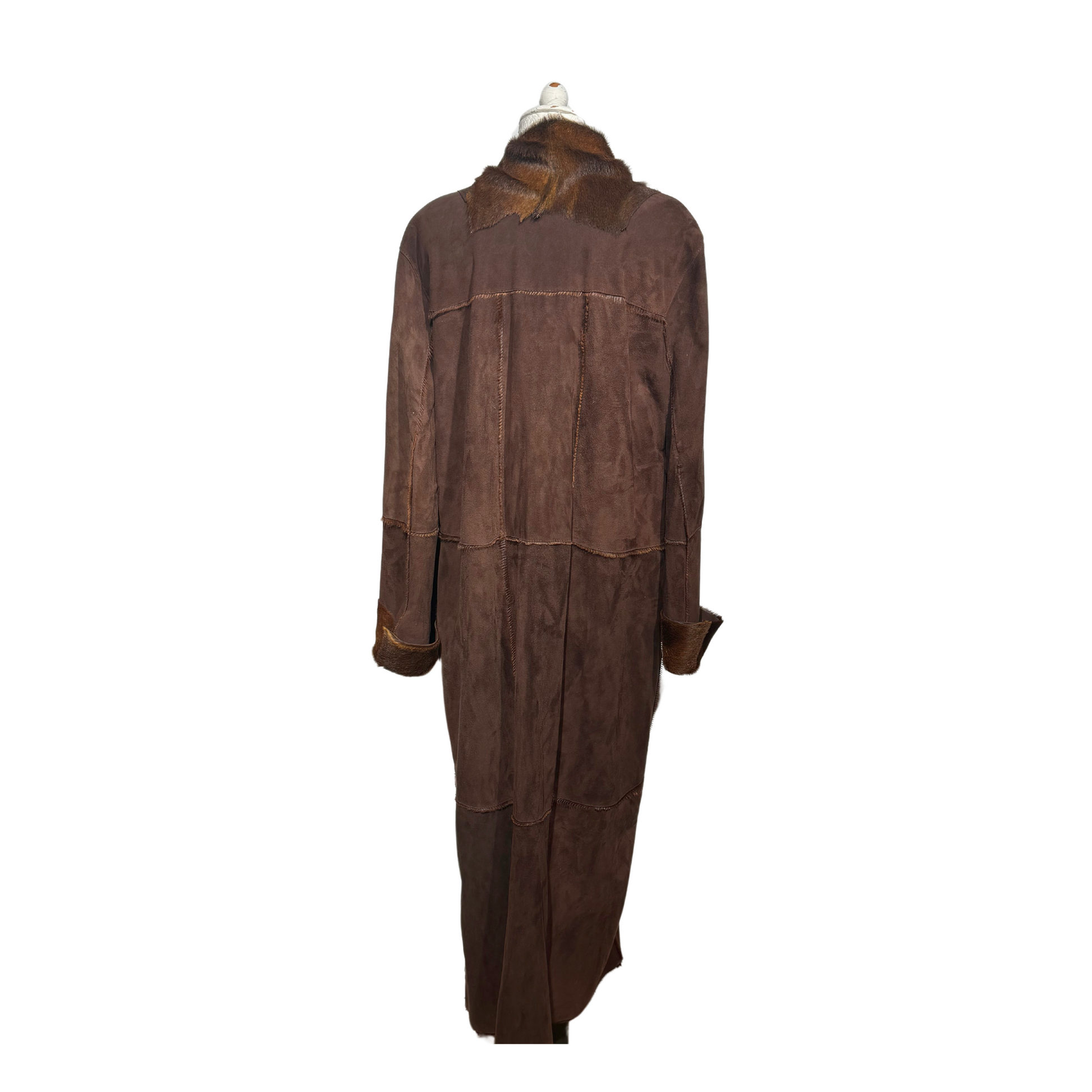 Montone marrone, Shearling originale. Esternamente pelle scamosciata , interno in pelo. Apertura frontale con ganci.