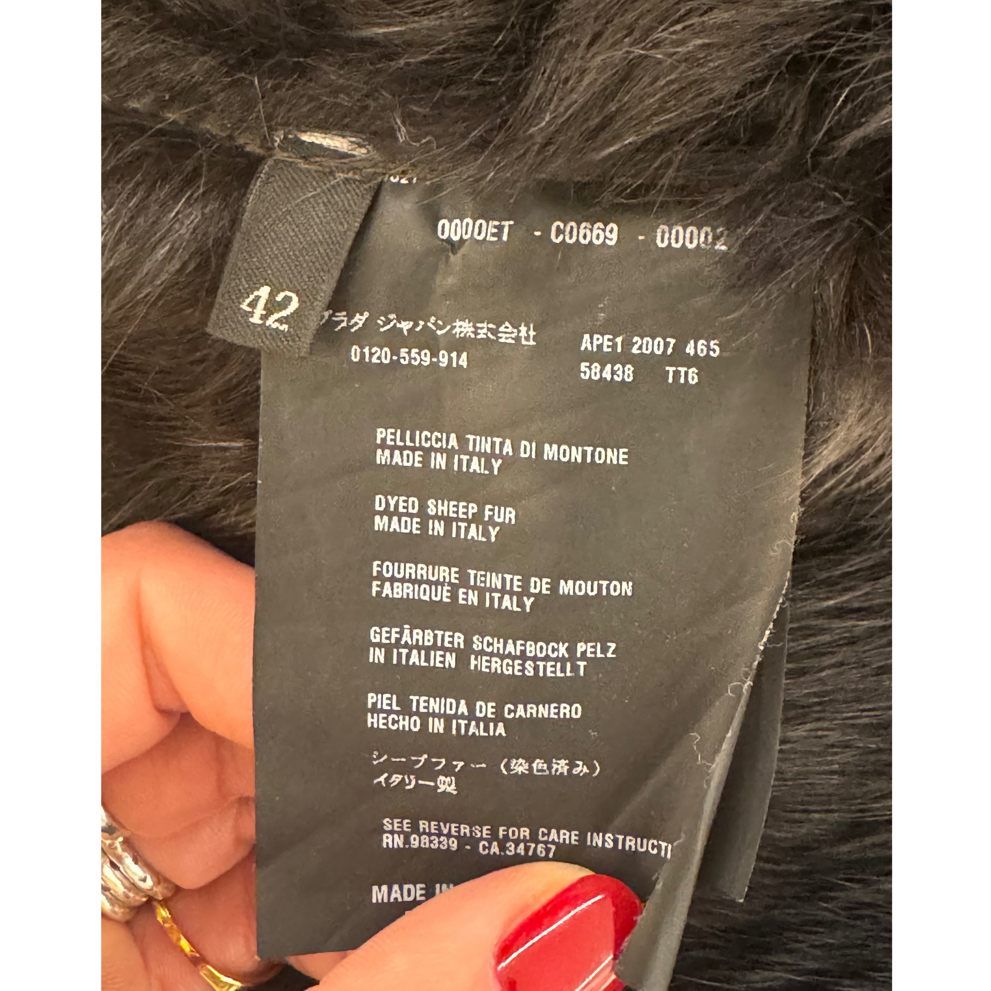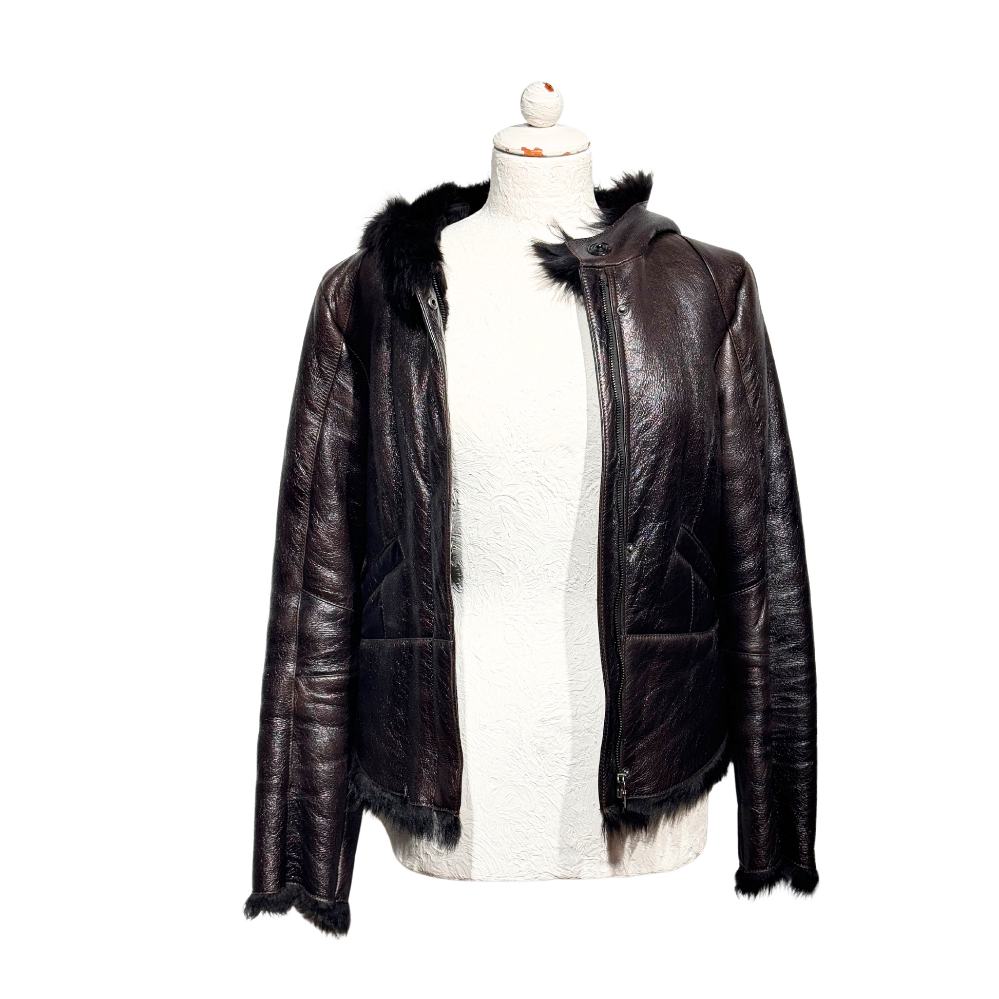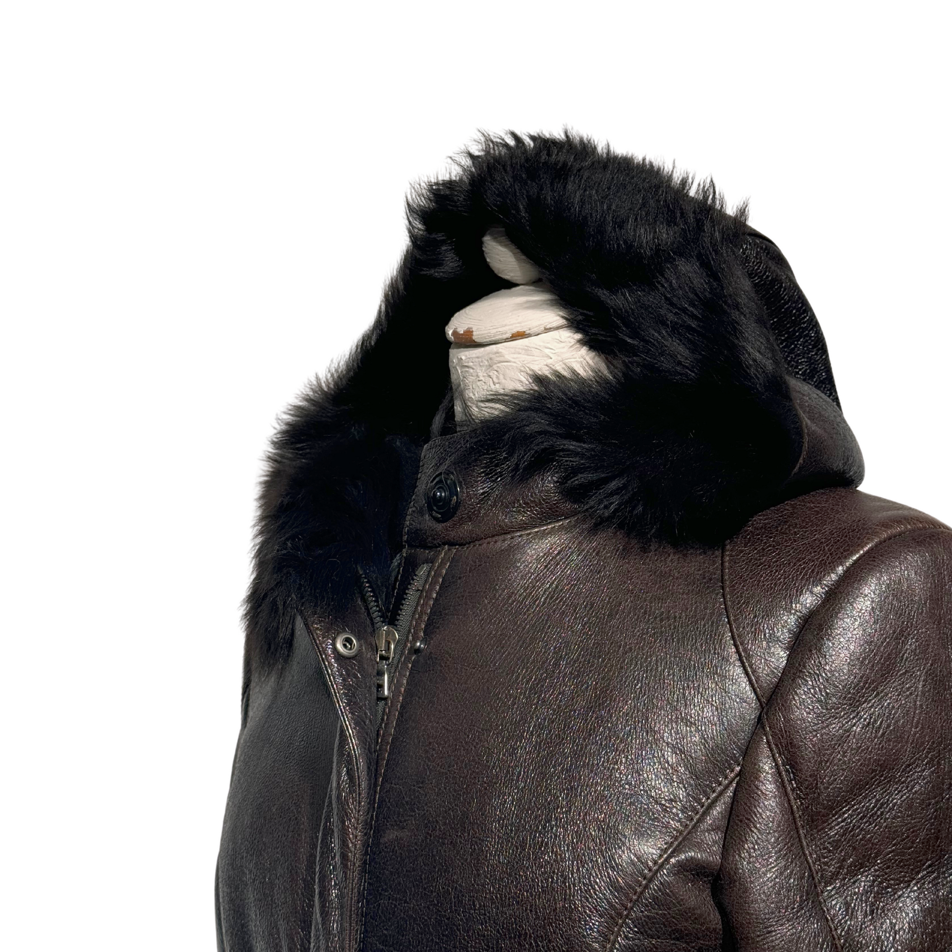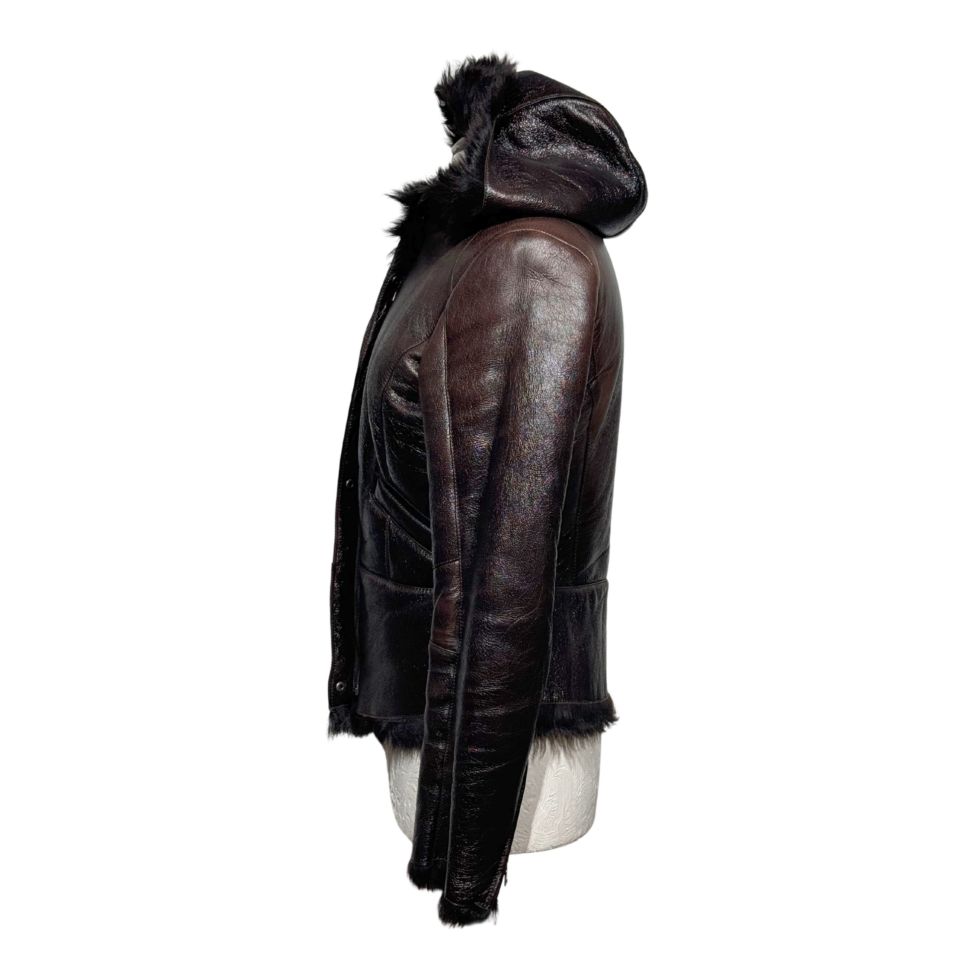 Montone di Prada marrone con pelo . Apertura frontale con cerniera e bottoni. Tasche laterali. Cappuccio. Cerniere in corrispondenza dei polsi.