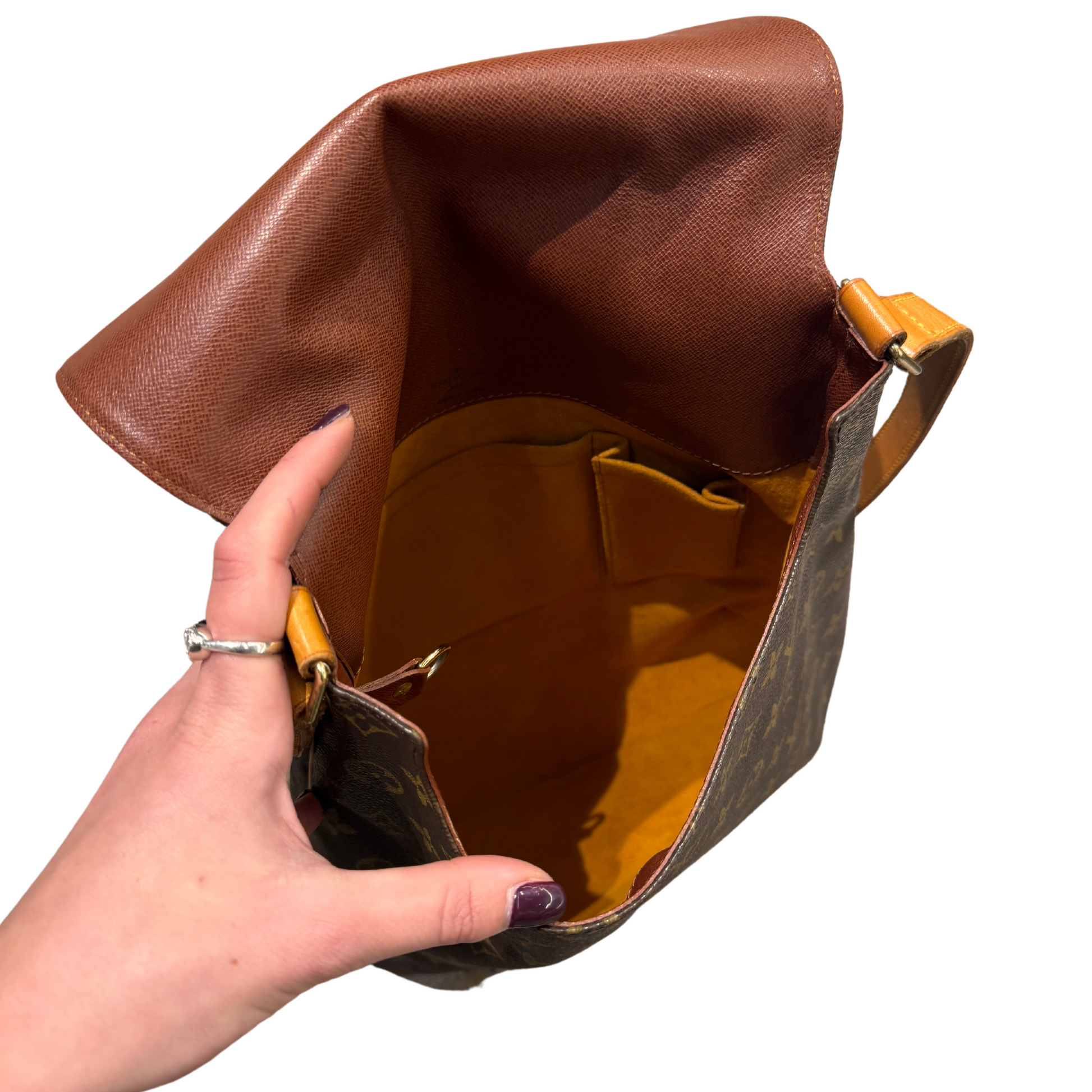 Modello Musette GM LOUIS VUITTON realizzata in tela monogram con rifiniture in metallo dorato. Tracolla regolabile in vacchetta naturale . Chiusura frontale con patta, fodera in camoscio arancio , doppia tasca piatta interna. ( CODICE: AS1021)