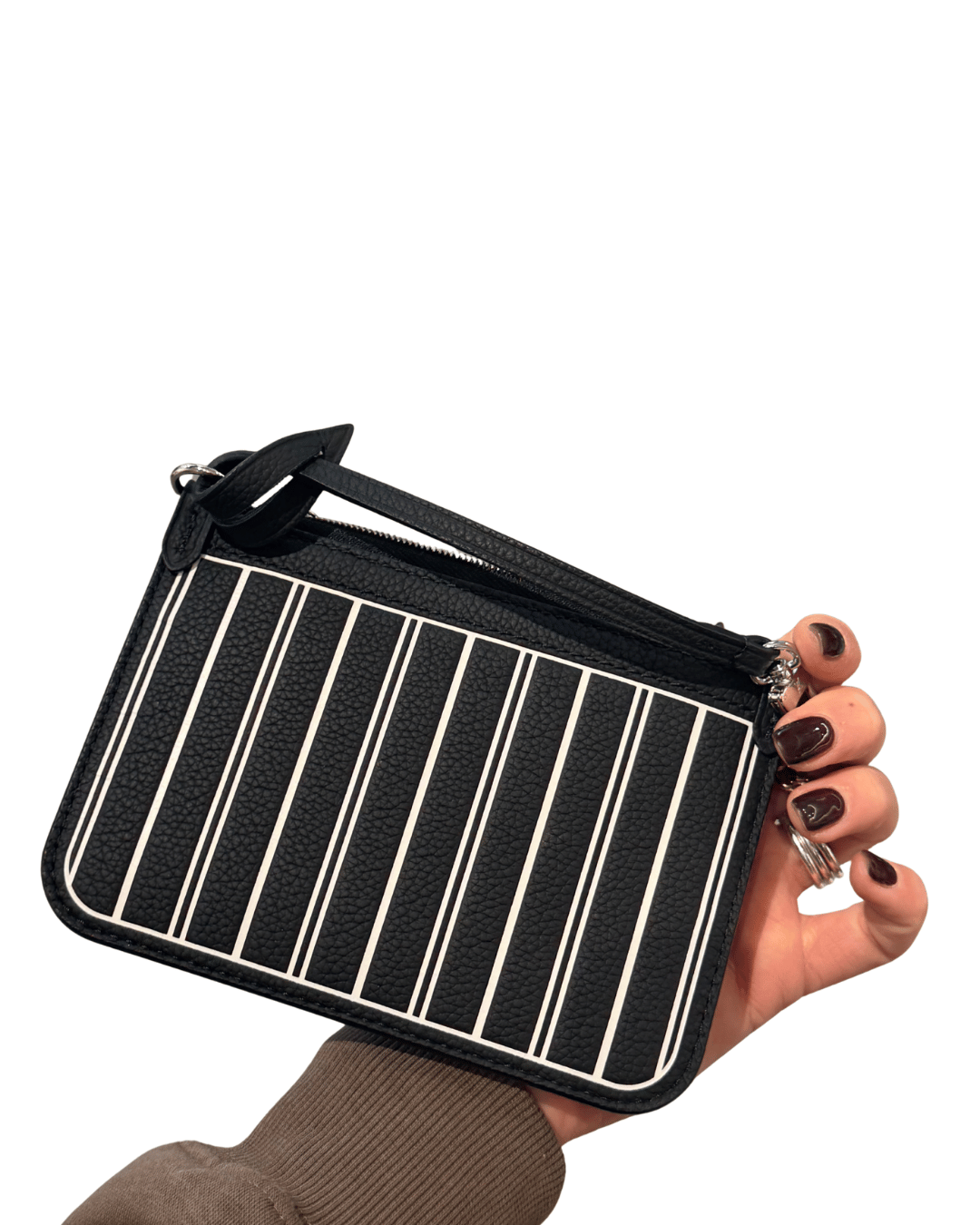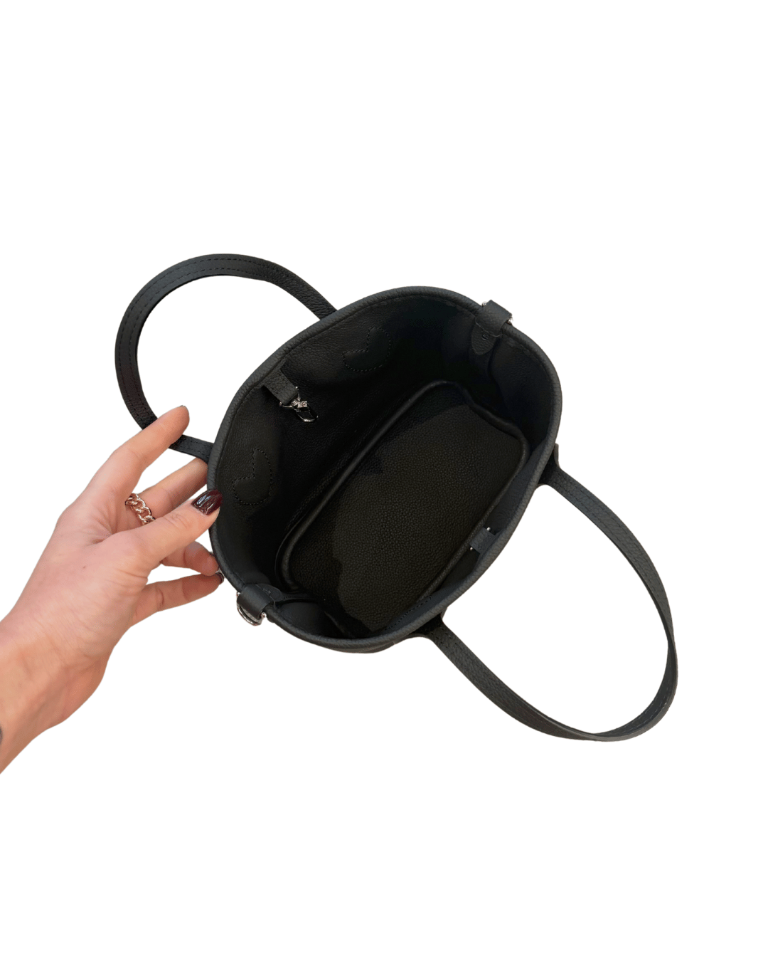 Compatta, contemporanea e incredibilmente versatile, la Neverfull Bandoulière Inside Out BB è una reinterpretazione audace di uno dei modelli più iconici della Maison. Parte della collezione LV Ski, nasce per essere indossata in due modi diversi, permettendo di scegliere ogni giorno quale anima mostrare. Da un lato la raffinata tela Monogram Eclipse, elegante e decisa, dall’altro la pelle martellata nera, essenziale e sofisticata: un vero gioco di stile “inside out” che rende questa borsa unica e riconoscibile. Il modello è completato da una pochette amovibile con zip, decorata dall’emblematica firma Louis Vuitton stampata, utilizzabile anche separatamente come mini accessorio. Le finiture metalliche color argento e la tracolla regolabile aggiungono funzionalità senza rinunciare all’eleganza. Non è acquistabile sul sito perché non disponibile. ( codice: non presente perché presente il microchip)
