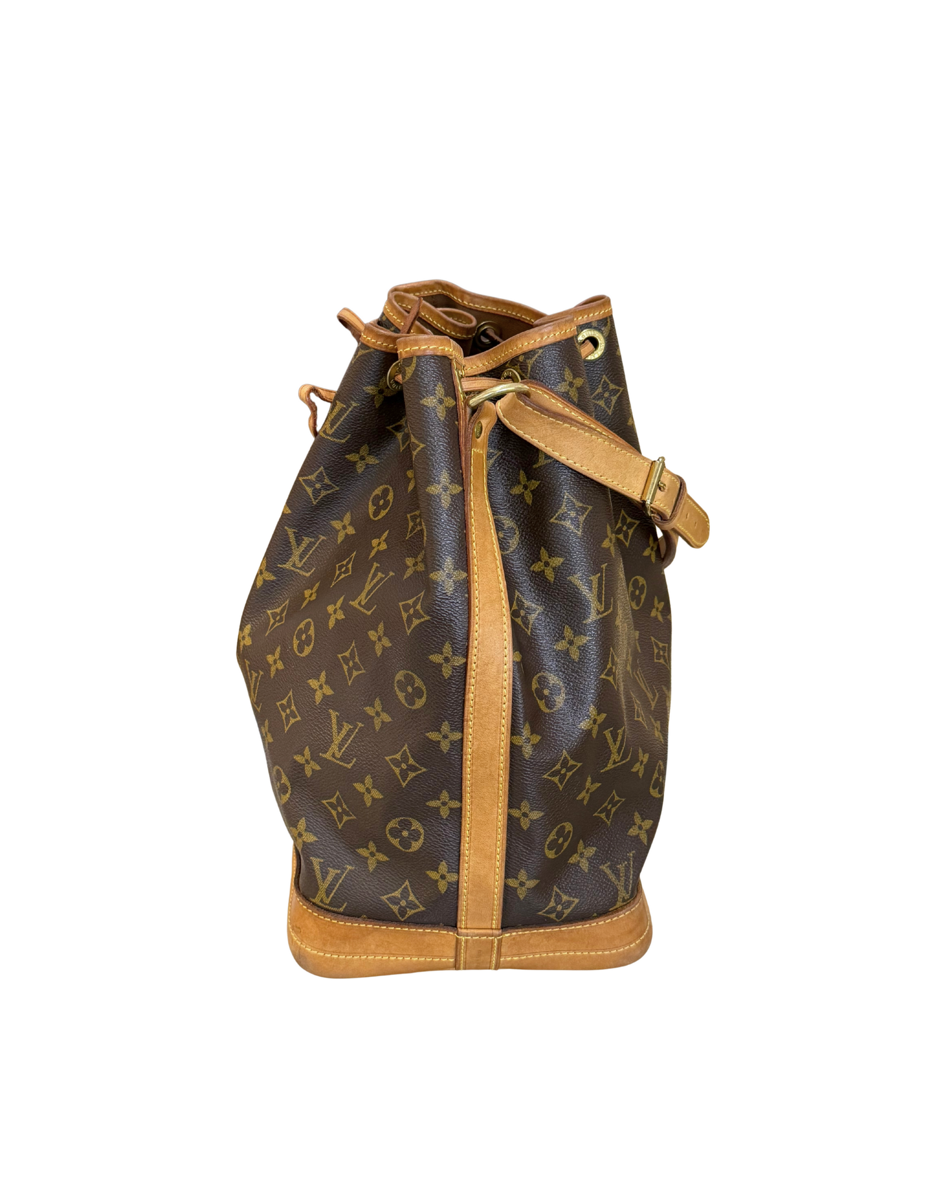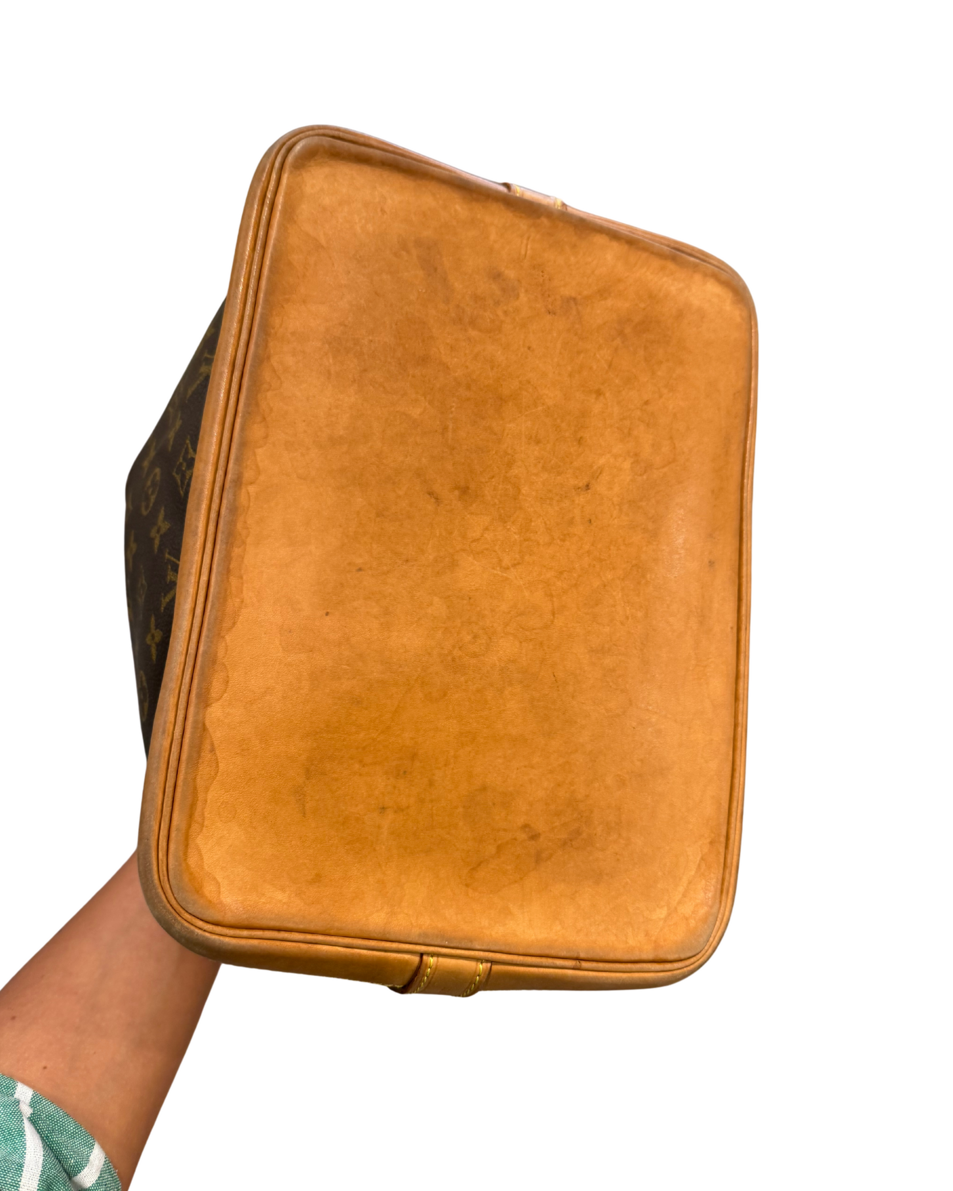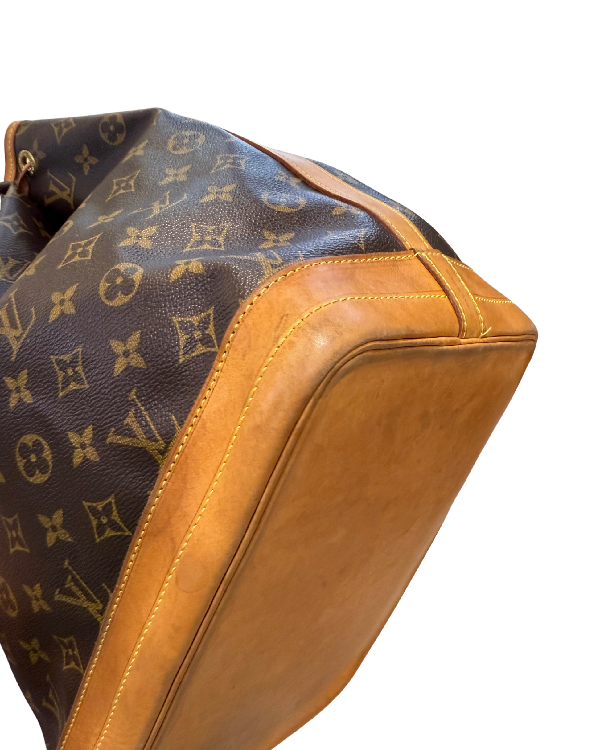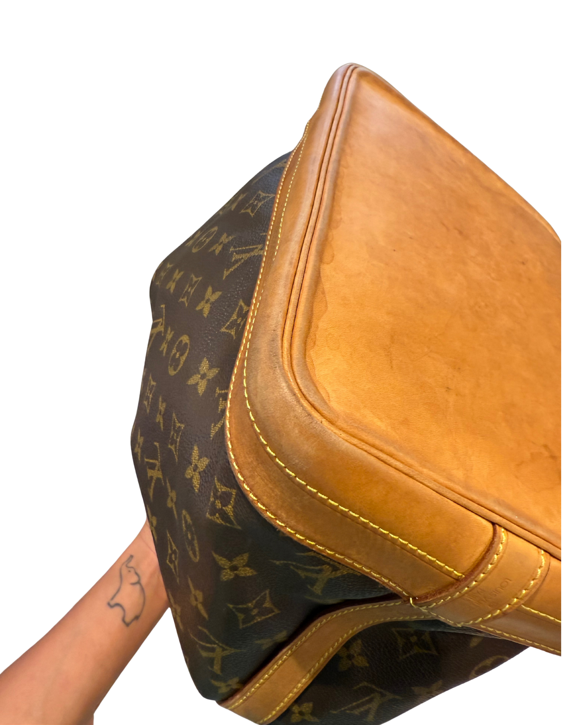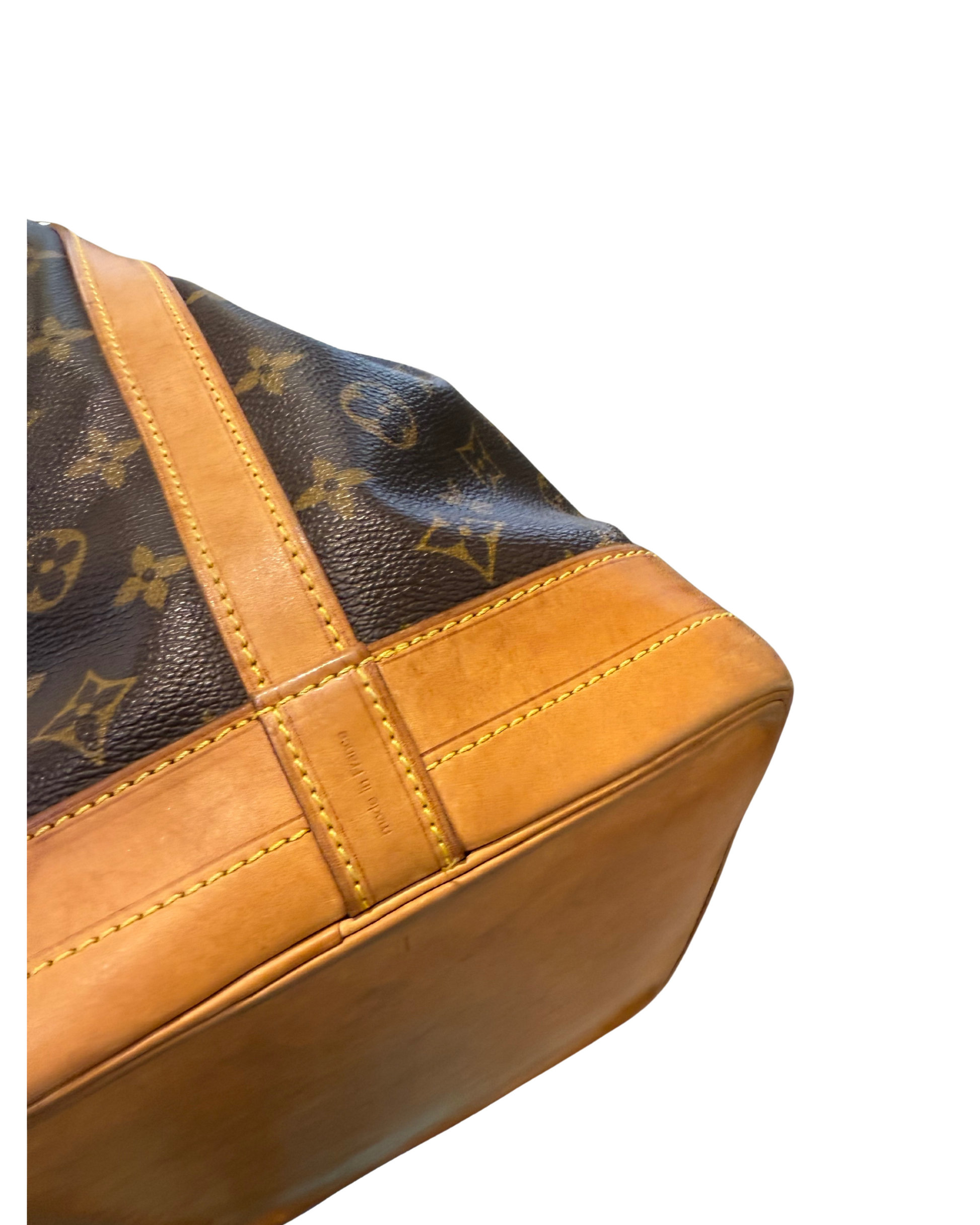 Noè GM vintage Louis Vuitton realizzato in tela monogram e rifiniture in vacchetta naturale. Base in pelle , tracolla regolabile. Apertura frontale con coulisse. Interno in tessuto marrone privo di scomparti interni (CODICE AR1011)