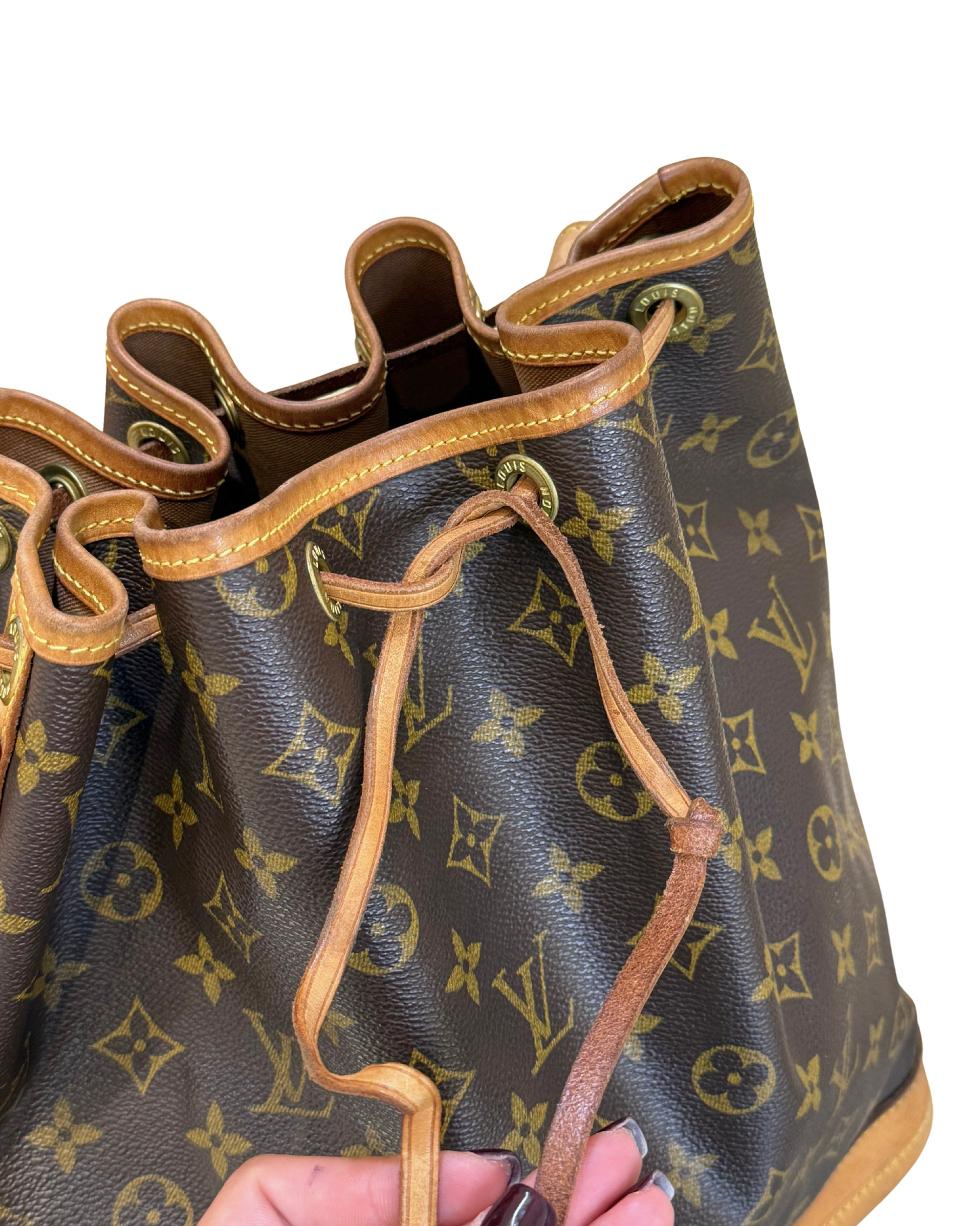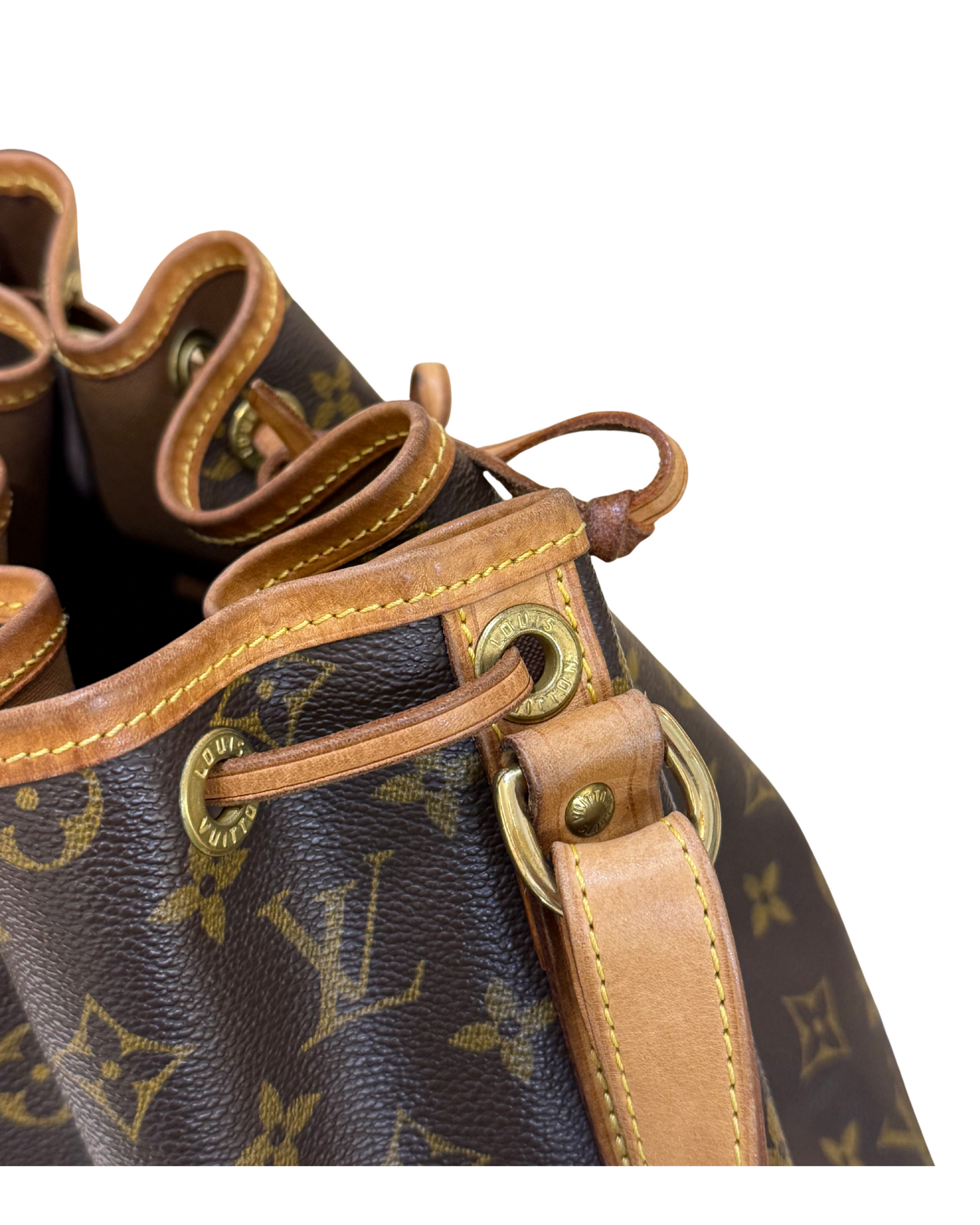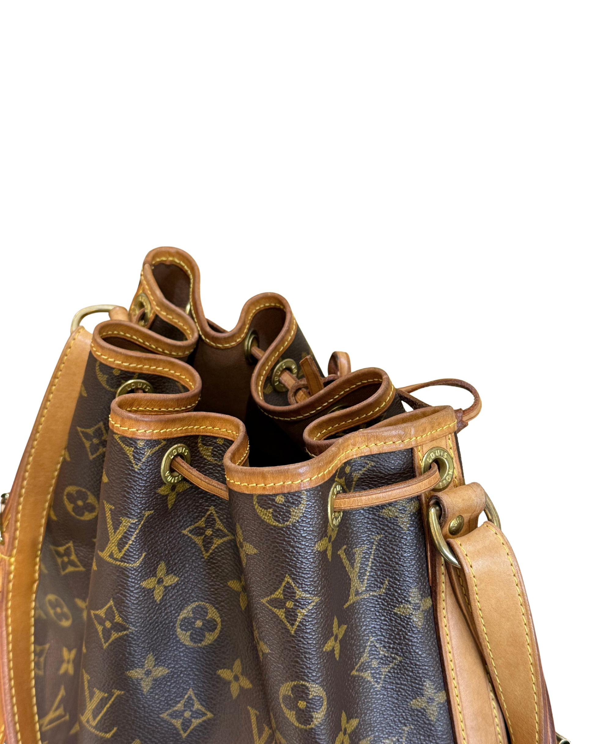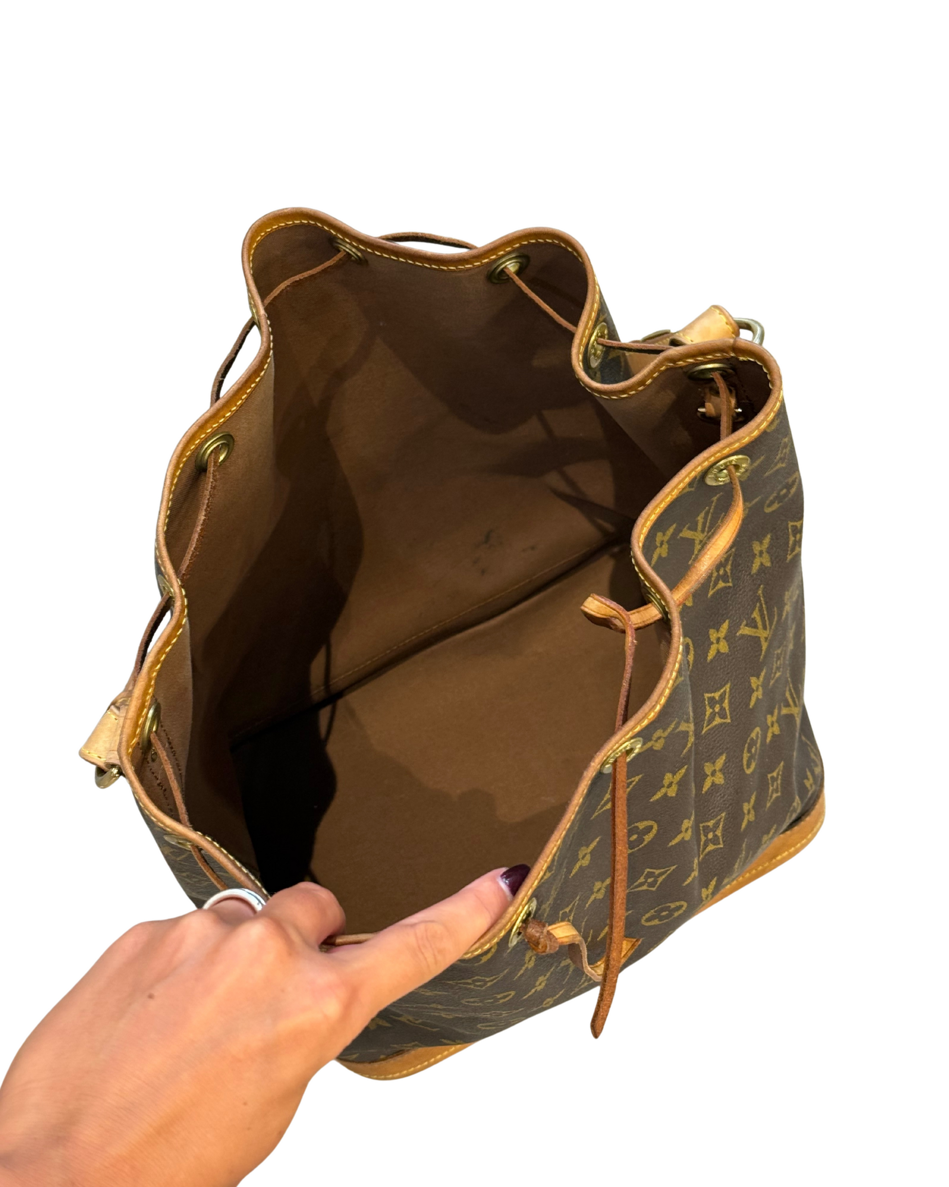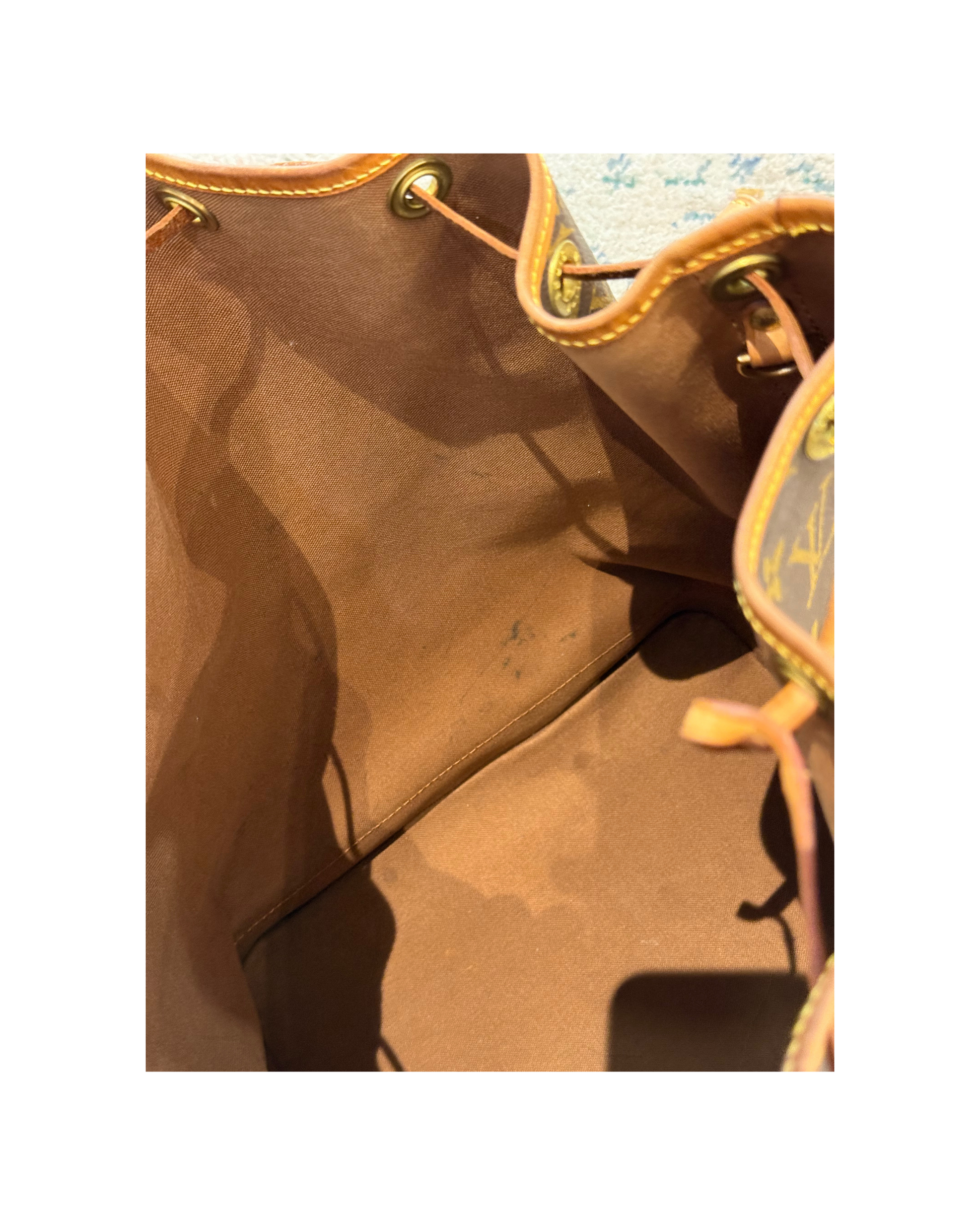 Noè GM vintage Louis Vuitton realizzato in tela monogram e rifiniture in vacchetta naturale. Base in pelle , tracolla regolabile. Apertura frontale con coulisse. Interno in tessuto marrone privo di scomparti interni (CODICE AR1011)