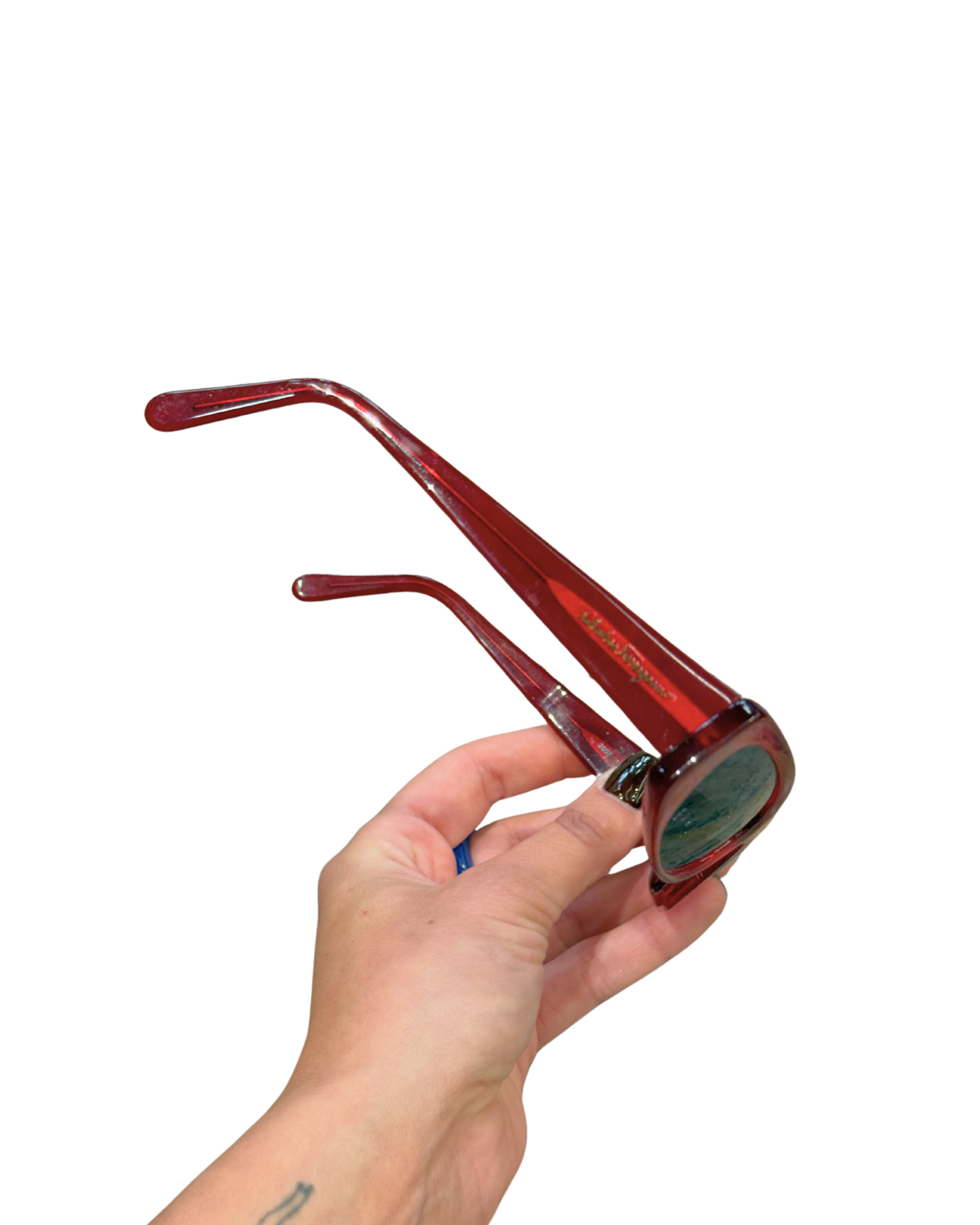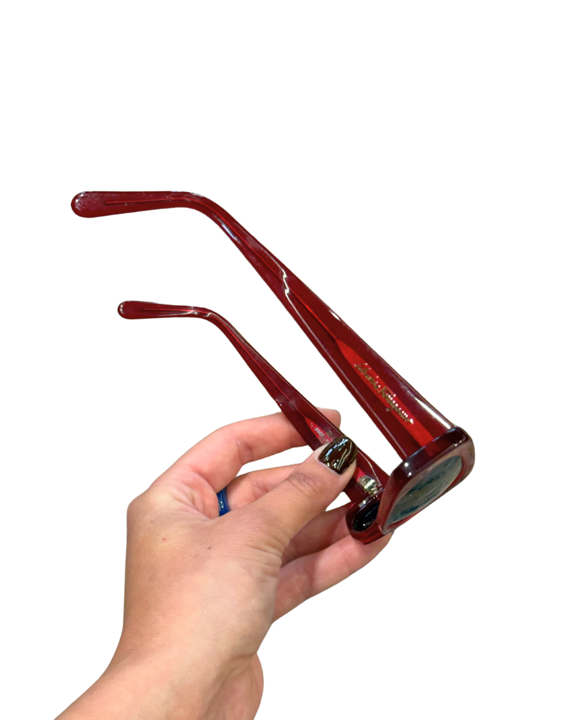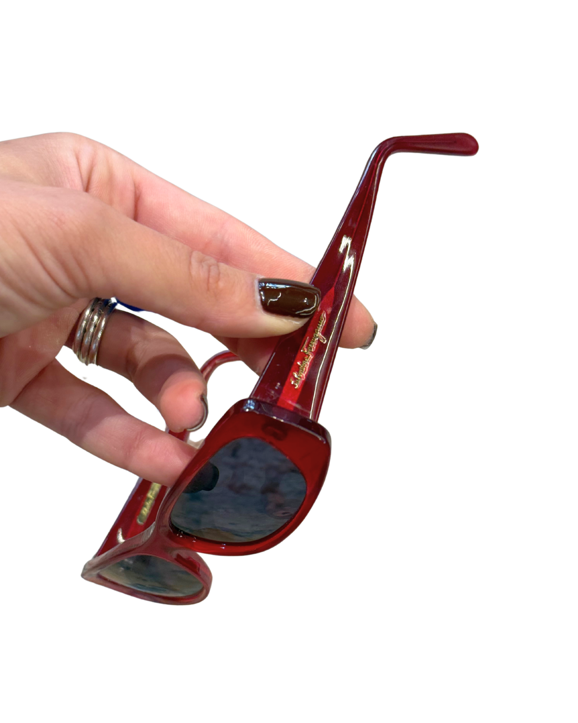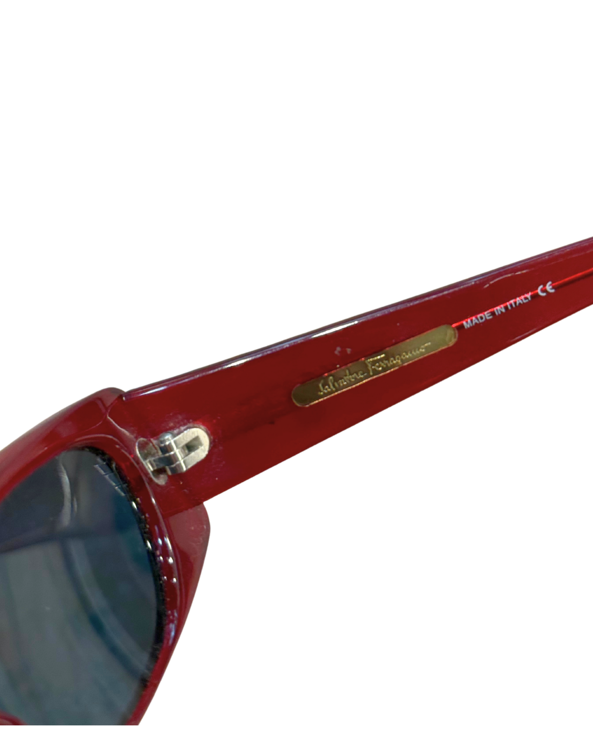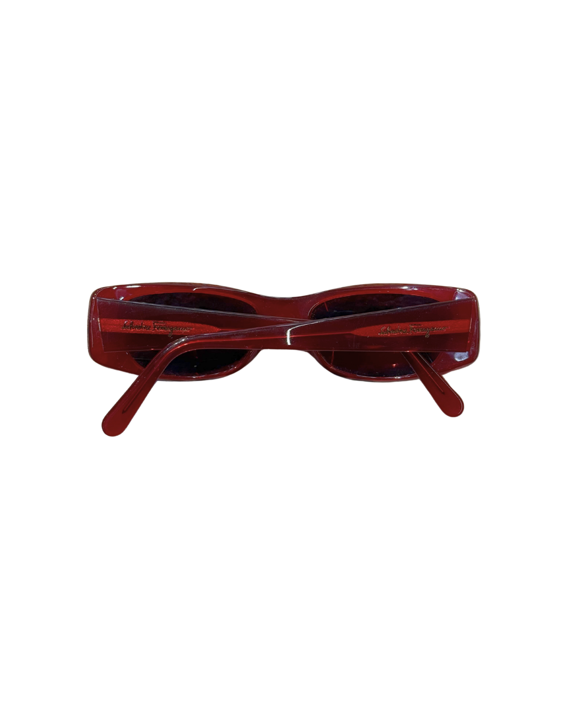 Occhiali da sole realizzati in acetato bordeaux di Salvatore Ferragamo. Forma rettangolare, perfetta per valorizzare i lineamenti. Lenti scure sfumate. Logo su entrambe le aste.