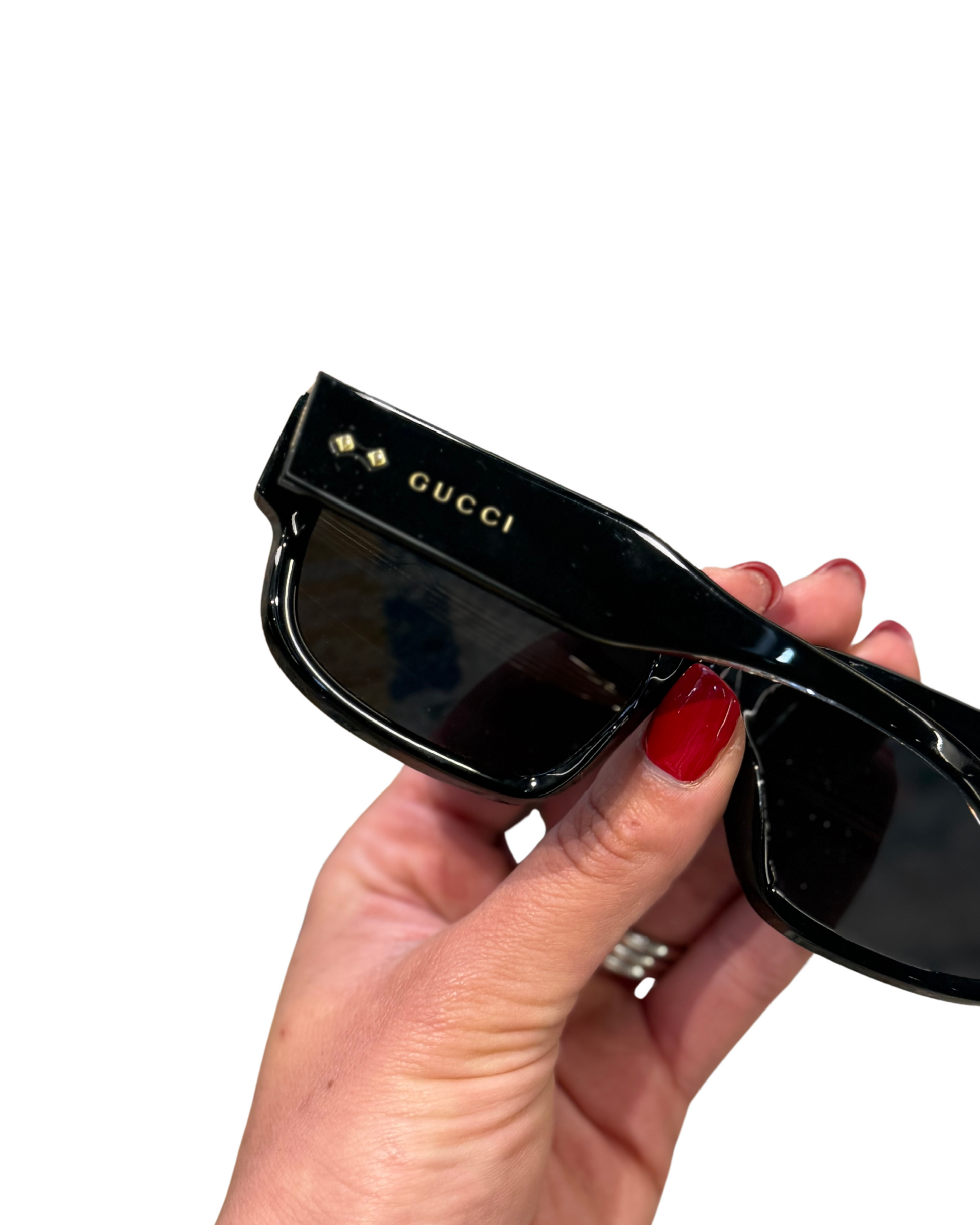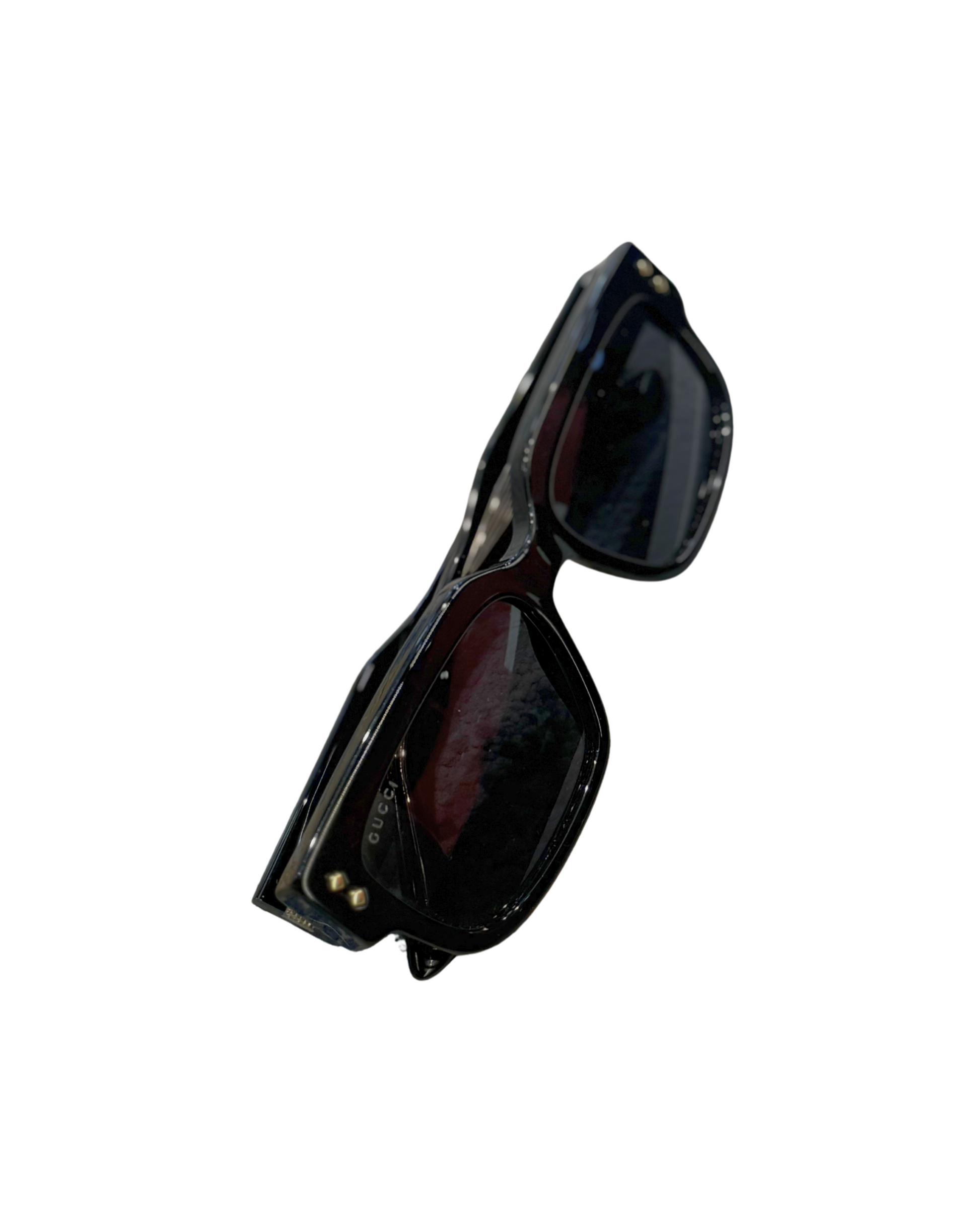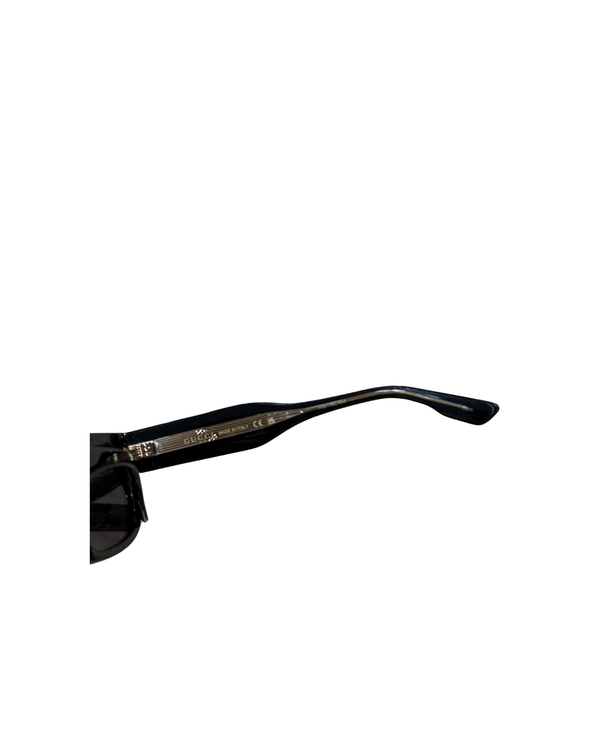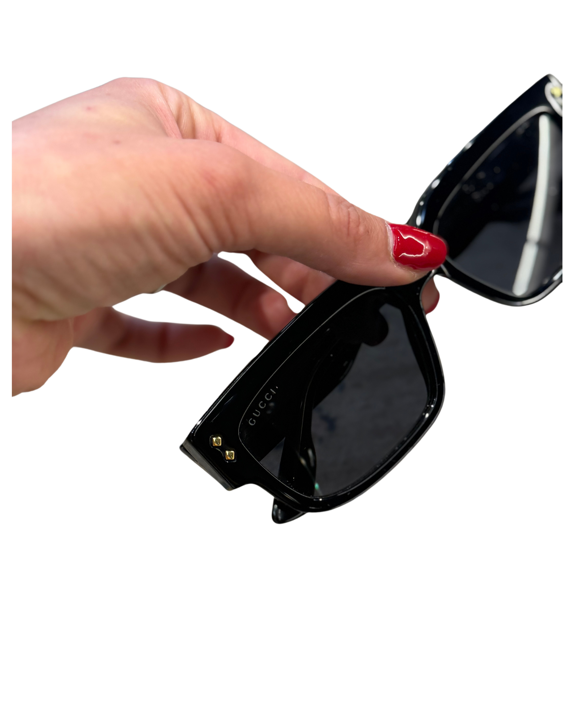 Questi occhiali di Gucci sono la perfetta combinazione tra eleganza e personalità. Realizzati in acetato nero lucido, presentano una montatura squadrata oversize con lenti scure e protezione UV. Il logo Gucci dorato è inciso su entrambe le aste, impreziosito da dettagli metallici iconici per il brand. Perfetti sia da uomo che da donna.